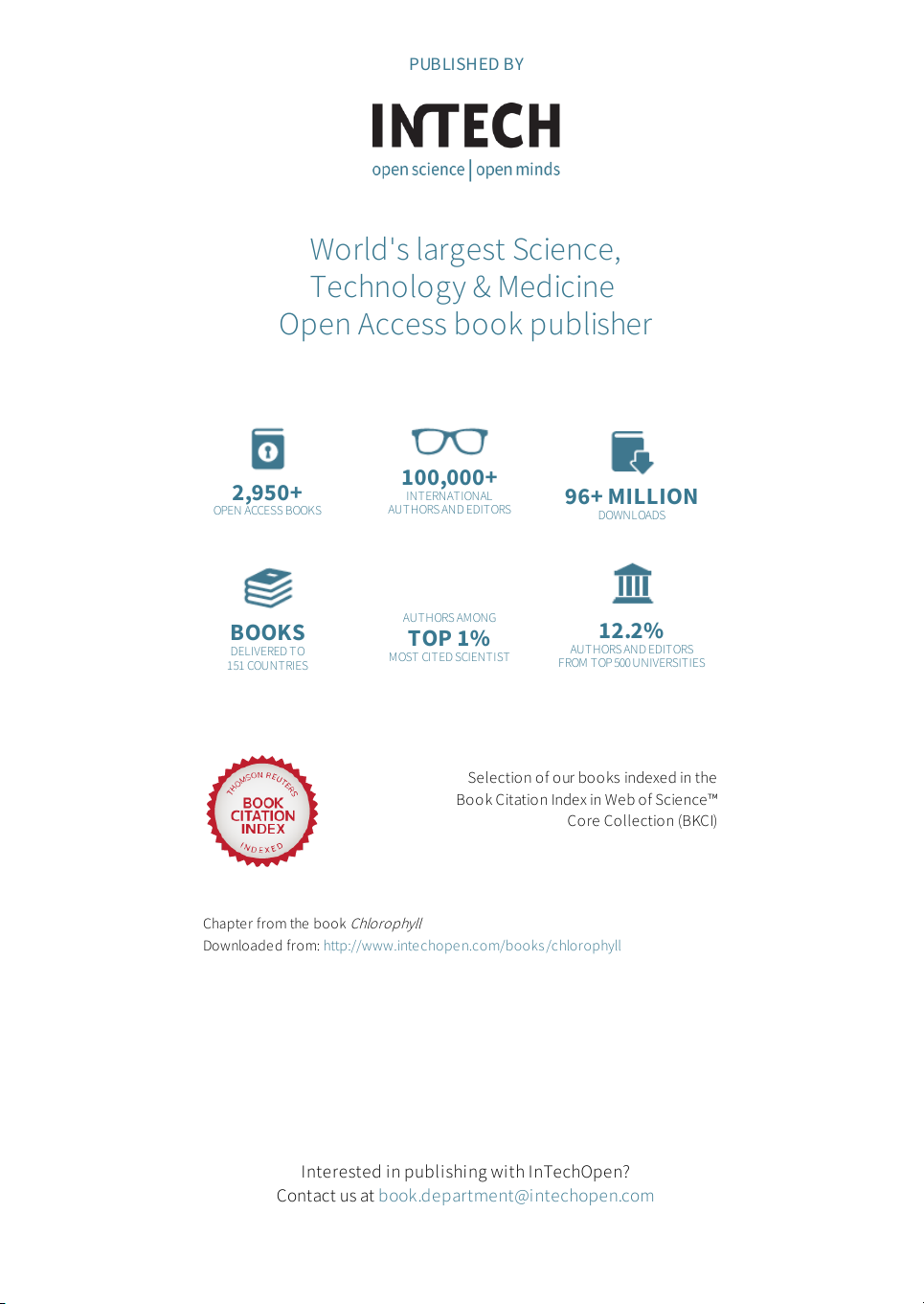 2,950+ OPEN ACCESS BOOKS 100,000+ INTERNATIONAL AUTHORS AND EDITORS 96+ MILLION DOWNLOADS BOOKS DELIVERED TO 151 COUNTRIES AUTHORS AMONG TOP 1% MOST CITED SCIENTIST 12.2% AUTHORS AND EDITORS FROM TOP 500 UNIVERSITIES Selection of our books indexed in the Book Citation Index in Web of Science™ Core Collection (BKCI) Chapter from the book Chlorophyll Downloaded from: http://www.intechopen.com/books/chlorophyll PUBLISHED BY World's largest Science, Technology & Medicine Open Access book publisher Interested in publishing with InTechOpen? Contact us at book.department@intechopen.com http://www.intechopen.com/books/chlorophyll mailto:book.department@intechopen.com Chapter 1 Introductory Chapter: Chlorophyll Molecules and Their Technological Relevance Maria Isabel Queiroz, Andrêssa Silva Fernandes, Mariany Costa Deprá, Eduardo Jacob-Lopes and Leila Queiroz Zepka Additional information is available at the end of the chapter http://dx.doi.org/10.5772/67953 Chlorophylls were the major tool used, long before science was able to recognize the existence of plants and animals; our predecessors identified this distinction and slowly provided technological evidence that chlorophyll was responsible for the green color of the plants. The name chlorophyll was proposed by Pierre Joseph Pelletier and Joseph Bienaimé Caventou in 1818 to designate the Green substance that could be extracted from the leaves with the aid of alcohol [1–3]. However, only about a century later, in 1911, the study of this interesting molecule gained more importance by Richard Willstätter, who obtained for the first‐time pure chlorophyll and established its correct molecular formula C55H70MgN4O6 [2]. A year later, Willstätter showed that chlorophyll obtained from a wide variety of sources was a mixture of two compounds, chlorophyll‐a and chlorophyll‐b, to which he assigned the correct molecular formula C55H70MgN4O5 and C55H70MgN4O6, respectively. Nevertheless, the detailed under‐ standing of the structures of these molecules was the result of the studies of Fischer and col‐ laborators, who were the first to delineate the structure of porphyrin ring [2–5]. These compounds are complex organic molecules formed by derivatives of porphyrin, a mac‐ rocyclic structure, asymmetric, totally unsaturated. Basically, chlorophyll molecules are conju‐ gated tetrapyrroles to which a cyclopentanone ring jointly with the third ring linked together by bridges methylene, with the central atom, magnesium (Figure 1). This structure also con‐ tains at the C‐17, a propionic acid chain esterified with the phytol, diterpene alcohol [3, 6–8]. Chlorophyll‐b differs from chlorophyll‐a by the presence of aldehyde residue instead of the methyl group at position 7. The synthesis of this compound is given by the oxidation of the methyl group to aldehyde [9, 10] through the enzyme oxygenase, which catalyzes this conversion [11]. © 2017 The Author(s). Licensee InTech. This chapter is distributed under the terms of the Creative Commons Attribution License (http://creativecommons.org/licenses/by/3.0), which permits unrestricted use, distribution, and reproduction in any medium, provided the original work is properly cited. Structurally, the chlorophyll molecules differ from each other, due to the degree of satura‐ tion of the pyrrolic rings. For example, chlorophyll‐c contains fully unsaturated phytopor‐ phyrin (double alloys C17–C18), whereas the other chlorophylls are C17–C18, phytochlorins (Figure 1). These differences in chlorophyll macrocycle saturation have profound consequences on the absorbance spectrum. For example, chlorophyll‐a, chlorophyll‐d, and chlorophyll‐f phytochlorins have approximately equal intensities of absorption in blue, red, and green. On the other hand, the phytoporphyrins of chlorophyll‐c absorb themselves weakly in red and more intensely around 450 nm [6, 12, 13]. The spectral differences of the chlorophyll molecules are reflected in the key in which bod‐ ies are present that the chlorophyll‐a appears more bluish green, chlorophyll‐b bright green, chlorophyll‐c yellowish green, chlorophyll d bright forest green, and chlorophyll‐f emerald green [6]. This diversity of shades of green makes these organisms potential source of natural colorants [14]. Figure 1. Structure of the side chain variables of chlorophyll molecules. Chlorophyll2 In addition, a chlorophyll molecule consists of two distinct parts: hydrophile, the macrocycle, and a hydrophobic part, phytol chain. The most hydrophilic segment of the macrocycle is the cyclopentanone ring and the propionic ester group (17 positions). The hydrophilic and hydro‐ phobic character directly influences the choice of solvent for extraction, which, from a quan‐ titative or qualitative point of view, is an extremely important aspect when it focuses on the technological relevance of chlorophyll molecules [15–17]. Given this scenario, analysis techniques such as liquid chromatography coupled to ultraviolet and mass spectrum allowed demonstrating that currently a total of five molecules, so‐called chlorophyll, have been found in nature. All of them occur in the cyanobacterium, which is cosmopolitan microalgae, prokaryotic, Gram negative, with metabolism preferentially photo‐ autotrophs, able to perform photosynthesis oxygen production, eukaryotic algae, and higher plants. These microorganisms demonstrate considerable biocatalytic potential in biotechno‐ logical processes due to their robustness and require nutritional simplicity [18]. Chlorophyll‐a is present in all organisms that perform photosynthesis and chlorophyll‐b oxygen (Figure 1), which are the most abundant pigment in green algae, is found in higher plants in nature, and other similar structures are used as accessory pigments in photosynthetic process, called chlo‐ rophyll‐c, chlorophyll‐d, chlorophyll‐e, and chlorophyll‐f [6–8, 13]. These specific pigmen