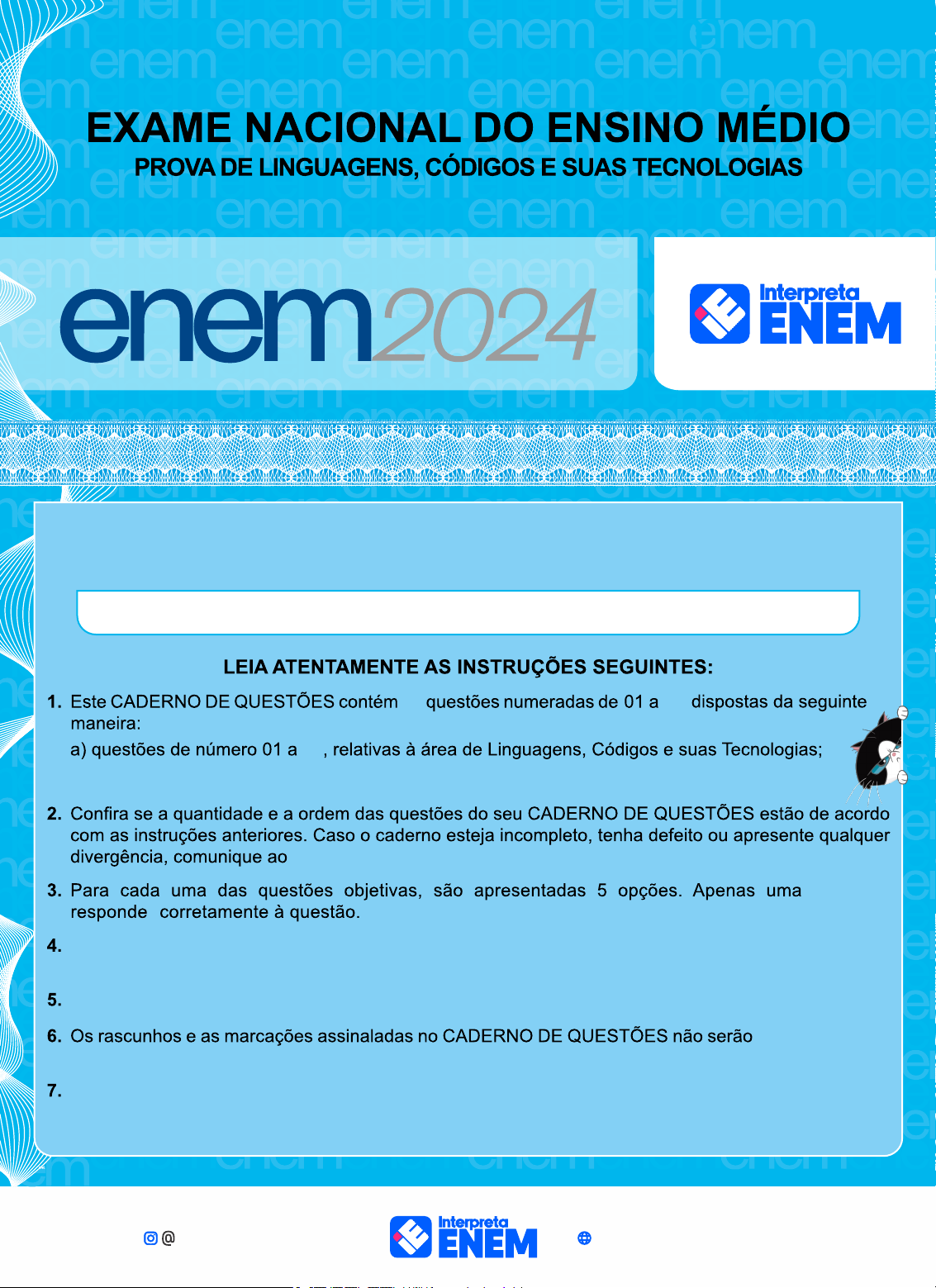 Segura na mão do psicólogo! SIMULADO O tempo sugerido para esta prove é de uma hora (1h), estendendo no máximo a uma hora e trinta minutos (1h30). ATENÇÃO: não precisa transcrever frase nenhuma, mas a gente manteve para ficar igual ao ENEM: b) gabarito das questões, que você NÃO DEVE ESPIAR ANTES... o Psi está de olho! 30 30 30 prof. Lauro. Faça dentro do tempo, pois isso é fundamental para o seu treinamento. vistos por ninguém, então pode rabiscar à vontade. Quando terminar as provas, vá descansar, pois você merece! delas interpretaenem.com.brlaurointerpretaenem LINGUAGENS, CÓDIGO E SUAS TECNOLOGIAS Questões de 01 a 30 QUESTÃO 01 QUESTÃO 02 com deus mi deito com deus mi levanto comigo eu calo comigo eu canto eu bato um papo eu bato um ponto eu tomo um drink eu fico tonto. CHACAL. Drops de abril. São Paulo: Brasiliense, 1983. p.63. (Cantadas literárias, 16) No poema, Chacal faz referência a uma popular oração no primeiro verso, alterando a grafia do pronome “me” para uma forma que reproduz a oralidade característica da linguagem coloquial. Essa característica também pode ser percebida no(a) uso de gírias e expressões cotidianas. ausência de vírgulas em todo o poema. repetição de palavras. preferência por estrangeirismos. uso inadequado de minúsculas. QUESTÃO 03 Nessa charge, o autor contextualiza o momento de violência nas discussões polí t icas no Brasi l , mobilizando como recurso linguístico para a promoção de humor a SIMULADO SIMULADO 2 polissemia do verbo “debater”. vulgarização do significado do termo “debates”. semelhança entre os verbos “debater” e “bater”. oposição entre o debate pacífico e a ação violenta. crítica implícita ao comportamento dos usuários na internet. Disponível em: https://blogdoaftm.com.br/charge-violencia/ Eu faço versos como quem chora De desalento...de desencanto Fecha o meu livro, se por agora Não tens motivo nenhum de pranto. Meu verso é sangue. Volúpia ardente... Tristeza esparsa...remorso vão... Dói-me nas veias. Amargo e quente, Cai, gota a gota, do coração. E nestes versos de angústia rouca, Assim dos lábios a vida corre, Deixando um acre sabor na boca. Eu faço versos como quem morre BANDEIRA, Manuel. A cinza das horas, Carnaval e O ritmo dissoluto. Rio de Janeiro, Nova Fronteira, 1994. As funções da linguagem são determinadas a partir da predominância do foco da mensagem em um ou mais elementos de comunicação em um texto. No poema Desencanto, de Manuel Bandeira, destacam-se as funções emotiva e fática, já que o sentimento do eu-lírico é marcado por hesitações na tentativa de expressão. emotiva e metalinguística, pela expressão do sentimento do eu-lírico na elaboração dos próprios versos. poética e referencial, uma vez que ocorrem referências a outros poemas na comparação da elaboração do poema. metalinguística e poética, pois o texto se constitui em um poema que faz autorreferência à má qualidade dos versos. emotiva e conativa, com alternância do foco entre o sentimento do eu-lírico e a referência a um interlocutor subentendido. Desencanto QUESTÃO 04 Disponível em: https://www.fabulasdeesopo.com.br/p/a-lebre-e-tartaruga.html Fábulas são gêneros narrativos, geralmente curtos, que apresentam animais personificados como personagens. Pela leitura dos textos, percebe-se que outra característica frequente das fábulas é a estrutura linear da narração, com início, clímax e desfecho. o sentido conotativo das palavras, em uma construção alegórica. o vocabulário pouco rebuscado, adequado a um público-alvo infantil. a apresentação de uma moral, de caráter pedagógico, no final do texto. o uso de discursos diretos para representação das interações entre as personagens. SIMULADO SIMULADO 3 TEXTO I Uma lebre estava um dia zombando de uma tartaruga por andar tão lenta. Disse a tartaruga: – "Espera um pouco, vamos fazer uma corrida, aposto que vou ganhar." Respondeu a lebre que se divertiu com a ideia: – "Oh, vamos tentar e ver." Logo ficou acertado que a raposa deveria definir um percurso e ser o juiz da corrida. Quando chegou a hora, ambos começaram juntos, mas a lebre estava tão adiantada que ela pensou que merecia ter um descanso, então deitou-se e adormeceu rapidamente. Enquanto isso, a tartaruga continuava a andar, com o tempo, alcançou o objetivo. Finalmente, a lebre acordou para a partida e correu o mais rápido que pôde, mas apenas para descobrir que a tartaruga já tinha ganho a corrida. Moral da histór ia: Se você for paciente e disciplinado, conquistará o objetivo. QUESTÃO 05 A Lebre e a Tartaruga Disponível em: https://www.fabulasdeesopo.com.br/p/a-aguia-e-raposa.html TEXTO II Uma águia e uma raposa se tornaram grandes amigas e decidiram a viver uma perto da outra, elas pensavam que quanto mais viam uma à outra, melhores amigas seriam. Assim, a águia construiu um ninho no topo de uma árvore alta, enquanto a raposa se estabeleceu em uma mata ao pé dela e produziu uma ninhada de filhotes. Um dia a raposa saiu em busca de alimento, a águia que também queria alimento para seus filhotes, voou para a mata, pegou os filhotes da raposa e as levou para a árvore para uma refeição para ela e sua família. Quando a raposa voltou, descobriu o que havia acontecido, ela não estava tão triste pela perda de seus filhotes, mas furiosa porque não conseguia chegar até a águia e pagá-la por sua traição. Então, ela se sentou não muito longe e a amaldiçoou. Mas não demorou muito para ela ter sua vingança. Alguns aldeões estavam sacrificando uma cabra em um altar vizinho e a águia voou e carregou um pedaço de carne queimada até seu ninho. Houve um vento forte soprando, o ninho pegou fogo, como resultado os seus filhotes caíram meio queimados no chão. Então a Raposa correu para o local e os devorou em plena vista da águia. Moral da história: A traição pode escapar do castigo humano, mas 