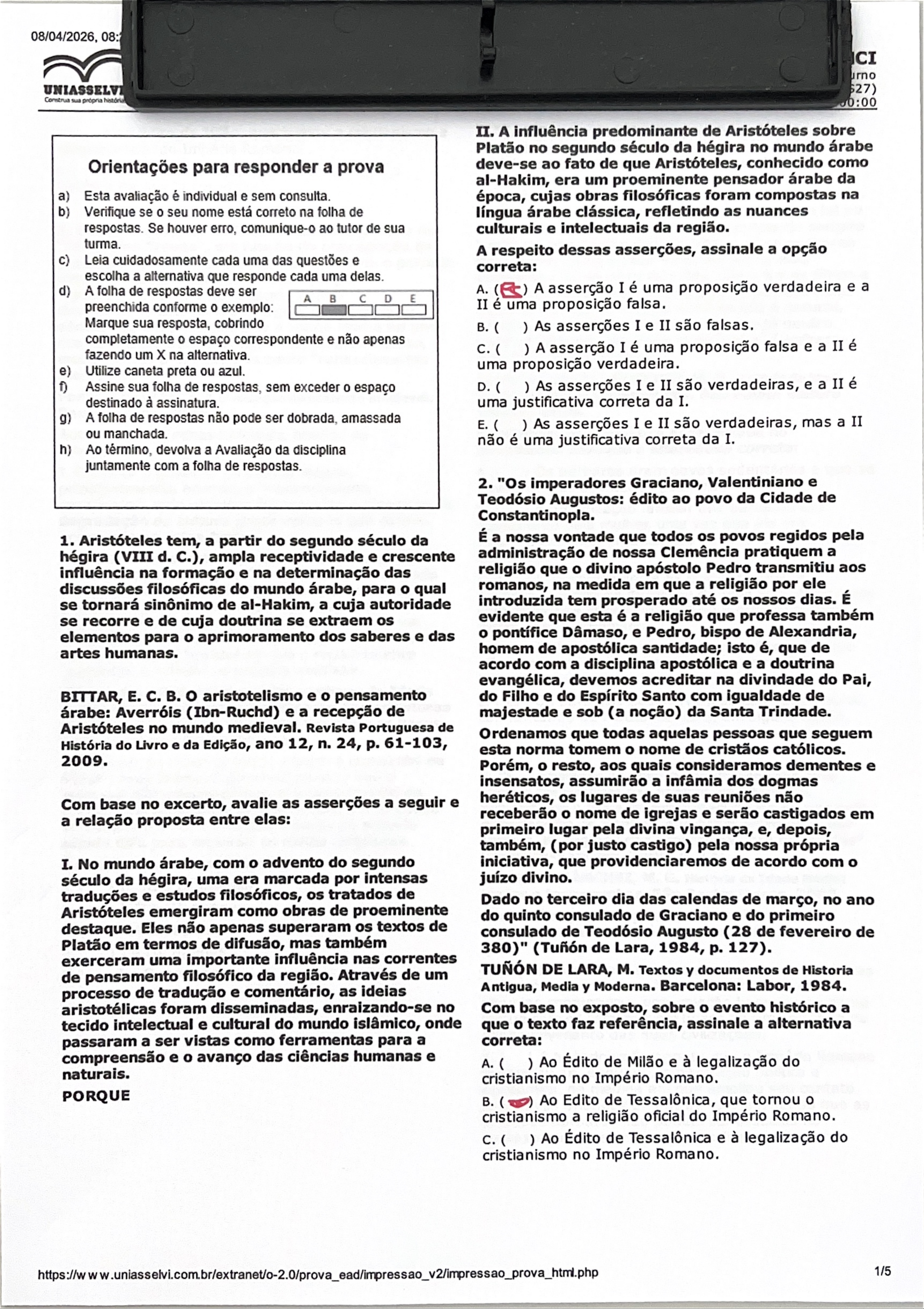 08/04/2026, 08: CI UNIASSELVI Construa sua própria história 0:00 II. A influência predominante de Aristóteles sobre Platão no segundo século da hégira no mundo árabe Orientações para responder a prova deve-se ao fato de que Aristóteles, conhecido como al-Hakim, era um proeminente pensador árabe da a) Esta avaliação é individual e sem consulta. época, cujas obras filosóficas foram compostas na b) Verifique se seu nome está correto na folha de língua árabe clássica, refletindo as nuances respostas. Se houver erro, comunique-o ao tutor de sua culturais e intelectuais da região. turma. A respeito dessas asserções, assinale a opção c) Leia cuidadosamente cada uma das questões e correta: escolha a alternativa que responde cada uma delas. d) A folha de respostas deve ser A. A asserção I é uma proposição verdadeira e a A B D E preenchida conforme 0 exemplo: II é uma proposição falsa. Marque sua resposta, cobrindo B. ( ) As asserções I e II são completamente 0 espaço correspondente e não apenas fazendo um X na C.( ) A asserção uma proposição falsa e a II é e) Utilize caneta preta ou azul. uma proposição verdadeira. f) Assine sua folha de respostas, sem exceder 0 espaço D. ) As asserções I e II são verdadeiras, e a II é destinado à assinatura. uma justificativa correta da I. g) A folha de respostas não pode ser dobrada, amassada ) As asserções I e II são verdadeiras, mas a II ou manchada. não é uma justificativa correta da I. h) Ao término, devolva a Avaliação da disciplina juntamente com a folha de respostas. 2. "Os imperadores Graciano, Valentiniano e Teodósio Augustos: édito ao povo da Cidade de Constantinopla. 1. Aristóteles tem, a partir do segundo século da É a nossa vontade que todos os povos regidos pela hégira (VIII d. C.), ampla receptividade e crescente administração de nossa Clemência pratiquem a influência na formação e na determinação das religião que divino apóstolo Pedro transmitiu aos discussões filosóficas do mundo árabe, para o qual romanos, na medida em que a religião por ele se tornará sinônimo de al-Hakim, a cuja autoridade introduzida tem prosperado até os nossos dias. É se recorre e de cuja doutrina se extraem os evidente que esta é a religião que professa também elementos para aprimoramento dos saberes e das pontífice Dâmaso, e Pedro, bispo de Alexandria, artes humanas. homem de apostólica santidade; isto é, que de acordo com a disciplina apostólica e a doutrina evangélica, devemos acreditar na divindade do Pai, BITTAR, E. C. aristotelismo e pensamento do Filho e do Espírito Santo com igualdade de árabe: Averróis (Ibn-Ruchd) e a recepção de majestade e sob (a noção) da Santa Trindade. Aristóteles no mundo medieval. Revista Portuguesa de Ordenamos que todas aquelas pessoas que seguem História do Livro e da Edição, ano 12, n. 24, 61-103, esta norma tomem nome de cristãos católicos. 2009. Porém, resto, aos quais consideramos dementes e insensatos, assumirão a infâmia dos dogmas Com base no excerto, avalie as asserções a seguir e heréticos, os lugares de suas reuniões não a relação proposta entre elas: receberão nome de igrejas e serão castigados em primeiro lugar pela divina vingança, e, depois, também, (por justo castigo) pela nossa própria I. No mundo árabe, com o advento do segundo iniciativa, que providenciaremos de acordo com o século da hégira, uma era marcada por intensas juízo divino. traduções e estudos filosóficos, os tratados de Dado no terceiro dia das calendas de março, no ano Aristóteles emergiram como obras de proeminente do quinto consulado de Graciano e do primeiro destaque. Eles não apenas superaram os textos de consulado de Teodósio Augusto (28 de fevereiro de Platão em termos de difusão, mas também 380)" (Tuñón de Lara, 1984, 127). exerceram uma importante influência nas correntes de pensamento filosófico da região. Através de um TUÑÓN DE LARA, Textos y documentos de Historia processo de tradução e comentário, as ideias Antigua, Media y Moderna. Barcelona: Labor, 1984. aristotélicas foram disseminadas, enraizando-se no Com base no exposto, sobre o evento histórico a tecido intelectual e cultural do mundo islâmico, onde que texto faz referência, assinale a alternativa passaram a ser vistas como ferramentas para a correta: compreensão e o avanço das ciências humanas e A. ( ) Ao Édito de Milão e à legalização do naturais. cristianismo no Império PORQUE B. ( Ao Edito de Tessalônica, que tornou o cristianismo a religião oficial do Império Romano. C. Ao Édito de Tessalônica e à legalização do cristianismo no Império Romano. 1/508/04/2026, 08:22 UNIASSELVI Construa sua própria D. ) Ao Edito de Milão, que tornou o cristianismo a 4. o povo dos Hunos, pouco conhecido pelos religião oficial do Império Romano. antigos monumentos, vivendo por trás da lagoa E. ) Ao Édito de Milão, que separou a Igreja Meótis, perto do oceano Glacial, excede todos os Católica da Igreja Ortodoxa. modos de ferocidade [...]. Ninguém entre eles lavra a terra ou toca um arado. Todos vivem sem um lugar fixo, sem lar nem lei ou 3. Durante séculos, a Idade Média foi chamada de uma forma de vida estabilizada, parecendo sempre "Idade das Trevas", em função da propagação de fugitivos nos carros onde habitam; aí as mulheres preconceitos renascentistas, que definiam o período lhes tecem as horríveis vestimentas, aí elas medieval como uma época marcada pela coabitam com os seus maridos, dão à luz os filhos e "ignorância da fé". No entanto, com o criam as crianças até à puberdade. Nenhum deles desenvolvimento da historiografia medieval no se for interrogado poderá dizer donde é natural, século XX, descobrimos que a Idade Média foi uma porque, concebido num lugar, nasceu já noutro era de muitos avanços, nas mais diversas áreas, ponto e foi educado ainda mais longe" (Pedrero- muitos deles denominados co