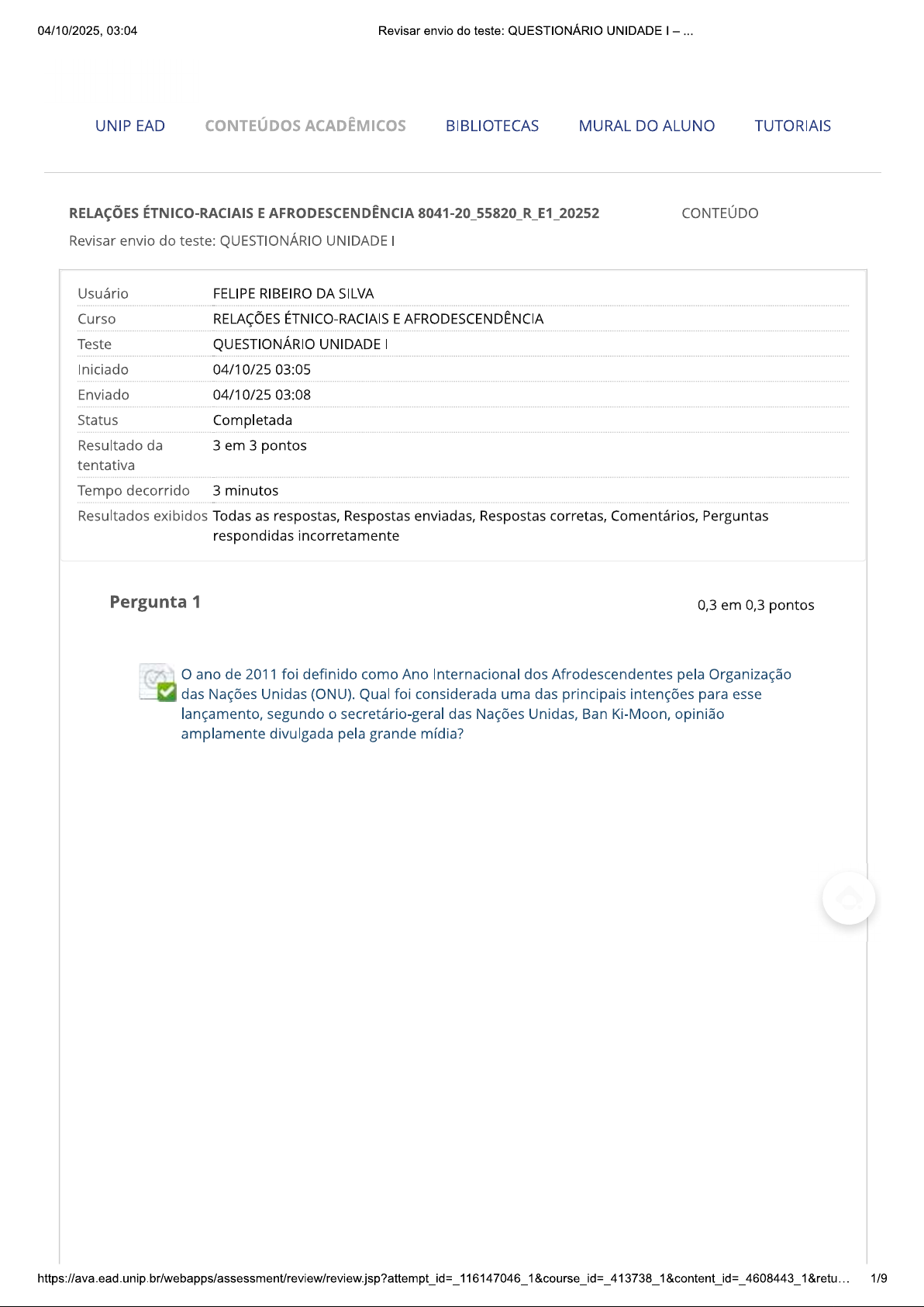 04/10/2025, 03:04 Revisar envio do teste: QUESTIONÁRIO UNIDADE UNIP EAD CONTEÚDOS ACADÊMICOS BIBLIOTECAS MURAL DO ALUNO TUTORIAIS RELAÇÕES ÉTNICO-RACIAIS E AFRODESCENDÊNCIA 8041-20_55820_R_E1_20252 CONTEÚDO Revisar envio do teste: QUESTIONÁRIO UNIDADE I Usuário FELIPE RIBEIRO DA SILVA Curso RELAÇÕES ÉTNICO-RACIAIS E AFRODESCENDÊNCIA Teste QUESTIONÁRIO UNIDADE Iniciado 04/10/25 03:05 Enviado 04/10/25 03:08 Status Completada Resultado da 3 em 3 pontos tentativa Tempo decorrido 3 minutos Resultados exibidos Todas as respostas, Respostas enviadas, Respostas corretas, Comentários, Perguntas respondidas incorretamente Pergunta 1 0,3 em 0,3 pontos ano de 2011 foi definido como Ano Internacional dos Afrodescendentes pela Organização das Nações Unidas (ONU). Qual foi considerada uma das principais intenções para esse lançamento, segundo secretário-geral das Nações Unidas, Ban Ki-Moon, opinião amplamente divulgada pela grande mídia? 1/904/10/2025, 03:04 Revisar envio do teste: QUESTIONÁRIO UNIDADE Resposta b. Selecionada: Despertar, na comunidade internacional, interesse em ampliar os direitos fundamentais aos afrodescendentes. Respostas: Desconstruir mito da democracia racial no Brasil. a. b. Despertar, na comunidade internacional, interesse em ampliar os direitos fundamentais aos afrodescendentes. Combater toda forma de apartheid nos países africanos. d. Promover um debate entre os países desenvolvidos sobre as diversas formas de racismo presentes nas relações sociais. e. Fazer um levantamento estatístico em âmbito mundial sobre a condição social e econômica dos afrodescendentes. Comentário da Resposta: Alternativa resposta: Comentário: interesse da ONU nesse tipo de iniciativa é ampliar acesso da população afrodescendente aos direitos fundamentais, como saúde, educação, moradia, saneamento, isonomia salarial etc., direitos esses que, muitas vezes, lhes são sistematicamente negados em qualquer país do mundo. Pergunta 2 0,3 em 0,3 pontos Todas as afirmações abaixo apresentam justificativas que explicam por que termo "raça" não pode ser compreendido segundo uma perspectiva biológica, exceto: Resposta d. Selecionada: Todas as raças humanas devem ser respeitadas e merecem tratamento específico da lei. Respostas: a. Segundo os estudos mais recentes da genética, não existem raças somos uma única raça humana. b. A explicação dada pela biologia para o termo "raça" faz parte das concepções construídas pelo chamado "racismo científico" durante o século XIX. Não se pode atribuir características determinadas pela natureza a aspectos que são resultados de um processo cultural. d. Todas as raças humanas devem ser respeitadas e merecem tratamento específico da lei. e. A perspectiva racialista pressupõe uma hierarquização entre as diferentes raças, que é inconcebível para qualquer área do conhecimento. 2/904/10/2025, 03:04 Revisar envio do teste: QUESTIONÁRIO UNIDADE I Comentário da Resposta: Alternativa D resposta: Comentário: Se estamos afirmando que as raças humanas não existem, a afirmação contida na alternativa "d" apresenta uma contradição, visto que somos uma única raça humana. Pergunta 3 0,3 em 0,3 pontos Com relação à abordagem do termo "raça" sob uma perspectiva política, podemos dizer que: Resposta a. Selecionada: Trata-se do uso que a comunidade militante afrodescendente faz desse termo na luta por seus direitos e contra toda forma de discriminação e racismo. Respostas: a. Trata-se do uso que a comunidade militante afrodescendente faz desse termo na luta por seus direitos e contra toda forma de discriminação e racismo. b. Diz respeito aos aspectos físicos, à aparência exterior herdada e transmitida hereditariamente pelos grupos sociais. Diz respeito às cotas separadas para os afrodescendentes, a partir da aprovação do Estatuto da Igualdade Racial no Brasil. d. Segundo que estudamos em nossa disciplina, não podemos utilizar termo "raça" em hipótese alguma, pois raças humanas não existem. e. Quando utilizamos termo "raça", estamos sendo racistas. Comentário da Resposta: Alternativa A resposta: Comentário: A abordagem política do termo "raça" enfatiza as circunstâncias em que tal conceito é utilizado, se positiva ou negativamente, daí o uso político do termo pelo movimento negro para definir os anseios e as lutas dos negros na sociedade brasileira. Pergunta 4 0,3 em 0,3 pontos As afirmações abaixo apresentam definições adequadas para termo "etnia", exceto: Resposta e. Selecionada: Agrupamento de pessoas ou de um setor da população, com aspectos físicos comuns. 3/904/10/2025, 03:04 Revisar envio do teste: QUESTIONÁRIO UNIDADE Respostas: a. As relações sociais entre sujeitos que consideram ter uma origem comum em contraste com grupos diferentes dentro de uma sociedade abrangente. b. Um grupo possuidor de algum grau de coerência e solidariedade, composto por pessoas conscientes, pelo menos em forma latente, de terem origens e interesses comuns. C. Carrega conteúdos significativos definidos pelo sujeito a partir de suas experiências subjetivas, ou seja, suas práticas cotidianas. d. A atribuição étnica pode ser endógena, que parte do próprio sujeito, ou exógena, quando é atribuída por outros grupos. e. Agrupamento de pessoas ou de um setor da população, com aspectos físicos comuns. Comentário Resposta: Alternativa E da resposta: Comentário: termo "etnia" não diz respeito apenas a um agrupamento de pessoas ou setor da população, mas uma agregação consciente de pessoas unidas ou proximamente relacionadas por experiências compartilhadas. Também não importam os aspectos físicos comuns, mas a origem e os interesses comuns. Pergunta 5 0,3 em 0,3 pontos Os principais aspectos que definem a identidade étnica são: I atribuição categorial exógena ou endógena; dimensão relacional e de fronteira; III ancestralidade; IV - símbolos identitários comuns; V real