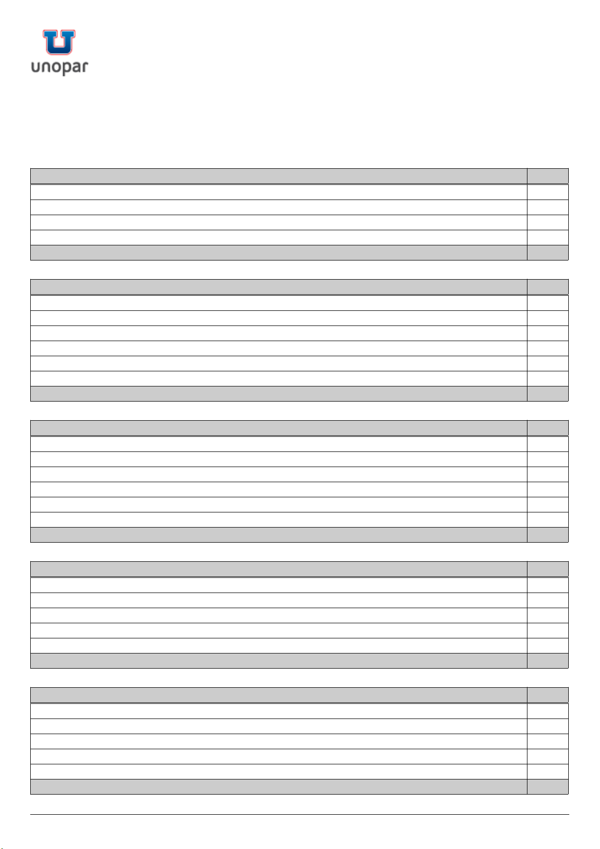 Pró-Reitoria Acadêmica - Secretaria Acadêmica Setorial EaD. ENFERMAGEM Universidade Pitágoras Unopar Anhanguera Disciplina CH 10º SEMESTRE ED - RESPONSABILIDADE SOCIAL 3 ESTÁGIO SUPERVISIONADO II 400 TRABALHO DE CONCLUSÃO DE CURSO II 60 TÓPICOS ESPECIAIS EM ENFERMAGEM 70 Total CH: 533 Disciplina CH 1º SEMESTRE ED - CULTURA DIGITAL 3 EDUCAÇÃO A DISTÂNCIA 20 GESTÃO, QUALIDADE E SEGURANÇA DO PACIENTE 70 PENSAMENTO CIENTÍFICO 70 PSICOLOGIA APLICADA À SAÚDE 70 SOCIEDADE BRASILEIRA E CIDADANIA 100 Total CH: 333 Disciplina CH 2º SEMESTRE CIÊNCIAS MORFOFUNCIONAIS DOS SISTEMAS DIGESTÓRIO, ENDÓCRINO E RENAL 70 CIÊNCIAS MORFOFUNCIONAIS DOS SISTEMAS IMUNE E HEMATOLÓGICO 70 CIÊNCIAS MORFOFUNCIONAIS DOS SISTEMAS TEGUMENTAR, LOCOMOTOR E REPRODUTOR 70 ED - PROJETO DE VIDA 3 INTRODUÇÃO À BIOLOGIA CELULAR E DO DESENVOLVIMENTO 70 SAÚDE PÚBLICA 70 Total CH: 353 Disciplina CH 3º SEMESTRE BIOQUÍMICA APLICADA À SAÚDE 70 CIÊNCIAS MORFOFUNCIONAIS DOS SISTEMAS NERVOSO E CARDIORRESPIRATÓRIO 70 ED - MARKETING DIGITAL 3 ENFERMAGEM, CIÊNCIA E TRABALHO 70 MICROBIOLOGIA BÁSICA 70 Total CH: 283 Disciplina CH 4º SEMESTRE BIOÉTICA E LEGISLAÇÃO EM ENFERMAGEM 70 DIDÁTICA APLICADA À ENFERMAGEM 70 ED - CONSTRUINDO UMA CARREIRA DE SUCESSO - SAÚDE 3 FUNDAMENTOS SEMIOLÓGICOS DE ENFERMAGEM 140 PROCESSO DE CUIDAR EM ENFERMAGEM 70 Total CH: 353 02/08/2022 10:23:17 Diretoria de Informática Página 1 Pró-Reitoria Acadêmica - Secretaria Acadêmica Setorial EaD. ENFERMAGEM Universidade Pitágoras Unopar Anhanguera Disciplina CH 5º SEMESTRE ED - MINDSET ÁGIL 3 ENFERMAGEM NA SAÚDE DO IDOSO 70 ESTRATÉGIA DA SAÚDE DA FAMÍLIA 70 FARMACOLOGIA DOS SISTEMAS 70 FUNDAMENTOS TÉCNICOS DE ENFERMAGEM 140 SISTEMATIZAÇÃO DA ASSISTÊNCIA DE ENFERMAGEM 70 Total CH: 423 Disciplina CH 6º SEMESTRE ED - DESIGN THINKING 3 ENFERMAGEM NA SAÚDE DO ADULTO 140 SAÚDE MENTAL 70 SEMINÁRIO INTEGRADOR DA SAÚDE DO ADULTO 70 URGÊNCIA E EMERGÊNCIA EM ENFERMAGEM 70 Total CH: 353 Disciplina CH 7º SEMESTRE ED - EMPREGABILIDADE 3 ENFERMAGEM NA SAÚDE DA CRIANÇA E DO ADOLESCENTE 140 ENFERMAGEM NA SAÚDE DA MULHER 140 SEMINÁRIO INTEGRADOR NA SAÚDE DA CRIANÇA 70 SEMINÁRIO INTEGRADOR NA SAÚDE DA MULHER 70 Total CH: 423 Disciplina CH 8º SEMESTRE ED - DESENVOLVIMENTO DE CARREIRA 3 ENFERMAGEM EM CENTRO CIRÚRGICO 70 GESTÃO EM SAÚDE 70 INTENSIVISMO 70 OPTATIVA I 70 SAÚDE DO TRABALHADOR 70 Total CH: 353 Disciplina CH 9º SEMESTRE ED - EMPREENDEDORISMO 3 ESTÁGIO SUPERVISIONADO I 400 OPTATIVA II 70 TRABALHO DE CONCLUSÃO DE CURSO I 60 Total CH: 533 02/08/2022 10:23:17 Diretoria de Informática Página 2