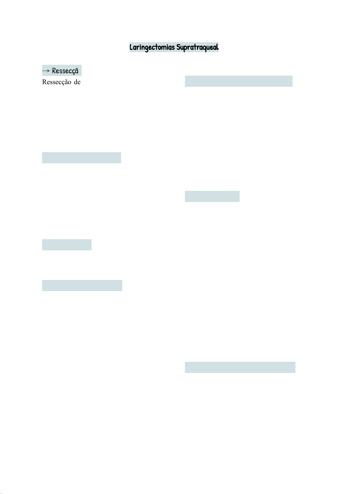 Gracielle David Laringectomias Supratraqueal → Ressecção Ressecção de todas as estruturas acima da traquéia com a exceção de uma aritenóide e a porção posterior da cricóide. - Cartilagem cricóide - aritenóide - Cartilagem aritenóide - Epiglote → Estruturas preservadas - É preservada aritenóide (uma unidade funcional da laringe) - É preservada uma parte posterior da cartilagem cricóide para possibilitar a funcionalidade da aritenóide → Indicada para tumores transglóticos → Reconstrução - THP - THEP → THP (Tireohioideopexia) - Sítio primário - Supraglote - Ressecção da epiglote - Osso hióide preservado, pelo menos aritenóide e a porção posterior da cricóide - Nela a fonação é a partir da vibração da aritenóide com a epiglote → THEP (Tireohioideoepiglotopexia) - Sítio primário - glote - Preserva a epiglote, 1 aritenóide, porção posterior da cricóide, osso hióide e epiglote - Melhores resultados funcionais para deglutição - Sutura-se também a base da epiglote - Fonação a partir da vibração das aritenóides com a epiglote → TQT provisório Nem todos os pacientes conseguem decanular na prática clínica - Retirada após a diminuição do edema p.o, quando o paciente for encaminhado para RxT, opta-se por mantê-la, já que a RxT aumenta o edema laríngeo, podendo impedir a respiração. - Sonda nasogástrica: Removida quando não ocorrer mais aspiração - Reabilitação da deglutição é primordial (oclusão para restaurar o fluxo aéreo, maximização da aritenóide para o vedamento de via aérea) - Dificuldades em líquidos é maior → Manobras de reabilitação SG e SSG Gracielle David Laringectomias Subtotais Near total - Laringectomia quase total ou laringectomia três quartos → É retirado ¾ da laringe Tentativa de manter a integridade parcial da laringe para que o paciente consiga garantir as funções de respiração, fonação e deglutição. → Indicação e Contraindicação - Indicada para tumores avançados da laringe com acometimento transglótico - Contraindicação no acometimento da doença na região interaritenóidea → Ressecção Todo o esqueleto laríngeo, preservando apenas uma aritenóide e parte posterior de uma prega vocal. → Reconstrução Fístula faringotraqueal (neolaringe) - Retalho de uma estreita faixa de mucosa laríngea que conecta a traquéia a faringe, além de uma aritenóide funcional. Por meio deste Shunt, o ar é conduzido. - Se a fístula for muito larga, durante a deglutição o paciente corre o risco de aspirar e o alimento penetra, e com isso desenvolve uma pneumonia. Ela não é aberta o suficiente para garantir a respiração, pensando na proteção das vias aéreas durante a deglutição. - A laringe remanescente não vai ser a mantenedora da respiração, dessa forma a TQT é DEFINITIVA. → Fonação - Oclusão do traqueostoma: O ar normalmente passa pelo traqueostoma, assim, durante a fonação há uma oclusão do traqueostoma para direcionar esse som para a fístula faringotraqueal e suba pela neolaringe - Pitch agudizado: Por conta da hiperextensão laríngea - Qualidade vocal semelhante à prótese traqueoesofágica, porém com frequências mais aguda - Aumento da f0, restrição na extensão da frequência – menor área do shunt, menor comprimento do trato vocal (↑ ressonância das frequências agudas) - Jitter e shimmer aumentados - voz molhada, soprosa, ↓intensidade → Fonoterapia - Manter a adequada passagem de ar pela fístula: trabalha exercícios de passagem de ar pela fístula para Gracielle David evitar a estenose (constrição do orifício) - Trabalhar exercícios de inspiração e expiração pelo traqueostoma - Não trabalha a decanulação do paciente, visto a TQT definitiva → Exercícios de esforço vocal - mobilidade das aritenóides para produção vocal e proteção de V.A durante a deglutição - exercícios com empuxo e esforço para mobilizar a aritenóide, melhorar o componente de soprosidade e aumentar a intensidade vocal - exercícios de variação de frequência e intensidade - exercícios de sobrearticulação (para melhorar a inteligibilidade) - CPFA → Principais problemas - Estenose da fístula (dificultando a fonação): quando a fístula esteja estreita vai acarretar num impedimento para fonação - Fístulas maiores (quadros de PNM aspirativa de repetição): quando a fístula esteja alongada o alimento pode penetrar a fístula e gerar pneumonias de repetição por broncoaspiração. → Muito utilizada na década de 1980, antes da popularização da laringectomia supracricóide, sendo indicadas para tumores T3 e T4 de laringe e seio piriforme; T2 com invasão de uma das aritenóides ou naqueles que havia envolvimento da subglote; e para tumores de parede medial do seio piriforme → Atualmente apenas alguns serviços utilizam → TQT definitiva para manutenção da respiração - Quando envolve tumor de seio piriforme: faringolaringectomia near total. - TQT definitiva: manutenção da respiração Gracielle David Laringectomias totais → Tumores mais avançados da laringe que atingem as duas aritenóides → Ressecação - toda estrutura laríngea * A remoção é parcial ou total da hipofaringe depende da extensão do tumor. → Indicação - T3 e T4 laringe - T2 em que não há condição de laringectomia parcial: invasão das 2 aritenóides ou da subglote - tumor subglote. Relembrando • T1: confinado às ppvv com mobilidade normal T1a: uma prega vocal T1b: ambas as ppvv • T2: extensão para supra ou subglote com mobilidade da pv diminuída • T3: confinado à laringe com fixação da prega vocal • T4: extensão além da laringe 1. O cirurgião vai suturar a base da língua (faringe) ao esôfago. Então da boca o único caminho possível é até o esôfago 2. A traqueia do paciente vai ser suturada na base do pescoço, com uma abertura permanente que vai garantir a respiração do paciente → traqueostoma → Recons