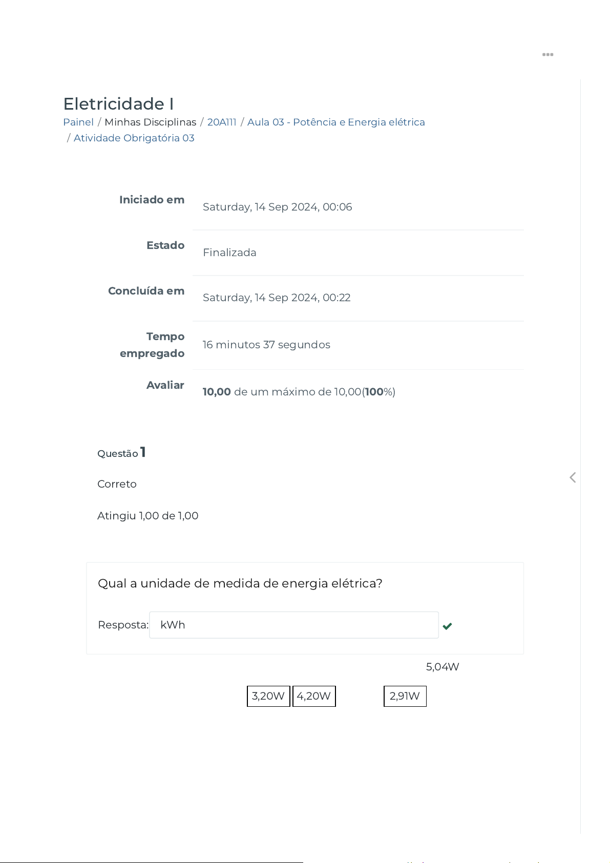 Painel / Minhas Disciplinas / 20A111 / Aula 03 - Potência e Energia elétrica / Atividade Obrigatória 03 Eletricidade I Iniciado em Saturday, 14 Sep 2024, 00:06 Estado Finalizada Concluída em Saturday, 14 Sep 2024, 00:22 Tempo empregado 16 minutos 37 segundos Avaliar 10,00 de um máximo de 10,00(100%) Questão 1 Correto Atingiu 1,00 de 1,00 Qual a unidade de medida de energia elétrica? Resposta: kWh 3,20W 4,20W 5,04W 2,91W https://ava.politecnicabr.com.br/my/ https://ava.politecnicabr.com.br/my/ https://ava.politecnicabr.com.br/course/view.php?id=946 https://ava.politecnicabr.com.br/course/view.php?id=946#section-4 https://ava.politecnicabr.com.br/mod/quiz/view.php?id=26021 https://ava.politecnicabr.com.br/course/view.php?id=946 javascript:void(0) javascript:void(0) javascript:void(0) javascript:void(0) https://ava.politecnicabr.com.br/mod/resource/view.php?id=26019 https://ava.politecnicabr.com.br/mod/url/view.php?id=26020 https://ava.politecnicabr.com.br/mod/quiz/view.php?id=26021 javascript:void(0) javascript:void(0) javascript:void(0) https://ava.politecnicabr.com.br/ Questão 2 Correto Atingiu 1,00 de 1,00 Considere um resistor de 3,5Ω sobe uma corrente de 1,2A, a potência dissipada deste resistor é de . Questão 3 Correto Atingiu 1,00 de 1,00 A expressão matemática para a potência elétrica é: Escolha uma opção: P = V ∗ I Verdadeiro Falso https://ava.politecnicabr.com.br/course/view.php?id=946 javascript:void(0) javascript:void(0) javascript:void(0) javascript:void(0) https://ava.politecnicabr.com.br/mod/resource/view.php?id=26019 https://ava.politecnicabr.com.br/mod/url/view.php?id=26020 https://ava.politecnicabr.com.br/mod/quiz/view.php?id=26021 javascript:void(0) javascript:void(0) javascript:void(0) https://ava.politecnicabr.com.br/ Questão 4 Correto Atingiu 1,00 de 1,00 Um resistor, submetido à diferença de potencial de 8,0 V, é percorrido por uma corrente elétrica de intensidade i = 0,4 A. Qual a potência dissipada por este resistor? Resposta: 3,2 W Ámpres Ámpres Ámpres Ámpres A AAA Watt WattWattWatt V VVV W WWW VoltsVoltsVoltsVolts https://ava.politecnicabr.com.br/course/view.php?id=946 javascript:void(0) javascript:void(0) javascript:void(0) javascript:void(0) https://ava.politecnicabr.com.br/mod/resource/view.php?id=26019 https://ava.politecnicabr.com.br/mod/url/view.php?id=26020 https://ava.politecnicabr.com.br/mod/quiz/view.php?id=26021 javascript:void(0) javascript:void(0) javascript:void(0) https://ava.politecnicabr.com.br/ Questão 5 Correto Atingiu 1,00 de 1,00 (IFSP) Ao entrar em uma loja de materiais de construção, um eletricista vê o seguinte anúncio: ECONOMIZE: Lâmpadas fluorescentes de 15 W têm a mesma luminosidade (iluminação) que lâmpadas incandescentes de 60 W de potência. De acordo com o anúncio, com o intuito de economizar energia elétrica, o eletricista troca uma lâmpada incandescente por uma fluorescente e conclui que, em 1 hora, a economia de energia elétrica, em kWh, será de. Escolha uma opção: 0,04 0,03 0,045 0,015 0,025 https://ava.politecnicabr.com.br/course/view.php?id=946 javascript:void(0) javascript:void(0) javascript:void(0) javascript:void(0) https://ava.politecnicabr.com.br/mod/resource/view.php?id=26019 https://ava.politecnicabr.com.br/mod/url/view.php?id=26020 https://ava.politecnicabr.com.br/mod/quiz/view.php?id=26021 javascript:void(0) javascript:void(0) javascript:void(0) https://ava.politecnicabr.com.br/ Questão 6 Correto Atingiu 1,00 de 1,00 (UERGS – PR) Um chuveiro elétrico está instalado numa casa onde a rede elétrica é de 110 V. Um eletricista considera aconselhável alterar a instalação elétrica para 220 V e utilizar um chuveiro de mesma potência que o utilizado anteriormente, pois, com isso, o novo chuveiro: Escolha uma opção: será percorrido por uma corrente elétrica menor consumirá menos energia elétrica. consumirá mais energia elétrica. será percorrido por uma corrente elétrica maior dissipará maior quantidade de calor. https://ava.politecnicabr.com.br/course/view.php?id=946 javascript:void(0) javascript:void(0) javascript:void(0) javascript:void(0) https://ava.politecnicabr.com.br/mod/resource/view.php?id=26019 https://ava.politecnicabr.com.br/mod/url/view.php?id=26020 https://ava.politecnicabr.com.br/mod/quiz/view.php?id=26021 javascript:void(0) javascript:void(0) javascript:void(0) https://ava.politecnicabr.com.br/ Questão 7 Correto Atingiu 1,00 de 1,00 A potência elétrica é uma grandeza e, como tal, pode ser medida. A unidade de medida da potência elétrica é o , simbolizado pela letra . Um watt (1W) corresponde à potência desenvolvida no tempo de um segundo em uma carga, alimentada por uma tensão de 1 , na qual circula uma corrente de 1 . Questão 8 Correto Atingiu 1,00 de 1,00 Potência elétrica é a quantidade de energia elétrica desenvolvida em um intervalo de tempo Escolha uma opção: Verdadeiro Falso https://ava.politecnicabr.com.br/course/view.php?id=946 javascript:void(0) javascript:void(0) javascript:void(0) javascript:void(0) https://ava.politecnicabr.com.br/mod/resource/view.php?id=26019 https://ava.politecnicabr.com.br/mod/url/view.php?id=26020 https://ava.politecnicabr.com.br/mod/quiz/view.php?id=26021 javascript:void(0) javascript:void(0) javascript:void(0) https://ava.politecnicabr.com.br/ Questão 9 Correto Atingiu 1,00 de 1,00 (PUC- MG) Ao aplicarmos uma diferença de potencial 9,0 V em um resistor de 3,0Ώ, podemos dizer que a potência dissipada é: Resposta: 27 Questão 10 Correto Atingiu 1,00 de 1,00 Qual a unidade de medida de potência elétrica em circuitos CC? Escolha uma opção: W V W A Ω Entre em Contato Links Úteis https://ava.politecnicabr.com.br/course/view.php?id=946 javascript:void(0) javascript:void(0) javascript:void(0) javascript:void(0) https://ava.politecnicabr.com.br/mod/resource/view.php?id=26019 https://ava.politecnicabr.com.br/mod/url/view.php?id=26020 https://ava.politecnicabr.com.br/mod/quiz/view.php?id=2