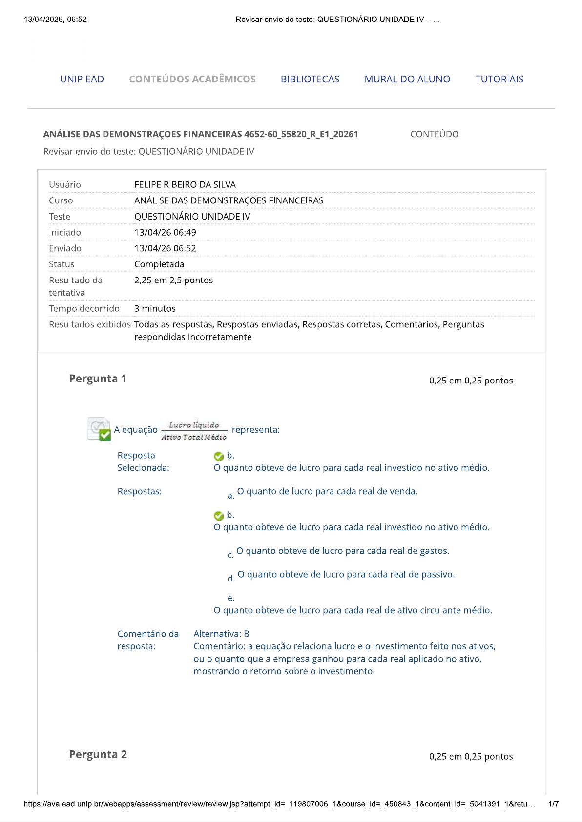 13/04/2026, 06:52 Revisar envio do teste: QUESTIONÁRIO UNIDADE IV UNIP EAD CONTEÚDOS ACADÊMICOS BIBLIOTECAS MURAL DO ALUNO TUTORIAIS ANÁLISE DAS FINANCEIRAS CONTEÚDO Revisar envio do teste: QUESTIONÁRIO UNIDADE IV Usuário FELIPE RIBEIRO DA SILVA Curso ANÁLISE DAS DEMONSTRAÇÕES FINANCEIRAS Teste QUESTIONÁRIO UNIDADE IV Iniciado 13/04/26 06:49 Enviado 13/04/26 06:52 Status Completada Resultado da 2,25 em 2,5 pontos tentativa Tempo decorrido 3 minutos Resultados exibidos Todas as respostas, Respostas enviadas, Respostas corretas, Comentários, Perguntas respondidas incorretamente Pergunta 1 0,25 em 0,25 pontos A equação Lucro líquido representa: Ativo Total Médio Resposta b. Selecionada: quanto obteve de lucro para cada real investido no ativo médio. Respostas: a. O quanto de lucro para cada real de venda. b. quanto obteve de lucro para cada real investido no ativo médio. C. quanto obteve de lucro para cada real de gastos. d. quanto obteve de lucro para cada real de passivo. e. quanto obteve de lucro para cada real de ativo circulante médio. Comentário da Alternativa: resposta: Comentário: a equação relaciona lucro e o investimento feito nos ativos, ou quanto que a empresa ganhou para cada real aplicado no ativo, mostrando retorno sobre investimento. Pergunta 2 0,25 em 0,25 pontos 1/713/04/2026, 06:52 Revisar envio do teste: QUESTIONÁRIO UNIDADE IV A taxa de retorno sobre patrimônio líquido mensura retorno dos investimentos aplicados dos acionistas ou proprietários da empresa, ou seja, prêmio do investidor pelo risco de seu negócio. É obtido, por sua vez, pela relação entre lucro líquido e patrimônio líquido. Em relação a esse índice, podemos dizer que: Resposta Selecionada: b. Quanto maior, melhor. Respostas: a. Quanto maior, pior. b. Quanto maior, melhor. C. Deve ser menor que os dos principais concorrentes. d. Deve ser igual aos concorrentes. e. Deve ser estável com passar do tempo. Comentário da Alternativa: resposta: Comentário: aponta quanto a empresa ganhou em relação a cada real aplicado no patrimônio líquido. Assim, quanto maior o retorno sobre a aplicação, melhor será. Pergunta 3 0,25 em 0,25 pontos Observe quadro: Margem líquida 2007 2008 Lucro liquido 1.033,60 1.249,60 100 100 21,3% 100 23,6% Receitas líquidas 4.846,70 5.300,60 Assim, podemos dizer que: 2/713/04/2026, 06:52 Revisar envio do teste: QUESTIONÁRIO UNIDADE IV Resposta d. Selecionada: A situação melhorou, pois, ganho para cada real de receita foi maior. Respostas: a. A situação da empresa piorou, pois a margem foi maior. b. A situação melhorou, pois a margem diminuiu. A situação ficou estável. d. A situação melhorou, pois, ganho para cada real de receita foi maior. e. Para cada um real de lucro, a empresa vendeu vinte e três reais. Comentário da Alternativa: D resposta: Comentário: a situação melhorou, pois em 2007 a empresa ganhou 21,3% sobre as vendas, em 2008 passou para 23,6. A melhora foi singela, mas houve Pergunta 4 0,25 em 0,25 pontos A fórmula que representa giro do ativo é: Resposta Selecionada: vendas líquidas ativo total Respostas: passivo ativo total a. Lucro ativo total b. vendas líquidas ativo total C. PL ativo total d. DRE ativo total e. Comentário da Alternativa: resposta: Comentário: o giro do ativo aponta a quantidade de vezes que ativo total retornou para a empresa através das vendas líquidas, logo, a fórmula correta é a da alternativa 3/713/04/2026, 06:52 Revisar envio do teste: QUESTIONÁRIO UNIDADE IV Pergunta 5 0,25 em 0,25 pontos Uma análise de insolvência pela metodologia de Kanitz obteve nota 1. Isso significa que: Resposta Selecionada: b. A empresa está solvente. Respostas: a. A empresa está insolvente. b. A empresa está solvente. A empresa está indefinida. d. A empresa está na média de mercado. e. A empresa está abaixo da média de mercado. Comentário da Alternativa: B resposta: Comentário: cada metodologia tem uma forma diferente de calcular, mas todas com mesmo objetivo. Pela metodologia de Kanits, os parâmetros são: Classificação: FI inferior a -3 insolvente FI entre -3 e 0 indefinida FI acima de solvente Logo, a empresa é solvente. Pergunta 6 0,25 em 0,25 pontos Observe quadro: Indicadores Índice Índice-padrão Liquidez geral 1,8 1,5 Endividamento 1,8 1,5 Isso significa que: 4/713/04/2026, 06:52 Revisar envio do teste: QUESTIONÁRIO UNIDADE IV Resposta b. Selecionada: endividamento está ruim, pois está acima do índice-padrão. Respostas: a. A liquidez geral está ruim, pois está acima do índice-padrão. b. endividamento está ruim, pois está acima do índice-padrão. Ambas as situações estão boas. d. Ambas as situações estão ruins. e. A empresa está estável. Comentário da Alternativa: B resposta: Comentário: a liquidez geral é capacidade de pagamento; então, quanto maior, melhor; estando acima da média é algo positivo. Já endividamento é algo ruim, estar acima da média é mostrar que a empresa deve mais que os seus concorrentes. Pergunta 7 0 em 0,25 pontos É função do índice-padrão: Resposta Selecionada: b. Mostrar se a empresa está em situação de falência. Respostas: Mostrar a rentabilidade da empresa. a. b. Mostrar se a empresa está em situação de falência. Mostrar se a empresa é competitiva ou não. d. Mostrar se a empresa está em crescimento ou não. Mostrar os investimentos realizados. e. Pergunta 8 0,25 em 0,25 pontos Observe: LPA = Lucro líquido Número de ações emitidas Como resultante dessa fórmula, podemos dizer que: Resposta Selecionada: b. Quanto maior, melhor. Respostas: a. Quanto maior, pior. 5/713/04/2026, 06:52 Revisar envio do teste: QUESTIONÁRIO UNIDADE IV b. Quanto maior, melhor. Deve ser menor que os dos principais concorrentes. d. Deve ser igual aos concorrentes. e. Deve ser estável com passar do tempo. Comentário da Alternativa: B resposta: Comentário: essa fórmula aponta lucro por ação emitida. Assim, quanto maior for lucr