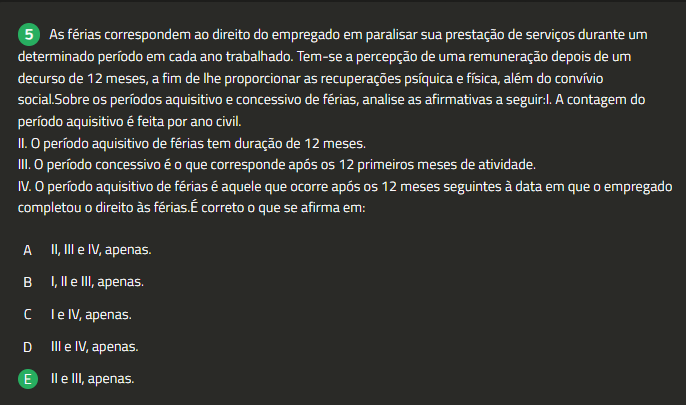 5 As férias correspondem ao direito do empregado em paralisar sua prestação de serviços durante um determinado período em cada ano trabalhado. Tem-se a percepção de uma remuneração depois de um decurso de 12 meses, a fim de lhe proporcionar as recuperações psíquica e física, além do convívio social.Sobre períodos aquisitivo e concessivo de férias, analise as afirmativas a seguir:l. A contagem do período aquisitivo é feita por ano civil. II. 0 período aquisitivo de férias tem duração de 12 meses. III. 0 período concessivo é que corresponde após 12 primeiros meses de atividade. IV. 0 período aquisitivo de férias é aquele que ocorre após 12 meses seguintes à data em que empregado completou 0 direito às correto 0 que se afirma em: A II, III e IV, apenas. B I, II e III, apenas. C I e IV, apenas. D III e IV, apenas. E II e III, apenas.