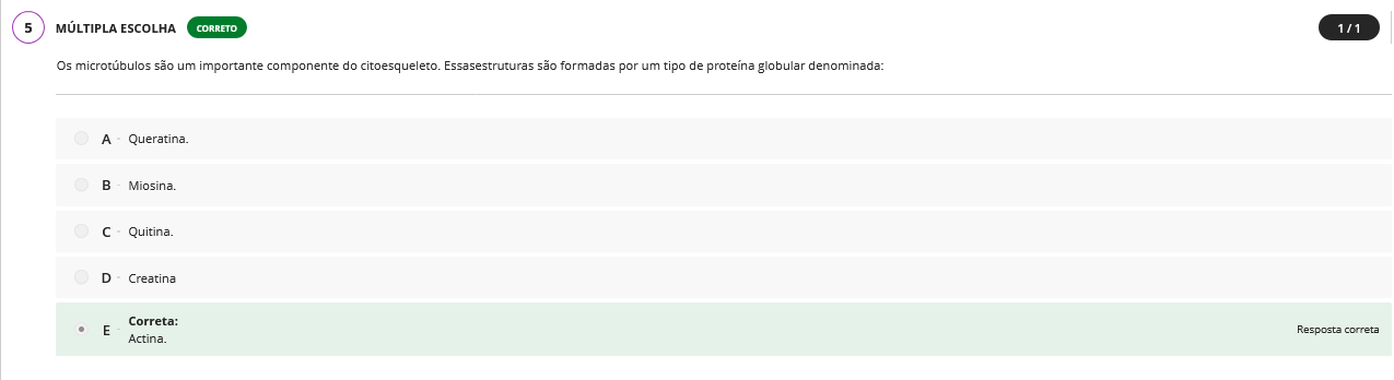 5 ESCOLHA CORRETO Os microtúbulos são um importante componente do citoesqueleto. Essasestruturas são formadas por um tipo de globular denominada: A Queratina. B Miosina. C Quitina. D Creatina Correta: E Resposta correta Actina.