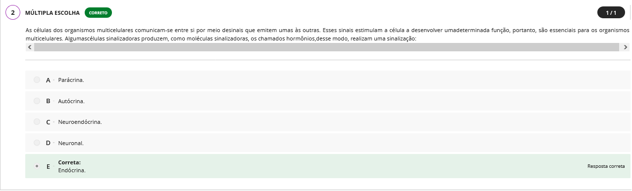 2 ESCOLHA CORRETO 1/1 As células dos organismos multicelulares comunicam-se entre si por meio desinais que emitem umas às outras. Esses sinais estimulam a célula a desenvolver umadeterminada função, portanto, são essenciais para os organismos multicelulares. Algumascélulas sinalizadoras produzem, como sinalizadoras, chamados hormônios,desse modo, realizam uma sinalização: A B C D Neuronal. Correta: E Resposta correta Endocrina.