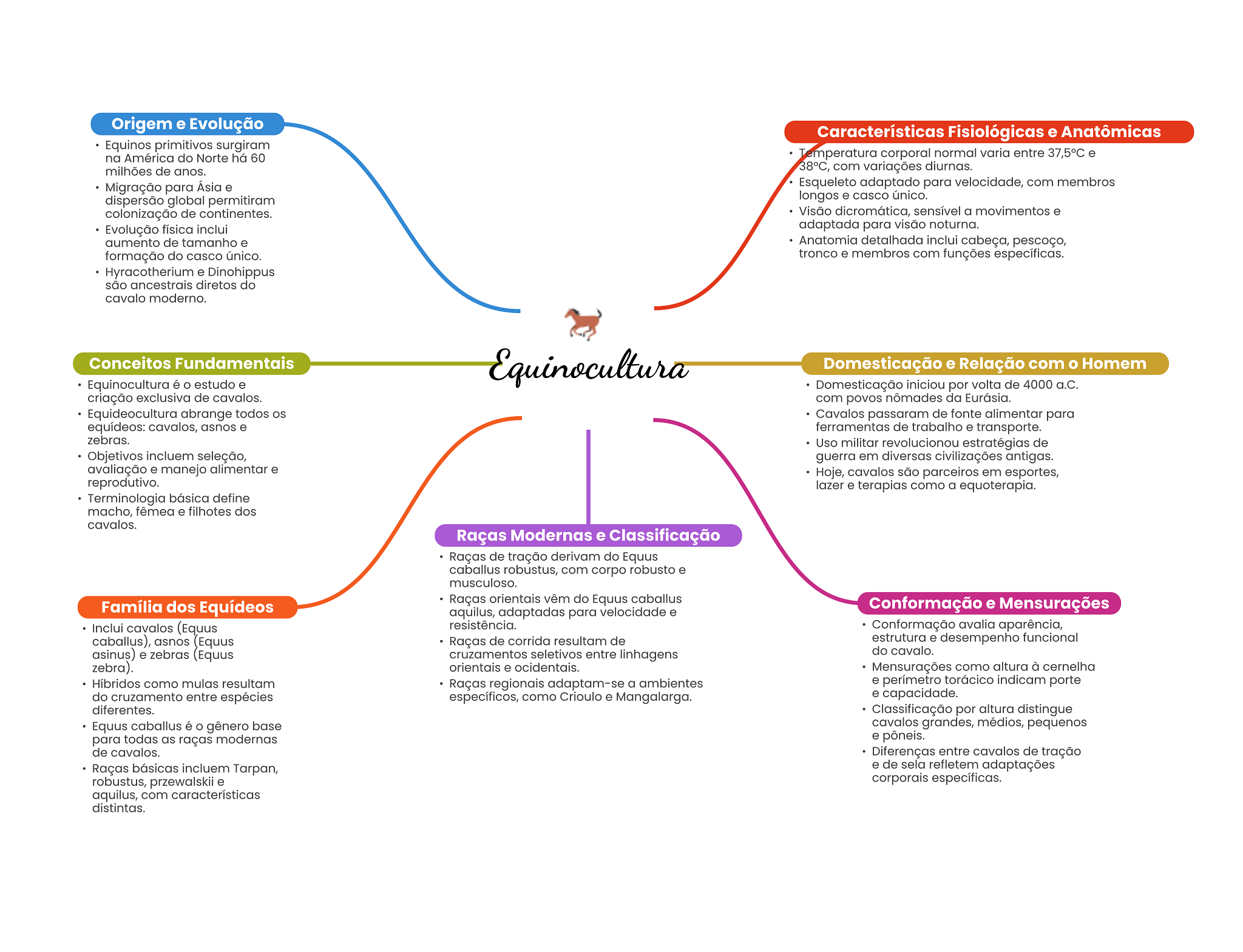 Origem e Evolução Características Fisiológicas e Anatômicas Equinos primitivos surgiram na América do Norte há 60 emperatura corporal normal varia entre 37,5°C e milhões de anos. 38°C, com variações diurnas. Migração para Ásia e Esqueleto adaptado para velocidade, com membros dispersão global permitiram longos e casco único. colonização de continentes. Visão dicromática, sensível a movimentos e Evolução física inclui adaptada para visão noturna. aumento de tamanho e Anatomia detalhada inclui cabeça, pescoço, formação do casco único. tronco e membros com funções específicas. Hyracotherium e Dinohippus são ancestrais diretos do cavalo moderno. Conceitos Fundamentais Equinocultura Domesticação e Relação com Homem Equinocultura é estudo e Domesticação iniciou por volta de 4000 a.C. criação exclusiva de cavalos. com povos nômades da Eurásia. Equideocultura abrange todos Cavalos passaram de fonte alimentar para equídeos: cavalos, asnos e ferramentas de trabalho e transporte. zebras. Uso militar revolucionou estratégias de Objetivos incluem seleção, guerra em diversas civilizações antigas. avaliação e manejo alimentar e Hoje, cavalos são parceiros em esportes, reprodutivo. lazer e terapias como a equoterapia. Terminologia básica define macho, fêmea e filhotes dos cavalos. Raças Modernas e Classificação Raças de tração derivam do Equus caballus robustus, com corpo robusto e musculoso. Raças orientais vêm do Equus caballus Família dos Equídeos aquilus, adaptadas para velocidade e Conformação e Mensurações Inclui cavalos (Equus resistência. Conformação avalia aparência, caballus), asnos (Equus Raças de corrida resultam de estrutura e desempenho funcional asinus) e zebras (Equus cruzamentos seletivos entre linhagens do cavalo. zebra). orientais e ocidentais. Mensurações como altura à cernelha Híbridos como mulas resultam Raças regionais adaptam-se a ambientes e perímetro torácico indicam porte do cruzamento entre espécies específicos, como Crioulo e Mangalarga. e capacidade. diferentes. Classificação por altura distingue Equus caballus é gênero base cavalos grandes, médios, pequenos para todas as raças modernas e pôneis. de cavalos. Diferenças entre cavalos de tração Raças básicas incluem Tarpan, e de sela refletem adaptações robustus, przewalskii e corporais específicas. aquilus, com características distintas.