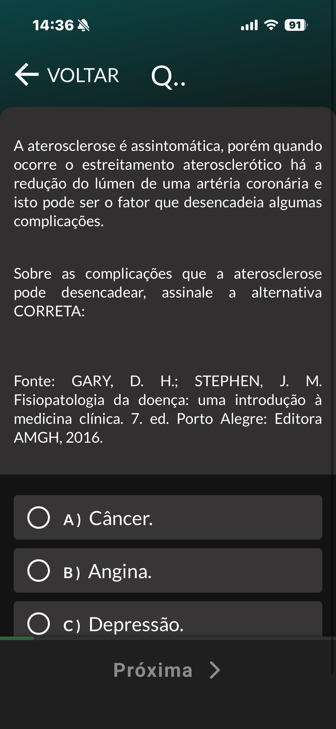 14:36 91 VOLTAR A aterosclerose é assintomática, porém quando ocorre estreitamento aterosclerótico há a redução do lúmen de uma artéria coronária e isto pode ser fator que desencadeia algumas complicações. Sobre as complicações que a aterosclerose pode desencadear, assinale a alternativa CORRETA: Fonte: GARY, D. H.; STEPHEN, J. Fisiopatologia da doença: uma introdução à medicina clínica. 7. ed. Porto Alegre: Editora AMGH, 2016. A) Câncer. B) Angina. C) Depressão. Próxima >