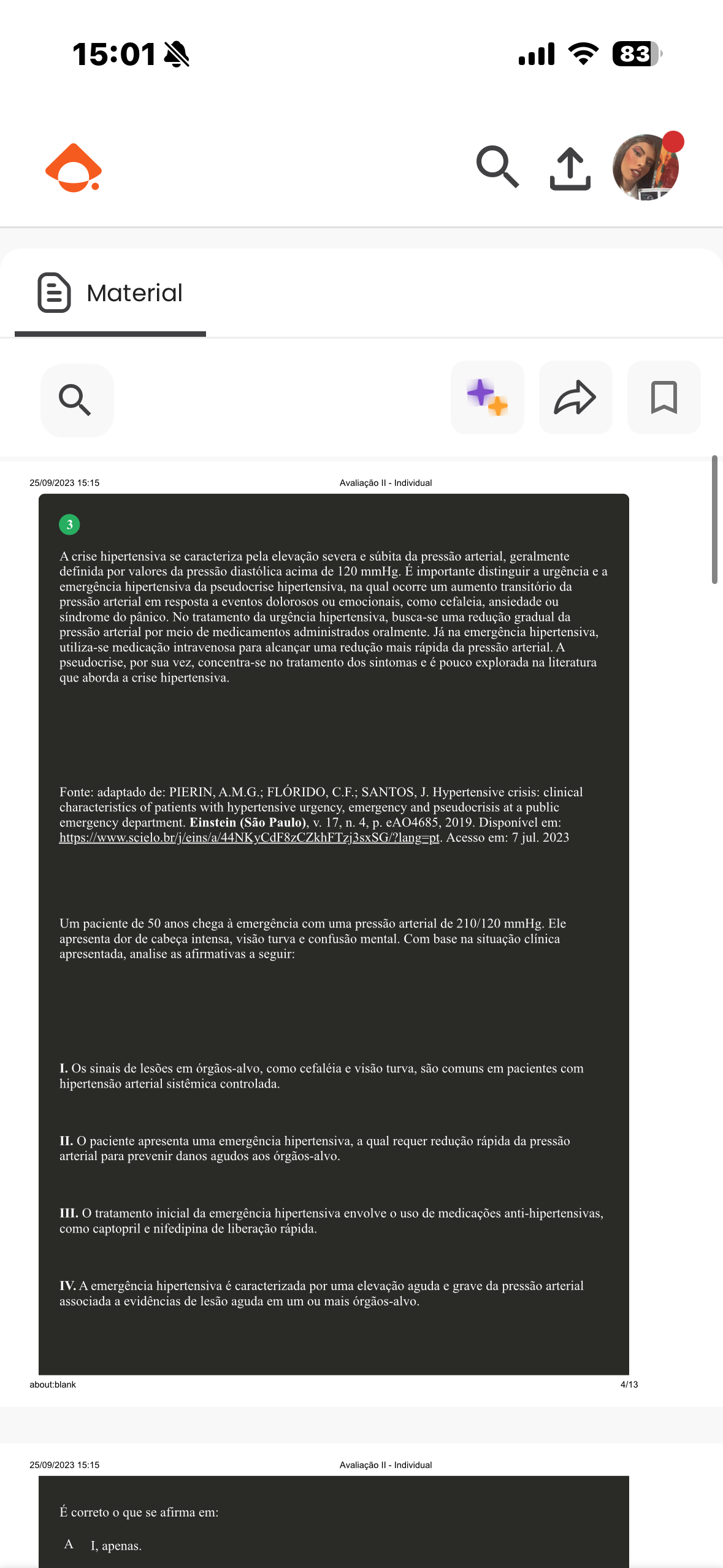 15:01 83 Material 25/09/2023 15:15 Avaliação Individual 3 A crise hipertensiva se caracteriza pela elevação severa e súbita da pressão arterial, geralmente definida por valores da pressão diastólica acima de 120 mmHg. importante distinguir a urgência e a emergência hipertensiva da pseudocrise hipertensiva, na qual ocorre um aumento transitório da pressão arterial em resposta a eventos dolorosos ou emocionais, como cefaleia, ansiedade ou síndrome do pânico. No tratamento da urgência hipertensiva, busca-se uma redução gradual da pressão arterial por meio de medicamentos administrados oralmente. Já na emergência hipertensiva, utiliza-se medicação intravenosa para alcançar uma redução mais rápida da pressão arterial. A pseudocrise, por sua vez, concentra-se no tratamento dos sintomas e é pouco explorada na literatura que aborda a crise hipertensiva. Fonte: adaptado de: PIERIN, A.M.G.; FLÓRIDO, C.F.; SANTOS, J. Hypertensive crisis: clinical characteristics of patients with hypertensive urgency, emergency and pseudocrisis at a public emergency department. Einstein (São Paulo), V. 17, n. 4, p. eAO4685, 2019. Disponível em: Acesso em: 7 jul. 2023 Um paciente de 50 anos chega à emergência com uma pressão arterial de 210/120 mmHg. Ele apresenta dor de cabeça intensa, visão turva e confusão mental. Com base na situação clínica apresentada, analise as afirmativas a seguir: I. Os sinais de lesões em órgãos-alvo, como cefaléia e visão turva, são comuns em pacientes com hipertensão arterial sistêmica controlada. II. paciente apresenta uma emergência hipertensiva, a qual requer redução rápida da pressão arterial para prevenir danos agudos aos órgãos-alvo. III. tratamento inicial da emergência hipertensiva envolve o uso de medicações anti-hipertensivas, como captopril e nifedipina de liberação rápida. IV. A emergência hipertensiva é caracterizada por uma elevação aguda e grave da pressão arterial associada a evidências de lesão aguda em um ou mais órgãos-alvo. about:blank 4/13 25/09/2023 15:15 Avaliação II Individual É correto o que se afirma em: A I, apenas.