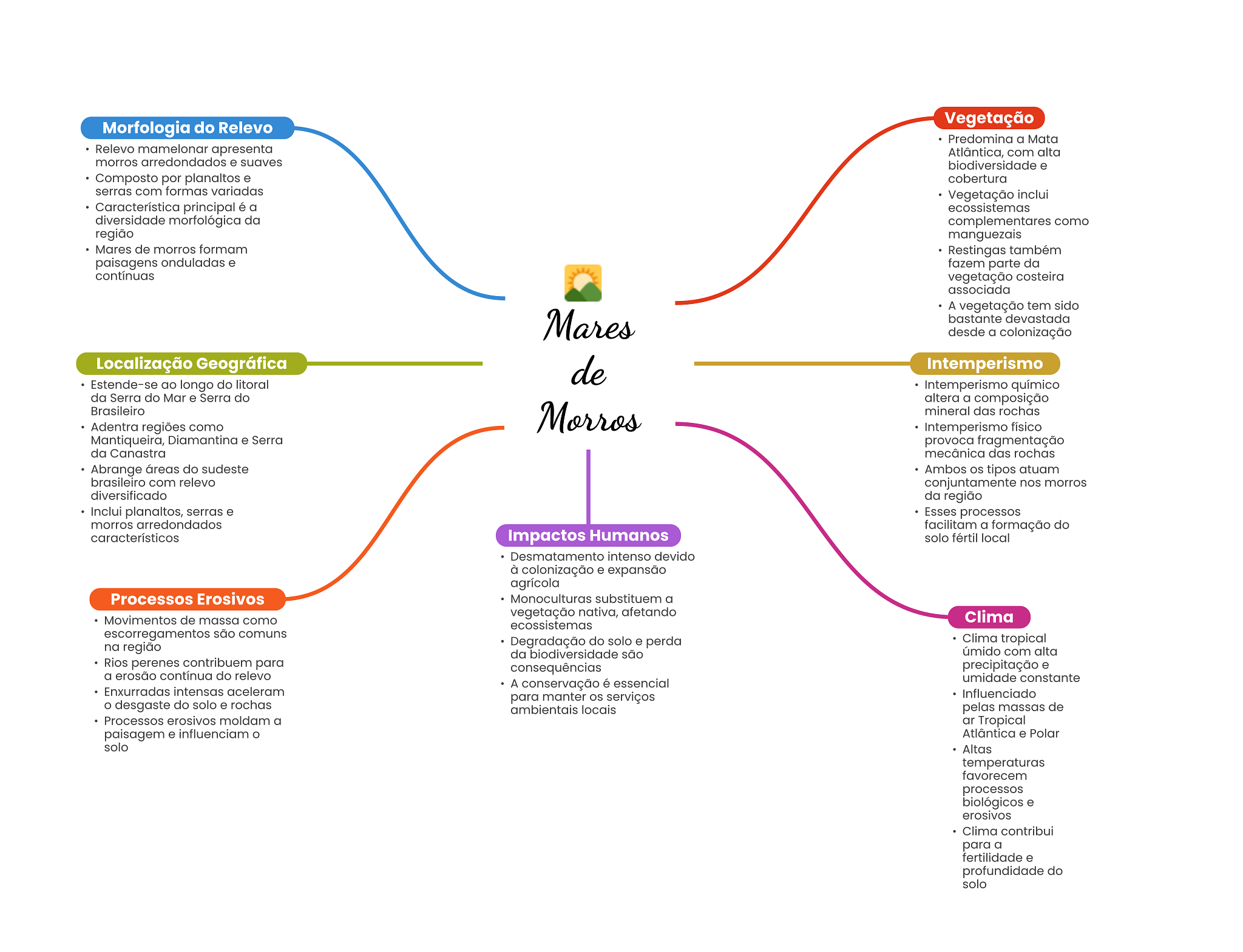 Morfologia do Relevo Vegetação Predomina a Mata Relevo mamelonar apresenta Atlântica, com alta morros arredondados e suaves biodiversidade e Composto por planaltos e cobertura serras com formas variadas Vegetação inclui Característica principal é a ecossistemas diversidade morfológica da complementares como região manguezais Mares de morros formam Restingas também paisagens onduladas e fazem parte da contínuas vegetação costeira associada A vegetação tem sido Mares bastante devastada desde a colonização Localização Geográfica de Intemperismo Estende-se ao longo do litoral Intemperismo químico da Serra do Mar e Serra do altera a composição Brasileiro Adentra regiões como Morros mineral das rochas Intemperismo físico Mantiqueira, Diamantina e Serra provoca fragmentação da Canastra mecânica das rochas Abrange áreas do sudeste Ambos tipos atuam brasileiro com relevo conjuntamente nos morros diversificado da região Inclui planaltos, serras e Esses processos morros arredondados facilitam a formação do característicos Impactos Humanos solo fértil local Desmatamento intenso devido à colonização e expansão agrícola Processos Erosivos Monoculturas substituem a vegetação nativa, afetando Movimentos de massa como Clima ecossistemas escorregamentos são comuns na região Degradação do solo e perda Clima tropical da biodiversidade são úmido com alta Rios perenes contribuem para consequências precipitação e a erosão contínua do relevo umidade constante A conservação é essencial Enxurradas intensas aceleram para manter OS serviços Influenciado desgaste do solo e rochas ambientais locais pelas massas de Processos erosivos moldam a Tropical paisagem e influenciam Atlântica e Polar solo Altas temperaturas favorecem processos biológicos e erosivos Clima contribui para a fertilidade e profundidade do solo