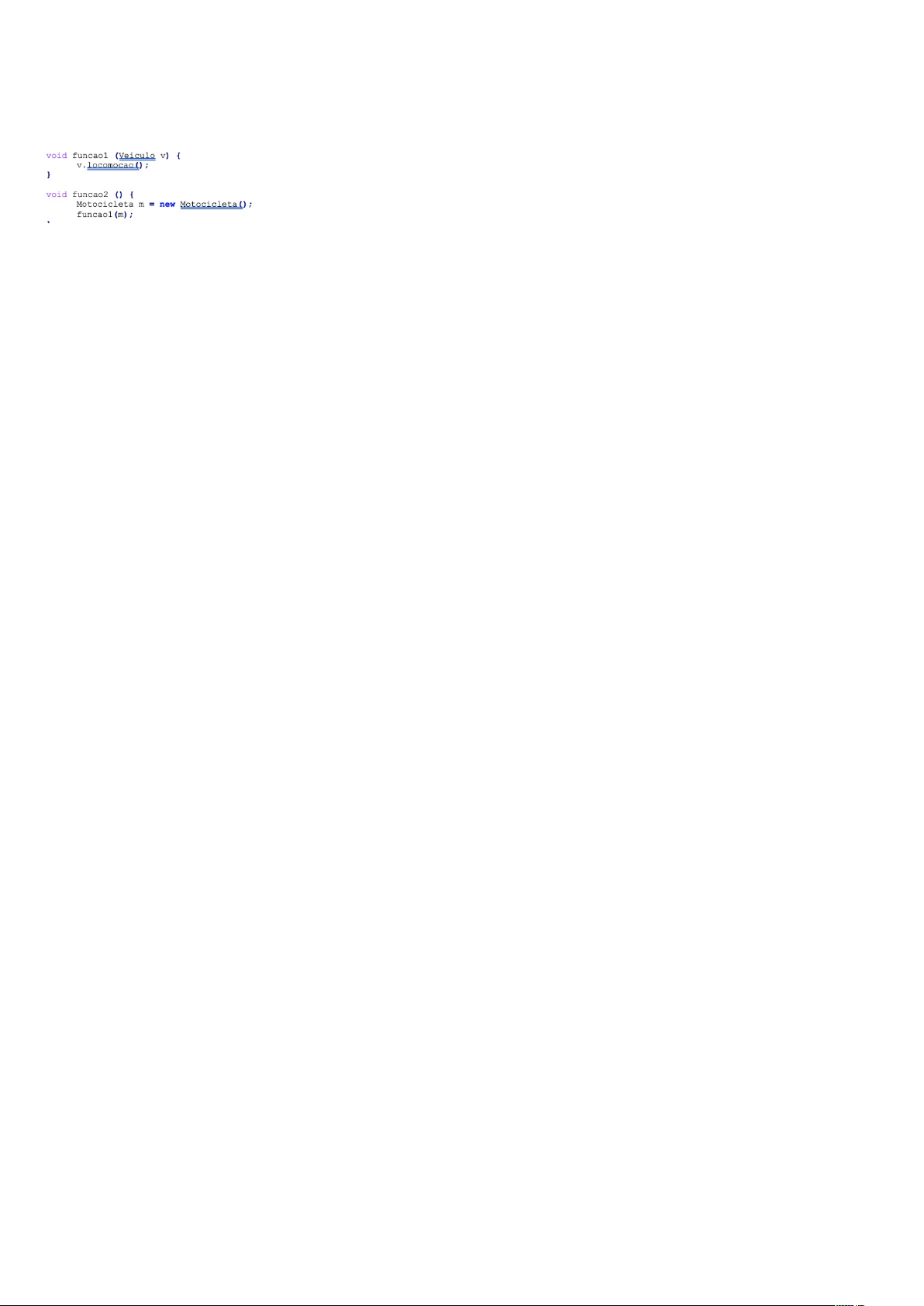 AO3 Programação orientada a Objetos Pergunta 3 Examine o código abaixo: Sabendo que a classe Motocicleta é herdeira da classe base Veiculo, analise as asserções abaixo e a relação proposta entre elas: I. Em funcao1 ocorre polimorfismo estático, ou seja, em tempo de compilação, quando a implementação do método a ser utilizada é escolhida durante a geração do bytecode. PORQUE II. Classes herdeiras podem sobrepor métodos da classe base, portanto a implementação do método utilizado em funcao1 irá depender da classe do objeto passado em “v”. A respeito dessas asserções, assinale a opção correta: e) A asserção I é uma proposição falsa e a asserção II é uma proposição verdadeira. image1.png