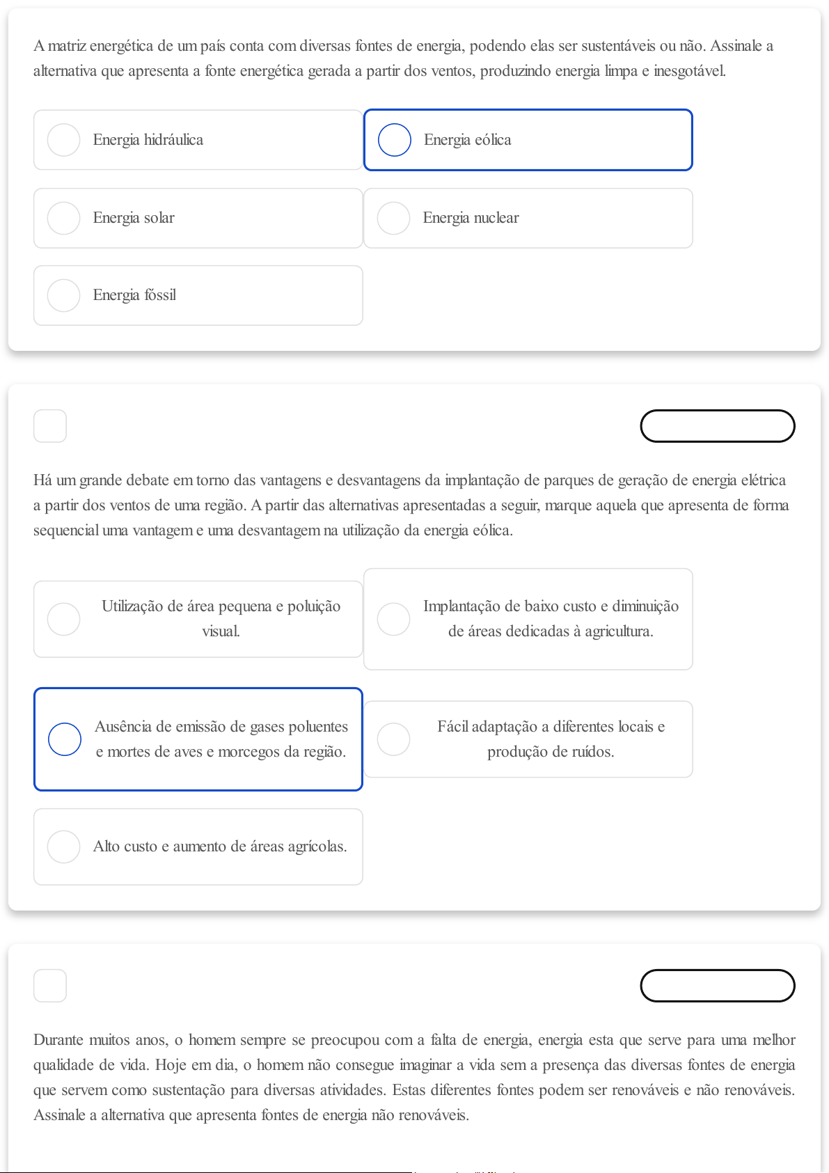A B C D E A B C D E A matriz energética de um país conta com diversas fontes de energia, podendo elas ser sustentáveis ou não. Assinale a alternativa que apresenta a fonte energética gerada a partir dos ventos, produzindo energia limpa e inesgotável. Energia hidráulica Energia eólica Energia solar Energia nuclear Energia fóssil 2 Marcar para revisão Há um grande debate em torno das vantagens e desvantagens da implantação de parques de geração de energia elétrica a partir dos ventos de uma região. A partir das alternativas apresentadas a seguir, marque aquela que apresenta de forma sequencial uma vantagem e uma desvantagem na utilização da energia eólica. Utilização de área pequena e poluição visual. Implantação de baixo custo e diminuição de áreas dedicadas à agricultura. Ausência de emissão de gases poluentes e mortes de aves e morcegos da região. Fácil adaptação a diferentes locais e produção de ruídos. Alto custo e aumento de áreas agrícolas. 3 Marcar para revisão Durante muitos anos, o homem sempre se preocupou com a falta de energia, energia esta que serve para uma melhor qualidade de vida. Hoje em dia, o homem não consegue imaginar a vida sem a presença das diversas fontes de energia que servem como sustentação para diversas atividades. Estas diferentes fontes podem ser renováveis e não renováveis. Assinale a alternativa que apresenta fontes de energia não renováveis. A B C D E A B C D E A B C D A hidráulica e o biocombustível. A geotérmica e o hidrogênio. O petróleo e o carvão mineral. A biomassa e as marés. A solar e a eólica. 4 Marcar para revisão Na Bahia, o complexo eólico apresentou no ano de 2014 uma geração de energia na faixa de 350-375 x 106 Watts, que foi o suficiente para o abastecimento de uma cidade de aproximadamente 3 milhões de pessoas. Assinale a opção que apresenta uma consequência para o desenvolvimento do sistema energético brasileiro: Diminuição da utilização elétrica. Aumento do uso bioenergético. Aumento de fontes renováveis. Alta demanda na área industrial. Aumento da dependência geotérmica. 5 Marcar para revisão Existem usinas de geração fotovoltaica de tamanhos diversos, espalhadas por todo o território nacional. Marque a alternativa que apresenta a maior usina fotovoltaica do Brasil. Usina solar São Gonçalo, no Piauí. Usina solar Pirapora, em Minas Gerais. Usina solar Nova Olinda, no Piauí. Parque solar Ituverava, na Bahia (292 MW). E A B C D E Complexo solar Lapa, na Bahia. 6 Marcar para revisão Os sistemas de geração fotovoltaica são compostos por diversos componentes como células fotovoltaicas, cabeamento, inversores, entre outros. Marque a alternativa que apresenta a função do inversor. Inverter os polos da energia. Alinhar as fases da energia trifásica. Inverter o fluxo de consumo de energia. Converter a tensão da energia. Converter corrente contínua em corrente alternada. 7 Marcar para revisão A célula FV é um elemento que gera eletricidade com características muito particulares, diferentes das formas tradicionais de geração de energia. Os sistemas fotovoltaicos podem ser independentes ou conectados à rede de distribuição. Seu dimensionamento deve ser feito por um projetista que conheça bem essas características, de forma a proporcionar um sistema que tenha uma operação confiável. São características dos equipamentos de geração de energia solar fotovoltaica, o que está descrito na alternativa: A B C D E Em sua maioria, as células fotovoltaicas são feitas de uma combinação de materiais condutores e não condutores. A área pode variar de 50 cm e 150 cm e de 0,2mm e 0,3mm de espessura. A célula tem a aparência externa de uma lâmina circular ou quadrada, com tons que variam do azul-escuro ao preto. A célula apresenta tiras de cor cinza que são construídas de material condutor e têm o objetivo de armazenar as cargas elétricas geradas quando as células são expostas à luz solar. As células fotovoltaicas mais comuns são capazes de gerar uma potência máxima de 1.000W/m , em condições de sol pleno e temperatura de funcionamento da célula de 25 C. Cada célula gera uma corrente de cerca de 32mA/cm , o que dá uma corrente total de entre 1,5A (50 cm ) e e 4,5A (150 cm ). A tensão de cada célula é entre 0,46V e 0,48V. 2 o 2 É necessário realizar o agrupamento das células fotovoltaicas através de associações somente em série paralelo para que se possa produzir a corrente e a tensão requerida pelas aplicações elétricas a que se destinam. O encapsulamento das células fotovoltaicas é feito com materiais especiais, para proporcionar a proteção necessária contra possíveis danos externos e isolamento elétrico. 8 Marcar para revisão O óleo diesel é o combustível mais comercializado no Brasil, sendo o S10 e o S500 os mais conhecidos. A letra "S" se refere ao teor de enxofre encontrado no óleo diesel, com o comum (S500) apresentando 500 partes de enxofre por milhão, enquanto o S10 conta apenas com 10 partes por milhão. Com relação à combustão do óleo diesel e aos dois tipos citados no texto, pode-se inferir que o óleo diesel: A B C D E A B C D E S500 produz mais dióxido de enxofre quando queimado S10 reduz consideravelmente a emissão de hidretos tóxicos no ar Independentemente do tipo, impacta da mesma forma o meio ambiente Mais comum, menos poluente que os demais, para quantidades iguais de óleo diesel queimado É altamente poluente 9 Marcar para revisão A mistura de biodiesel no óleo diesel passou para 10% a partir de 01/03/2018, podendo, assim, gerar impactos no preço final do combustível e na cadeia de produção agropecuária. A maior parte da matéria-prima, cerca de 80%, utilizada para a fabricação do biodiesel no Brasil provém do seguinte produto: Cana de açucar Gordura animal Algas Soja Petróleo 10 Marcar para revisão Banca: Instituto de Desenvolvimento Educacional, Cultural e A
