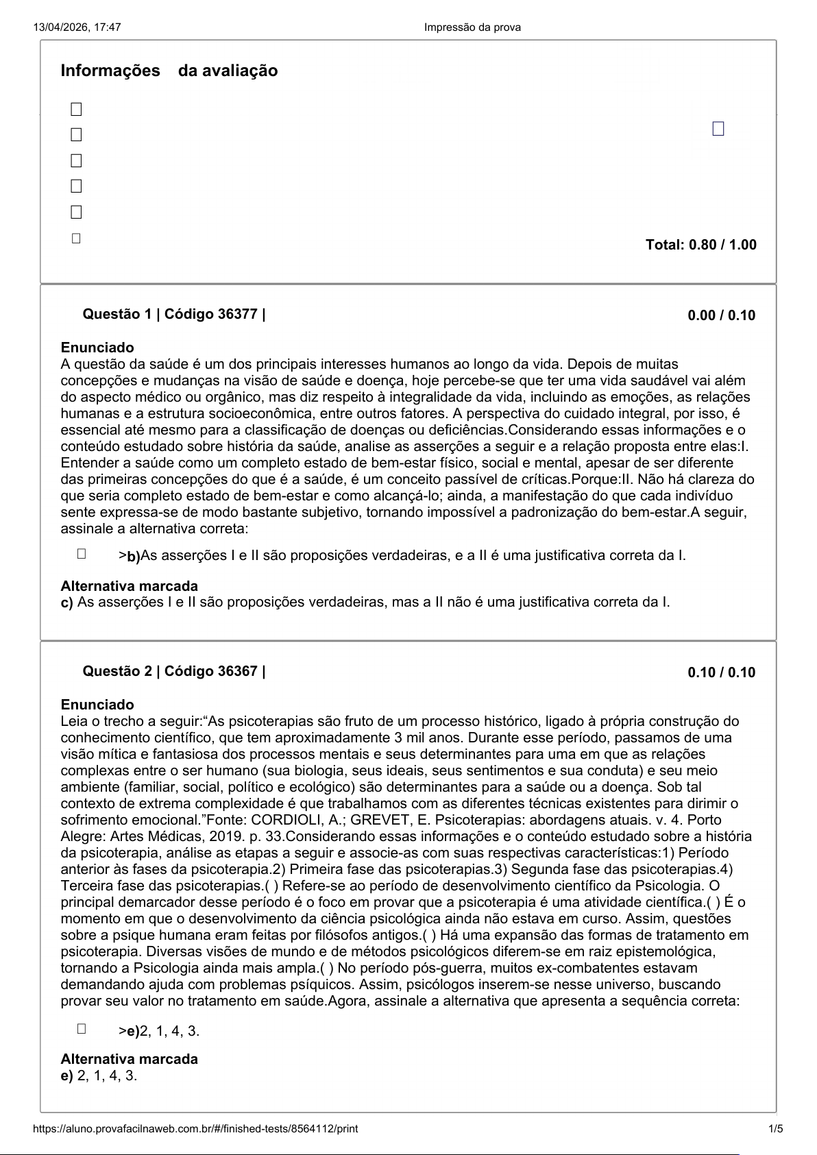 � Informações da avaliação � � � � � � As asserções I e II são proposições verdadeiras, mas a II não é uma justificativa correta da I. Leia o trecho a seguir:“As psicoterapias são fruto de um processo histórico, ligado à própria construção do conhecimento científico, que tem aproximadamente 3 mil anos. Durante esse período, passamos de uma visão mítica e fantasiosa dos processos mentais e seus determinantes para uma em que as relações complexas entre o ser humano (sua biologia, seus ideais, seus sentimentos e sua conduta) e seu meio ambiente (familiar, social, político e ecológico) são determinantes para a saúde ou a doença. Sob tal contexto de extrema complexidade é que trabalhamos com as diferentes técnicas existentes para dirimir o sofrimento emocional.”Fonte: CORDIOLI, A.; GREVET, E. Psicoterapias: abordagens atuais. v. 4. Porto Alegre: Artes Médicas, 2019. p. 33.Considerando essas informações e o conteúdo estudado sobre a história da psicoterapia, análise as etapas a seguir e associe-as com suas respectivas características:1) Período anterior às fases da psicoterapia.2) Primeira fase das psicoterapias.3) Segunda fase das psicoterapias.4) Terceira fase das psicoterapias.( ) Refere-se ao período de desenvolvimento científico da Psicologia. O principal demarcador desse período é o foco em provar que a psicoterapia é uma atividade científica.( ) É o momento em que o desenvolvimento da ciência psicológica ainda não estava em curso. Assim, questões sobre a psique humana eram feitas por filósofos antigos.( ) Há uma expansão das formas de tratamento em psicoterapia. Diversas visões de mundo e de métodos psicológicos diferem-se em raiz epistemológica, tornando a Psicologia ainda mais ampla.( ) No período pós-guerra, muitos ex-combatentes estavam demandando ajuda com problemas psíquicos. Assim, psicólogos inserem-se nesse universo, buscando provar seu valor no tratamento em saúde.Agora, assinale a alternativa que apresenta a sequência correta: � >e)2, 1, 4, 3. Alternativa marcada e) 2, 1, 4, 3. A questão da saúde é um dos principais interesses humanos ao longo da vida. Depois de muitas concepções e mudanças na visão de saúde e doença, hoje percebe-se que ter uma vida saudável vai além do aspecto médico ou orgânico, mas diz respeito à integralidade da vida, incluindo as emoções, as relações humanas e a estrutura socioeconômica, entre outros fatores. A perspectiva do cuidado integral, por isso, é essencial até mesmo para a classificação de doenças ou deficiências.Considerando essas informações e o conteúdo estudado sobre história da saúde, analise as asserções a seguir e a relação proposta entre elas:I. Entender a saúde como um completo estado de bem-estar físico, social e mental, apesar de ser diferente das primeiras concepções do que é a saúde, é um conceito passível de críticas.Porque:II. Não há clareza do que seria completo estado de bem-estar e como alcançá-lo; ainda, a manifestação do que cada indivíduo sente expressa-se de modo bastante subjetivo, tornando impossível a padronização do bem-estar.A seguir, assinale a alternativa correta: � > As asserções I e II são proposições verdadeiras, e a II é uma justificativa correta da I.b) Alternativa marcada c) Questão 1 | Código 36377 | Enunciado Questão 2 | Código 36367 | Enunciado 0.00 / 0.10 0.10 / 0.10 Total: 0.80 / 1.00 13/04/2026, 17:47 https://aluno.provafacilnaweb.com.br/#/finished-tests/8564112/print Impressão da prova 1/5 � a) Alternativa marcada a) � b) Alternativa marcada b) Questão 3 | Código 36376 | Enunciado Questão 4 | Código 36370 | Enunciado 0.10 / 0.10 0.10 / 0.10 AasserçãoIéumaproposição verdadeira, e a II é uma proposição falsa. AsasserçõesIeIIsão proposições verdadeiras, e a II é uma justificativa correta da I. Leiao excerto a seguir:“A aliança terapêutica (AT), por ser um conceito universal presente nas mais diversas teorias, tornou-se um meio para avaliar a qualidade, a evolução e o desfecho de distintas modalidades de tratamentos psicoterápicos. A abrangência do construto e consequente aumento de interesse no estudo da AT resultou da modificação e operacionalização do conceito ao longo dos anos.”Fonte: OLIVEIRA, N.; BENETTI, S. Aliança terapêutica: estabelecimento, manutenção e rupturas da relação. Arquivos Brasileiros de Psicologia, Rio de Janeiro, v. 67, n. 3, p. 126, 2015.Considerando essas informações e o conteúdo estudado sobre questões fundamentais para o início, trajetória e término do processo terapêutico, analise as asserções a seguir e a relação proposta entre elas:I. O terapeuta deve assumir atitudes para facilitar o vínculo emocional com o cliente, visto que ele precisa sentir segurança e confiança no processo; assim, a postura profissional deve ter o foco na criação da aliança terapêutica.Porque:II. É de total responsabilidade do psicólogo ser capaz de conduzir a aceitação do cliente ao processo terapêutico, por meio de atitudes que permitam que o cliente se entregue ao processo de mudança.A seguir, assinale a alternativa correta: > A asserção I é uma proposição verdadeira, e a II é uma proposição falsa. Leia oexcerto a seguir:“Acontratransferência primordial corresponde justamente à disponibilidade humana para funcionar como suporte de transferências e de outras modalidades de demandas afetivas e comportamentais profundas e primitivas, vindo a ser um deixar-se afetar e interpelar pelo sofrimento alheio no que tem de desmesurado e mesmo de incomensurável, não só de desconhecido como incompreensível. Todo o psicanalisar, no que implica lidar com as transferências – e outras coisinhas mais – depende desta contratransferência primordial.”Fonte: FIGUEIREDO, L. C. Transferências, contratransferência e outras coisinhas mais. Trabalho apresentado em encontro da Formação Freu