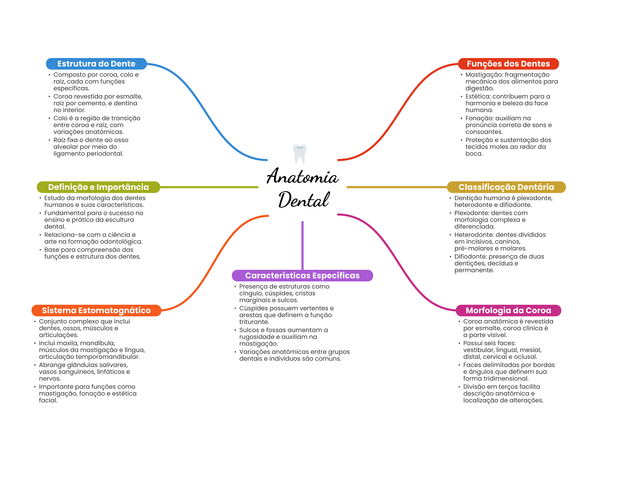 Estrutura do Dente Funções dos Dentes Composto por coroa, colo e Mastigação: fragmentação raiz, cada com funções mecânica dos alimentos para específicas. digestão. Coroa revestida por esmalte, Estética: contribuem para a raiz por cemento, e dentina harmonia e beleza da face no interior. humana. Colo é a região de transição Fonação: auxiliam na entre coroa e raiz, com pronúncia correta de sons e variações anatômicas. consoantes. Raiz fixa dente ao Proteção e sustentação dos alveolar por meio do tecidos moles ao redor da ligamento periodontal. boca. Anatomia Definição e Importância Classificação Dentária Estudo da morfologia dos dentes Dental Dentição humana é plexodonte, humanos e suas características. heterodonte e difiodonte. Fundamental para sucesso no Plexodonte: dentes com ensino e prática da escultura morfologia complexa e dental. diferenciada. Relaciona-se com a ciência e Heterodonte: dentes divididos arte na formação odontológica. em incisivos, caninos, Base para compreensão das pré-molares e molares. funções e estrutura dos dentes. Difiodonte: presença de duas dentições, decídua e permanente. Características Específicas Presença de estruturas como cíngulo, cúspides, cristas marginais e sulcos. Sistema Estomatognático Cúspides possuem vertentes e Morfologia da Coroa arestas que definem a função Conjunto complexo que inclui triturante. Coroa anatômica é revestida dentes, músculos e Sulcos e fossas aumentam a por esmalte, coroa clínica é articulações. rugosidade e auxiliam na a parte visível. Inclui maxila, mandíbula, mastigação. Possui seis faces: músculos da mastigação e língua, Variações anatômicas entre grupos vestibular, lingual, mesial, articulação dentais e indivíduos são comuns. distal, cervical e oclusal. Abrange glândulas salivares, Faces delimitadas por bordas vasos sanguíneos, linfáticos e e ângulos que definem sua nervos. forma tridimensional. Importante para funções como Divisão em terços facilita mastigação, fonação e estética descrição anatômica e facial. localização de alterações.