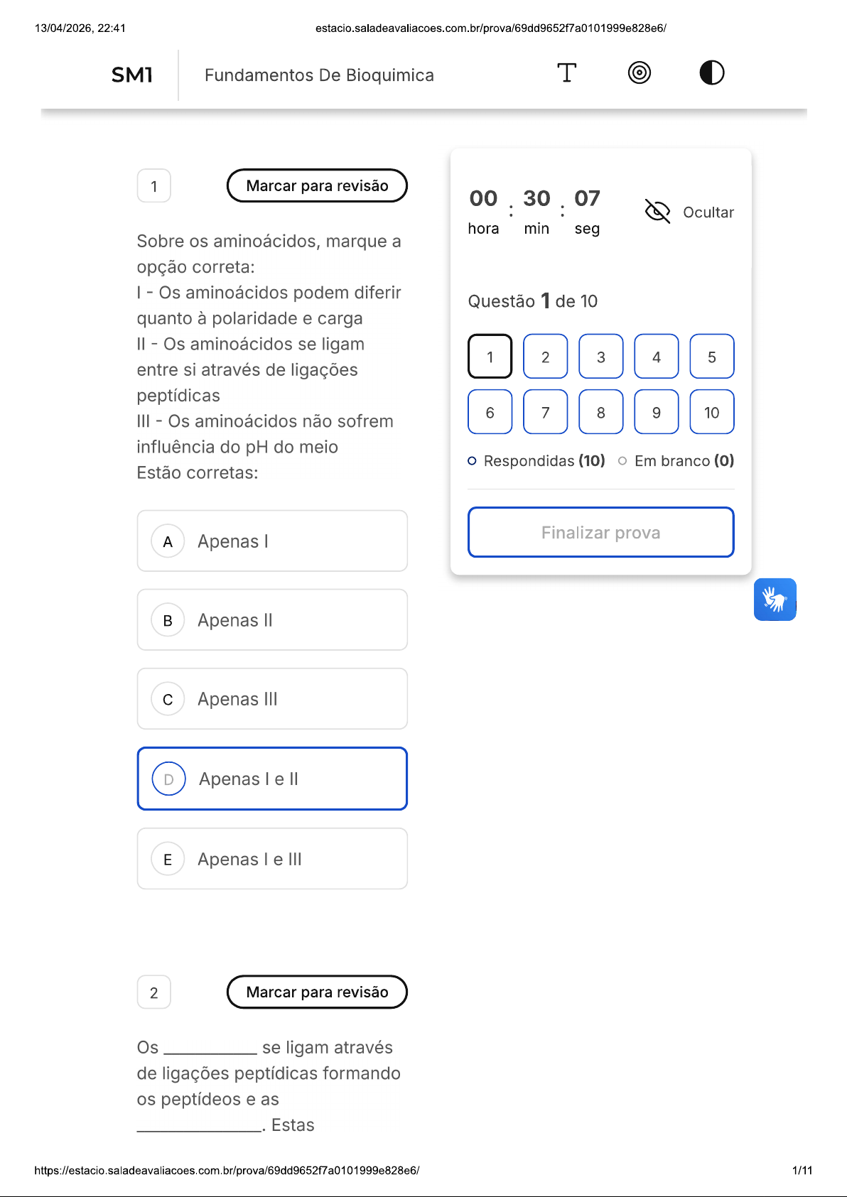 13/04/2026, 22:41 estacio.saladeavaliacoes.com.br/prova/69dd9652f7a0101999e828e6/ SM1 Fundamentos De Bioquimica T 1 Marcar para revisão 00 : 30 : 07 Ocultar hora min seg Sobre os aminoácidos, marque a opção correta: I - Os aminoácidos podem diferir Questão 1 de 10 quanto à polaridade e carga Os aminoácidos se ligam 1 2 3 4 5 entre si através de ligações peptídicas 6 7 8 9 10 III Os aminoácidos não sofrem influência do pH do meio Respondidas (10) Em branco Estão corretas: A Apenas I Finalizar prova Apenas c Apenas III D Apenas I e E Apenas e III 2 Marcar para revisão Os se ligam através de ligações peptídicas formando os peptídeos e as Estas 1/1113/04/2026, 22:41 estacio.saladeavaliacoes.com.br/prova/69dd9652f7a0101999e828e6/ macromoléculas formadas quando possuem atividade catalítica são chamadas de Qual das alternativas abaixo completam as lacunas tornando a afirmativa acima correta? Aminoácidos, proteínas, A enzimas Lipídeos, proteínas, enzimas Aminoácidos, enzimas, c proteínas Açúcares, D proteínas, aminoácidos Aminoácidos, E proteínas, DNA 3 Marcar para revisão As proteínas são macromoléculas sensíveis, que podem sofrer consequências estruturais em razão de elevação de temperatura e alterações de ocasionando alteração estrutural e perda de função. Este processo é chamado de: 2/1113/04/2026, 22:41 estacio.saladeavaliacoes.com.br/prova/69dd9652f7a0101999e828e6/ A Regeneração Apropriação c Desnaturação D Hemólise E Síntese proteica 4 Marcar para revisão Para que uma proteína possa ser aproveitada por um organismo vertebrado, é necessária sua digestão. Nesse processo, a proteína é quebrada em seus constituintes fundamentais, A açúcares aminoácidos c nucleotídeos D polipeptídios E ácidos de amido 3/1113/04/2026, 22:41 estacio.saladeavaliacoes.com.br/prova/69dd9652f7a0101999e828e6/ 5 Marcar para revisão Dentre todas as propriedades presente nos átomos estão número de massa e número atômico do elemento, analise a suposição a seguir: Um átomo de um elemento químico possui 83 prótons, 83 elétrons e 126 nêutrons. Qual é, respectivamente, número atômico e o número de massa desse átomo? A 83 e 209. 83 e 43. c 83 e 83. D 209 e 83. E 43 e 83. 6 Marcar para revisão É esperado para uma enzima: 4/1113/04/2026, 22:41 estacio.saladeavaliacoes.com.br/prova/69dd9652f7a0101999e828e6/ Que ela se ligue apenas A em substratos lipídicos. Que ela se ligue apenas em substratos com característica de material genético. Que elas sejam digeridas em c substituição aos carboidratos. Que elas tenham especificidade com os D substratos e catalisem sua conversão em produto. Que elas atuem E independente do pH do meio reacional 7 Marcar para revisão Sobre os inibidores enzimáticos e os processos de modulação da função enzimática, julgue as alternativas abaixo: 1. Um inibidor é dito competitivo quando apresenta afinidade pelo sítio ativo da enzima e compete com substrato pela ligação. 2. 5/1113/04/2026, 22:41 estacio.saladeavaliacoes.com.br/prova/69dd9652f7a0101999e828e6/ A modulação alostérica positiva é aquela onde um ligante se liga à enzima, no sítio ativo, e eleva a sua afinidade pelo substrato. 3. A modulação alostérica negativa é aquela onde um ligante se liga à enzima, fora do sítio ativo, e reduz a sua afinidade pelo substrato. 4. Um inibidor não competitivo se liga fora do sítio ativo da enzima, entretanto altera a conformação do sítio ativo reduzindo sua afinidade pelo substrato. Representam afirmativa(s) correta(s): A Todas estão corretas Apenas as afirmativas I, III e IV Apenas as afirmativas I c e D Apenas a afirmativa Apenas as afirmativas E e III 8 Marcar para revisão 6/1113/04/2026, 22:41 estacio.saladeavaliacoes.com.br/prova/69dd9652f7a0101999e828e6/ controle do pH é crucial para a capacidade de sobrevivência de organismos vivos, porque até mesmo pequenas variações de pH podem provocar mudanças na forma das enzimas e perda da sua função. (Atkins, P. W.; Jones, L. Princípios de Química: Questionando a Vida Moderna e Meio Ambiente. Ed. 5, Bookman, 2011). Dessa forma, assinale a alternativa correta: Todos os ânions produzem soluções A básicas em solução aquosa devido à hidrólise da água. pH de uma solução de qualquer ácido diprótico pode ser exatamente obtido considerando apenas a primeira ionização. Sistemas tampões são normalmente mais eficientes quando apresentam concentrações equimolares do ácido fraco e da base conjugada. 7/1113/04/2026, 22:41 No cálculo do pH de soluções bastante diluídas de ácidos D fortes, a autoionização da água pode ser desconsiderada. Soluções tampões são formadas por qualquer ácido ou base que E esteja em contato com sais, contendo suas respectivas bases ou ácidos conjugados. 9 Marcar para revisão Em 1909, o termo pH foi introduzido pelo bioquímico dinamarquês Søren Peter Lauritz Sørensen (1868-1939) com objetivo de facilitar seus trabalhos no controle de qualidade de cervejas. pH expressa a concentração de hidrogênios livres em uma solução. Dentre os métodos utilizados para medir pH das soluções em um laboratório de biologia, assinale a alternativa correta: 8/1113/04/2026, 22:41 estacio.saladeavaliacoes.com.br/prova/69dd9652f7a0101999e828e6/ A utilização das fitas indicadoras de pH que possuem mais de uma substância indicadora é A aconselhada quando temos a necessidade de verificar valor exato de pH. Os potenciômetros (ou pHmetros) são sensíveis para a aferição do pH, pois convertem a diferença de potencial elétrico mensurada pelo eletrodo à escala de pH. As substâncias e fitas indicadoras de pH e potenciômetro (ou c pHmetro) são métodos conhecidos como colorimétricos para aferição do pH. 9/1113/04/2026, 22:41 estacio.saladeavaliacoes.com.br/prova/69dd9652f7a0101999e828e6/ Fenolftaleína, azul de bromotimol e azul de tornassol não podem D ser utilizadas como substâncias ind