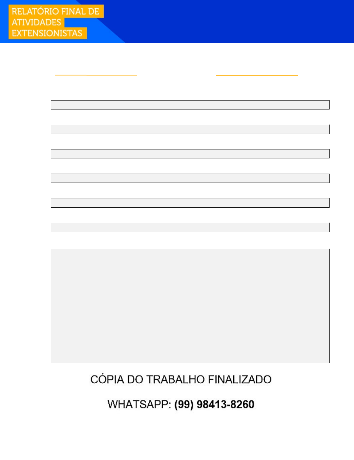 DADOS DO ALUNO: Aluno: [Nome completo] *SOLICITE O ORÇAMENTO: (99) 98413-8260* RA: [Número do RA do aluno] *MODELOS: CÓPIA OU EXCLUSIVO.* POLO / UNIDADE: CURSO: MATEMÁTICA - LICENCIATURA COMPONENTE CURRICULAR: PROJETO DE EXTENSÃO I - MATEMÁTICA PROGRAMA DE EXTENSÃO: PROGRAMA DE INOVAÇÃO E EMPREENDEDORISMO. FINALIDADE E MOTIVAÇÃO: Pelo programa de extensão Inovação e Empreendedorismo o curso de Matemática - Licenciatura, tem a missão de transferir à sociedade os conhecimentos gerados e potencializar a geração de novos conhecimentos aplicados, permitindo o desenvolvimento de ações no âmbito da tecnologia e inovação, que apresentam soluções e produtos para resolução de problemas diversificados presentes no contexto social, trazendo impacto positivo a comunidade contemplada. Ao identificar as problemáticas da comunidade os alunos terão a motivação para efetuar as ações de apoio relacionadas ao curso, pelas quais poderão ser desenvolvidas competências técnicas e soft skills específicas. Os conteúdos programáticos sugeridos para correlacionar as ações são: Tecnologias e inovações em educação; Educação inclusiva e valorização da diversidade; Didática, planejamento e avaliação; Políticas educacionais e ensino. Os locais que poderão contemplar esse projeto são: Escolas; Instituições de Educação Básica; Organizações não governamentais, Associações de bairro, dentre outros. image1.png image2.png