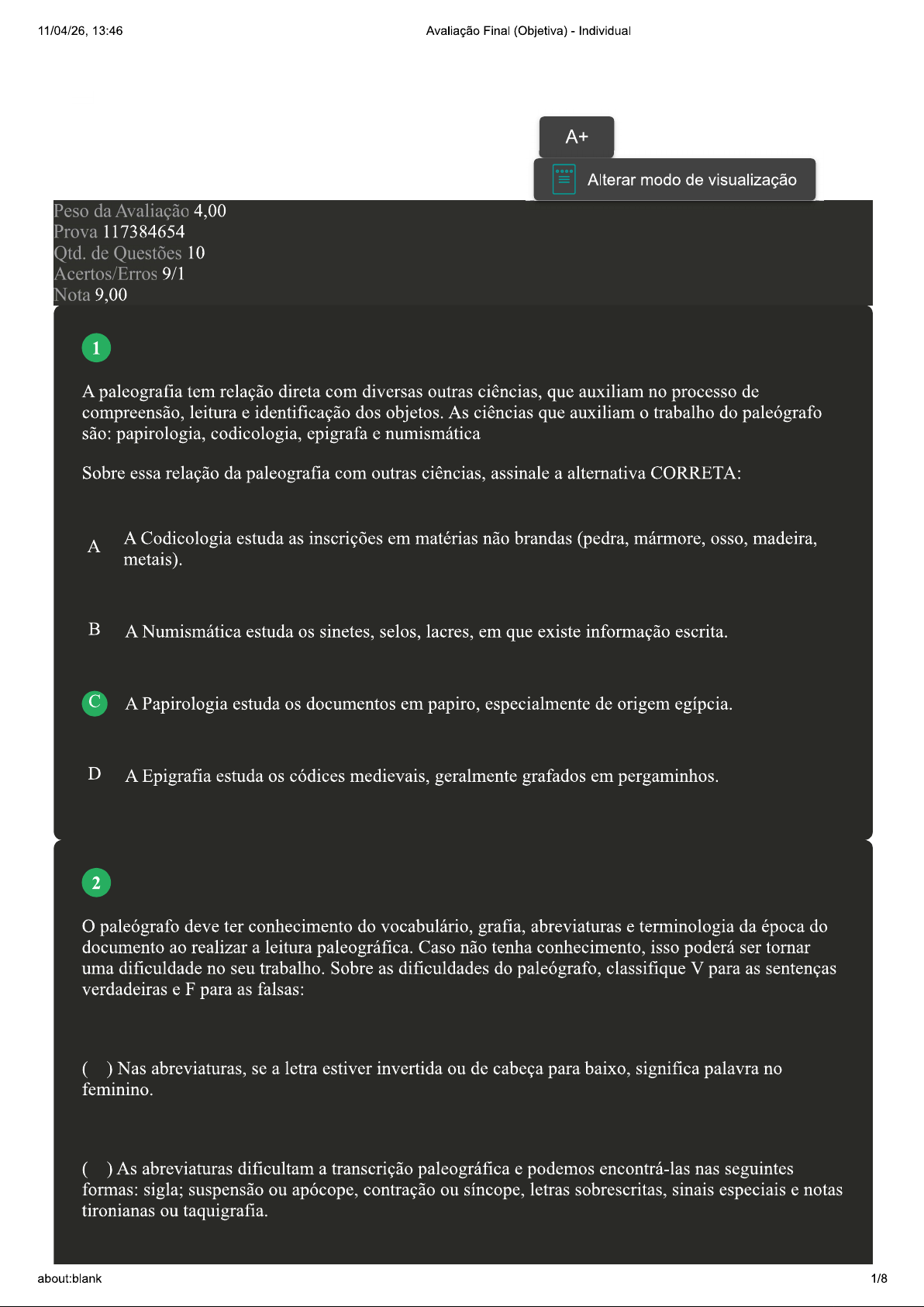 11/04/26, 13:46 Avaliação Final (Objetiva) Individual A+ Alterar modo de visualização Peso da Avaliação 4,00 Prova 117384654 Qtd. de Questões 10 Acertos/Erros 9/1 Nota 9,00 1 A paleografia tem relação direta com diversas outras ciências, que auxiliam no processo de compreensão, leitura e identificação dos objetos. As ciências que auxiliam o trabalho do paleógrafo são: papirologia, codicologia, epigrafa e numismática Sobre essa relação da paleografia com outras ciências, assinale a alternativa CORRETA: A A Codicologia estuda as inscrições em matérias não brandas (pedra, mármore, osso, madeira, metais). A Numismática estuda os sinetes, selos, lacres, em que existe informação escrita. A Papirologia estuda os documentos em papiro, especialmente de origem egípcia. D A Epigrafia estuda os códices medievais, geralmente grafados em pergaminhos. 2 paleógrafo deve ter conhecimento do vocabulário, grafia, abreviaturas e terminologia da época do documento ao realizar a leitura paleográfica. Caso não tenha conhecimento, isso poderá ser tornar uma dificuldade no seu trabalho. Sobre as dificuldades do paleógrafo, classifique V para as sentenças verdadeiras e F para as falsas: Nas abreviaturas, se a letra estiver invertida ou de cabeça para baixo, significa palavra no feminino. As abreviaturas dificultam a transcrição paleográfica e podemos encontrá-las nas seguintes formas: sigla; suspensão ou apócope, contração ou síncope, letras sobrescritas, sinais especiais e notas tironianas ou taquigrafia. about:blank 1/811/04/26, 13:46 Avaliação Final (Objetiva) Individual As letras sobrescritas são locadas no início, meio ou fim da palavra, significando uma sílaba ou ausência de uma letra. Assinale a alternativa que apresenta a sequência CORRETA: A V-V-F. D V-F-F. 3 objeto de estudo da paleografia é o documento manuscrito, que pode ter vários tipos de suporte, como papel, tecido, papiro e pergaminho. No desenvolvimento do trabalho paleográfico, pode-se dividir a paleografia. Sobre essa divisão, associe os itens, utilizando o código a seguir: I- Paleografia diplomática. II- Paleografia bibliográfica. III- Paleografia numismática. IV- Paleografia epigráfica. Estuda a escrita de lápides e inscrições. Estuda o texto de documentos antigos. Estuda inscrições em moedas e medalhas. Estuda gêneros de letras em livros anteriores ao descobrimento da imprensa. about:blank 2/811/04/26, 13:46 Avaliação Final (Objetiva) Individual Assinale a alternativa que apresenta a sequência CORRETA: A I - IV - II - III. B II III - I IV. IV I III II. D III II IV I. 4 A diplomática "é a ciência que nos permite distinguir os documentos autênticos dos falsos ou falsificados e analisar sua tipologia" (BERWANGER; LEAL, 2008, p. 26). Nesse sentido, a diplomática possui diversos termos. Sobre esses termos, associe os itens, utilizando o código a seguir: I- Diploma. II- Diplomatista. III- Documentos diplomáticos. Termo utilizado como designativo de documento régio ou privilégio. De natureza jurídica que refletem ações e relações políticas. Aqueles que estudam, cultivam a diplomática. Assinale a alternativa que apresenta a sequência CORRETA: FONTE: BERWANGER, R.; LEAL, J.E. F. Noções de paleografia e diplomática. 3. ed. Santa Maria: EdUFSM, 2008. A III II I. about:blank 3/811/04/26, 13:46 Avaliação Final (Objetiva) Individual B II I III. I III II. D III I II 5 Ao desenvolver a atividade de leitura paleográfica, o profissional pode encontrar dificuldade relativas ao vocabulário, grafia, abreviaturas e terminologia da época do documento, sendo que essas dificuldades podem atrapalhar na transcrição do documento. Sobre as dificuldades do paleógrafo, classifique V para as sentenças verdadeiras e F para as falsas: a'gua é um exemplo de letras sobrescritas. Ds = Deus é um exemplo de sinais especiais. Cristo é um exemplo de sinais especiais. Assinale a alternativa que apresenta a sequência CORRETA: A V-F-V. D 6 Ao realizar a leitura paleográfica, devemos observar o estado de conservação do documento. Se o documento estiver rasgado, queimado ou com folhas perdidas, não teremos muitos recursos para a sua leitura. Sobre as dificuldades do paleógrafo, classifique V para as sentenças verdadeiras e F para as falsas: about:blank 4/811/04/26, 13:46 Avaliação Final (Objetiva) Individual Antes de chegar às mãos do paleógrafo, é necessário que os códices passem pelos cuidados do restaurador para eliminar as dificuldades que o leitor teria com a o descolamento de folhas grudadas e a limpeza do documento. A tinta corrosiva é outro problema na leitura do paleógrafo, isto porque corta a base da escrita ao longo das linhas traçadas pela pena, transformando o papel ou o pergaminho em autêntica renda, de difícil ou impossível decifração. A limpeza faz parte das tarefas adicionais que o paleógrafo terá a seu cargo, se não contar com os serviços de um restaurador. Assinale a alternativa que apresenta a sequência CORRETA: A D 7 Desde os tempos mais primitivos, o homem lançou mão dos mais variados materiais para deixar expressas as suas ideias. barro é tido como o primeiro material utilizado para o registro da escrita. Os materiais e instrumentos da escrita eram originários dos três reinos da natureza: animal, vegetal e mineral. Sobre os materiais utilizados para o registro, assinale a alternativa CORRETA: A homem usava diversos materiais para o registro, como o barro, a argila, a terracota, a tabuinha, o papiro, a folha de árvore, com exceção da casca da árvore. B linho era usado pelos egípcios e pelos gregos como material de registro. A terracota é produzida a partir do cozimento do barro e possui cores diversa por causa do barro utilizado no seu preparo. about:blank 5/811/04/26, 13:46 Avaliação Final (Objetiva) Individual D primeiro material que serviu para o registro foi o pergaminho. Revisar Conteúdo do Livro 8 A palavra escrit