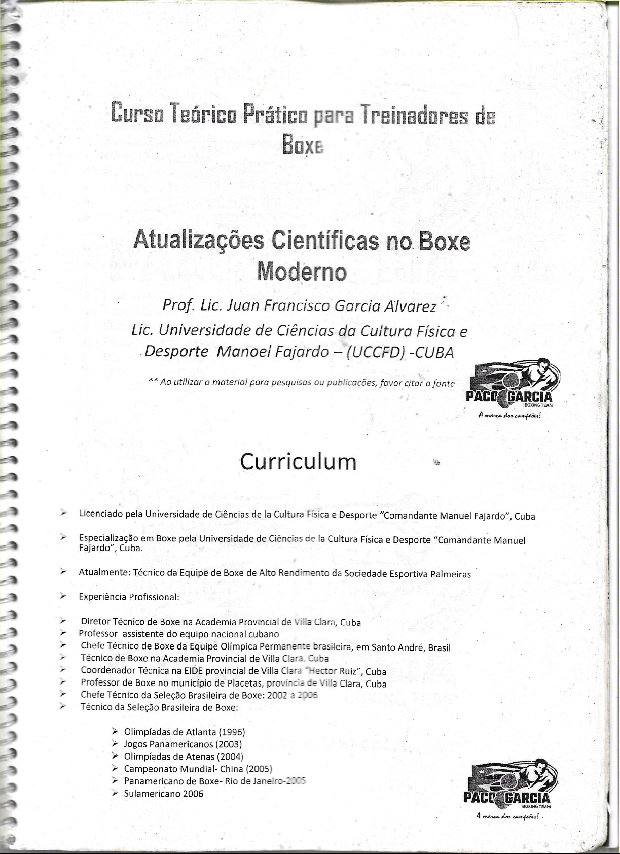 Curso Teórico Prático para Treinadores de Boxe Atualizações Científicas no Boxe Moderno Prof. Lic. Juan Francisco Garcia Alvarez Lic. Universidade de Ciências da Cultura Física e Desporte Manoel Fajardo (UCCFD) -CUBA ** Ao utilizar material para pesquisas ou publicações, favor citar a fonte GARCIA BOXING TEAM A dor Curriculum Licenciado pela Universidade de Ciências de la Cultura Física e Desporte "Comandante Manuel Fajardo", Cuba Especialização em Boxe pela Universidade de Ciências de la Cultura Física e Desporte "Comandante Manuel Fajardo", Cuba. Atualmente: Técnico da Equipe de Boxe de Alto Rendimento da Sociedade Esportiva Palmeiras Experiência Profissional: Diretor Técnico de Boxe na Academia Provincial de Villa Clara, Cuba Professor assistente do equipo nacional cubano Chefe Técnico de Boxe da Equipe Olímpica Permanente brasileira, em Santo André, Brasil Técnico de Boxe na Academia Provincial de Villa Clara, Cuba Coordenador Técnica na EIDE provincial de Villa Clara Hector Ruiz", Cuba Professor de Boxe no município de Placetas, província de Villa Clara, Cuba Chefe Técnico da Seleção Brasileira de Boxe: 2002 a 2006 Técnico da Seleção Brasileira de Boxe: Olimpíadas de Atlanta (1996) Jogos Panamericanos (2003) Olimpíadas de Atenas (2004) Campeonato Mundial- China (2005) Panamericano de Boxe- Rio de Janeiro-2005 Sulamericano 2006 GARCIA BOXING TEAM A marcaPrincipais Atletas Treinados Acelino "Popó" Freitas Lino Barros Aguinaldo Nunes Everton Lopes Pedro Lima Rafael Lima Washington Luiz Robson Conceição Yamagushi Falcão Rodrigo Minotauro Rogério Minotouro Anderson Silva Victor Belfort Demian Maia Fábio Maldonado Lucas Martins Paulo Soares Vários atletas campeões Pan-americanos, Mundiais e Olímpicos em Cuba GARCIA BOXING TEAM A marca Qual a importância desse Curso? Potencializar conhecimentos para formar boxeador moderno GARCIA BOXING TEAM A marca dosClassificação dos golpes (R)Rosto e (C) Corpo 1-DIREITO DE ESQUERDA NO (R) NO (C) 2-DIREITO DE DIREITA NO (R) NO (C) 3-GANCHO DE ESQUERDA NO (R) NO (C) 4-GANCHO DE DIREITA NO (R) NO (C) 5-CRUZADO DE ESQUERDA NO (R) NO (C) 6-CRUZADO DE DIREITA NO (R) NO (C) GARCIA BOXING TEAM A marca REGRAS DE OURO ENSINAR OS GOLPES esticar os braços para trabalhar a memória muscular. Coordenar braços e pernas, sempre Golpear e mexer-se, sair em outro ângulo, fazer uma defesa Respirar em cada golpe e expirar no último golpe, com força, sendo que essa estratégia pode ser utilizada como finta. GARCIA BOXING TEAM A march dosDicas importantes Lembrem: a precisão supera a força e timing ganha da velocidade, Atirar golpes pode ser melhor para seu adversário que para você Por que? toda ação de ataque tem um contra golpe, tiram energia te desgasta Devemos ensinar nossos atletas a preparar os ataques de maneira adequada e precisa Impacto deve ser com a parte da frente (falange) É importante alinhar punho com cotovelo para evitar lesões. GARCIA BOXING TEAM A marca Elementos básicos no boxe e ordem de aprendizado aplicando estratégias 1-Posiçao de guarda (Universal) 2-Deslocamentos 3-Giros, passos compostos, shuffles(cortar passo, buscar posição, manter presença. 4-Golpes retos e suas defesas (mão da frente parar ataques dos adversários) 5-Ganchos e suas defesas (não muito observado por árbitros- destroem a preparação física do atleta- golpeia o corpo que a cabeça cai GARCIA BOXING TEAM A mercaContinua Elementos básicos no boxe e ordem de aprendizado aplicando estratégias 6- Cruzados e suas defesas (são os golpes que mais dão ko) 7- Combinações (Golpes preparadores sempre com propósitos de atacar, contra-atacar e se defender, misturando golpes em linhas, circulares, corpo- cabeça e vice-versa. os golpes no corpo produzem resultados no decorrer da luta As defesas devem ser nas extremidades superiores, com tronco, Nas extremidades inferiores com as pernas- mantendo balanço GARCIA BOXING TEAM A marca COMO DOMINAR O GOLPE MAIS IMPORTANTE DO BOXE O jab exige uma boa base (A PARADA DE COMBATE) Uma correta mecânica do golpe na hora de executar o movimento: devemos baixar centro da gravidade para incrementar a força no golpe Os golpes no tronco são necessários para in desgastando nosso adversário fisicamente Os jabs devem ser lançados com um Propósito: Estudar o oponente, criar oportunidade para ataques, abrir espaço, controlar a distância, etc. Como são muito fáceis de serem contra-atacados não podem ser previsíveis - deve-se sempre utilizar Fintas GARCIA BOXING TEAM A marca dosAS DUAS VARIAÇÕES DO JAB: RÁPIDOS E FORTES Os RÁPIDOS: correspondem a 80% dos golpes JAB TRADICIONAL Misturando com 0 preparador, muito interessante para terminar com golpes finalizadores JAB COM O POLEGAR PARA CIMA: interessante por não ter que mexer cotovelos e ombros - indicadores que os boxeadores devem conhecer- Sempre procurar alinhar ombro JAB DE BAIXO PARA CIMA - objetivo é levantar a cabeça do oponente- Girando o quadril levemente, flexionando ligeiramente as pernas JAB COMO UM CHICOTE-e não como uma Espada (Floyd) GARCIA BOXING TEAM A marca dos Continuação: FORTES (correspondem a 20% dos golpes) 1-JAB DE FORÇA COM DESLOCAMENTO: Impulsionando com a perna de trás 2-JAB DE FORÇA CARREGADO: Gira 0 corpo para a esquerda voltando com explosão 3-JAB DE FORÇA TRADICIONAL: Girando pé esquerdo (MEKY GARCIA, CANELO, GG) GARCIA BOXING TEAM ACOMBINAÇÕES MAIS IMPORTANTES DO BOXE 1-2 - por ser uma combinação fácil, rápida, eficiente e segura ERROS MAIS COMUNS: Atacar em linha reta, querendo passar por cima da guarda do oponente (deve-se encontrar posição antes de atacar e nunca o contrário) Colocar corpo para frente na hora de golpear (mais difícil para sair) Não andar pé de trás - andar apenas 0 pé da frente Fazer muita força no JAB faz alongar 0 tempo latente golpe 1 = = JAB- deve ser RÁPIDO, e 2 (Reto de Direita) deve ser lançado com POTÊNCIA) Deve-se melhorar TIMING - momento 