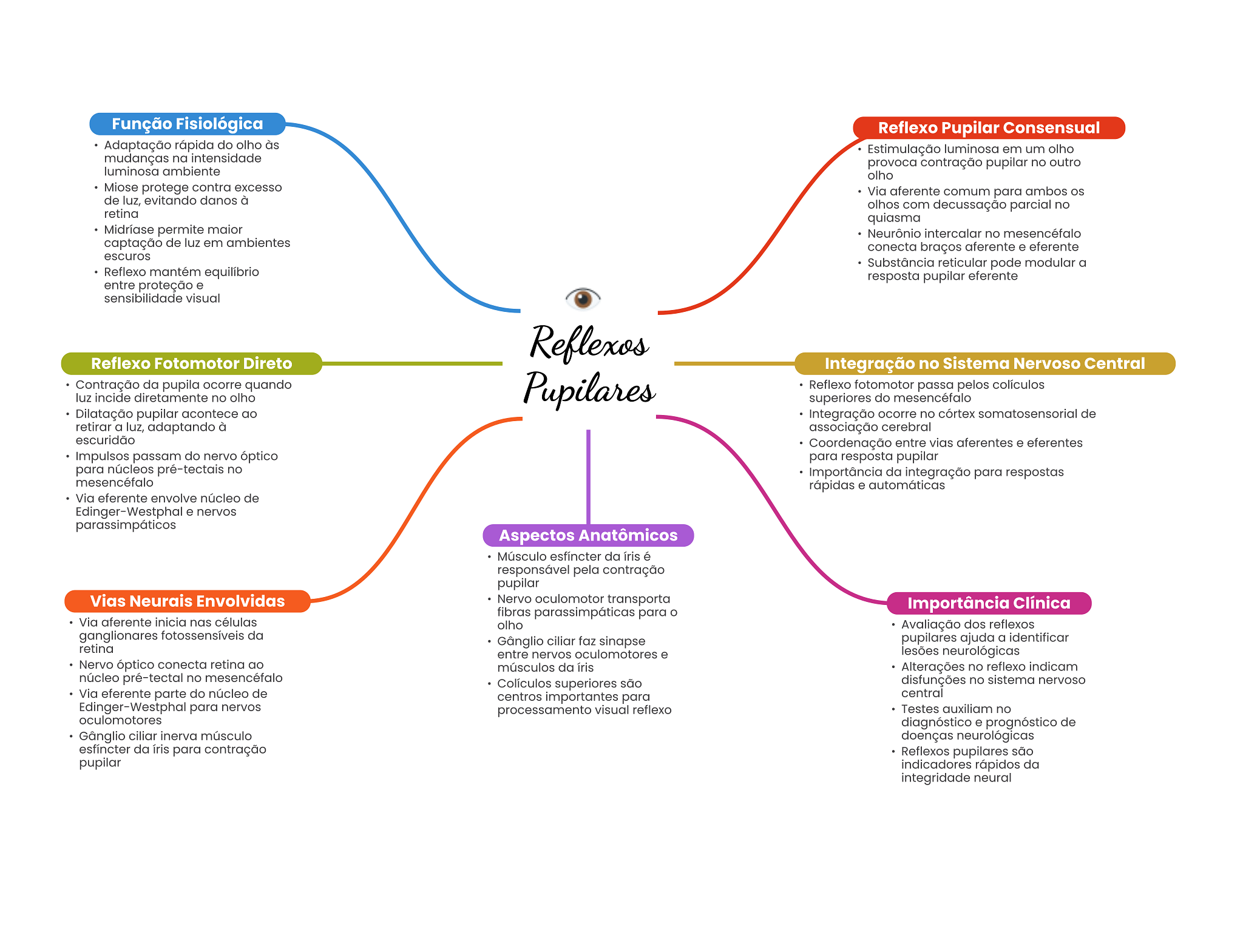 Função Fisiológica Reflexo Pupilar Consensual Adaptação rápida do olho às Estimulação luminosa em um olho mudanças na intensidade provoca contração pupilar no outro luminosa ambiente olho Miose protege contra excesso Via aferente comum para ambos de luz, evitando danos à olhos com decussação parcial no retina quiasma Midríase permite maior Neurônio intercalar no mesencéfalo captação de luz em ambientes conecta braços aferente e eferente escuros Substância reticular pode modular a Reflexo mantém equilíbrio resposta pupilar eferente entre proteção e sensibilidade visual Reflexos Reflexo Fotomotor Direto Integração no Sistema Nervoso Central Contração da pupila ocorre quando Pupilares Reflexo fotomotor passa pelos colículos luz incide diretamente no olho superiores do mesencéfalo Dilatação pupilar acontece ao Integração ocorre no córtex de retirar a luz, adaptando à associação cerebral escuridão Coordenação entre vias aferentes e eferentes Impulsos passam do nervo óptico para resposta pupilar para núcleos pré-tectais no Importância da integração para respostas mesencéfalo rápidas e automáticas Via eferente envolve núcleo de Edinger-Westphal e nervos parassimpáticos Aspectos Anatômicos Músculo esfíncter da íris é responsável pela contração pupilar Vias Neurais Envolvidas Nervo oculomotor transporta Importância Clínica fibras parassimpáticas para O Via aferente inicia nas células olho Avaliação dos reflexos ganglionares fotossensíveis da Gânglio ciliar faz sinapse pupilares ajuda a identificar retina entre nervos oculomotores e lesões neurológicas Nervo óptico conecta retina ao músculos da Alterações no reflexo indicam núcleo pré-tectal no mesencéfalo Colículos superiores são disfunções no sistema nervoso Via eferente parte do núcleo de centros importantes para central Edinger-Westphal para nervos processamento visual reflexo Testes auxiliam no oculomotores diagnóstico e prognóstico de Gânglio ciliar inerva músculo doenças neurológicas esfíncter da íris para contração Reflexos pupilares são pupilar indicadores rápidos da integridade neural