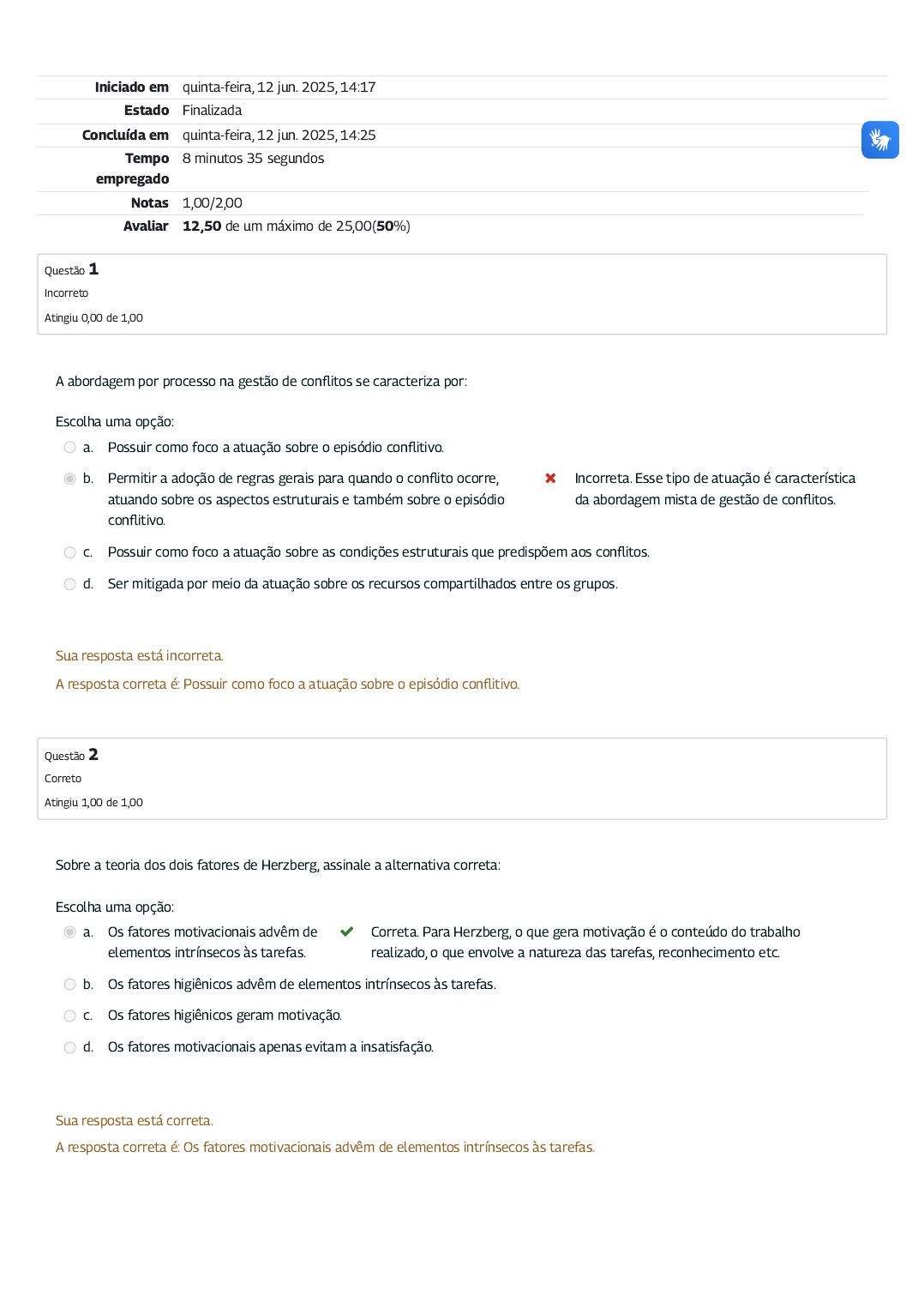 Iniciado em quinta-feira, 12 jun. 2025, 14:17 Estado Finalizada Concluída em quinta-feira, 12 jun. 2025, 14:25 Tempo empregado 8 minutos 35 segundos Notas 1,00/2,00 Avaliar 12,50 de um máximo de 25,00(50%) Questão 1 Incorreto Atingiu 0,00 de 1,00 Questão 2 Correto Atingiu 1,00 de 1,00 A abordagem por processo na gestão de conflitos se caracteriza por: Escolha uma opção: a. Possuir como foco a atuação sobre o episódio conflitivo. b. Permitir a adoção de regras gerais para quando o conflito ocorre, atuando sobre os aspectos estruturais e também sobre o episódio conflitivo. Incorreta. Esse tipo de atuação é característica da abordagem mista de gestão de conflitos. c. Possuir como foco a atuação sobre as condições estruturais que predispõem aos conflitos. d. Ser mitigada por meio da atuação sobre os recursos compartilhados entre os grupos. Sua resposta está incorreta. A resposta correta é: Possuir como foco a atuação sobre o episódio conflitivo. Sobre a teoria dos dois fatores de Herzberg, assinale a alternativa correta: Escolha uma opção: a. Os fatores motivacionais advêm de elementos intrínsecos às tarefas. Correta. Para Herzberg, o que gera motivação é o conteúdo do trabalho realizado, o que envolve a natureza das tarefas, reconhecimento etc. b. Os fatores higiênicos advêm de elementos intrínsecos às tarefas. c. Os fatores higiênicos geram motivação. d. Os fatores motivacionais apenas evitam a insatisfação. Sua resposta está correta. A resposta correta é: Os fatores motivacionais advêm de elementos intrínsecos às tarefas.