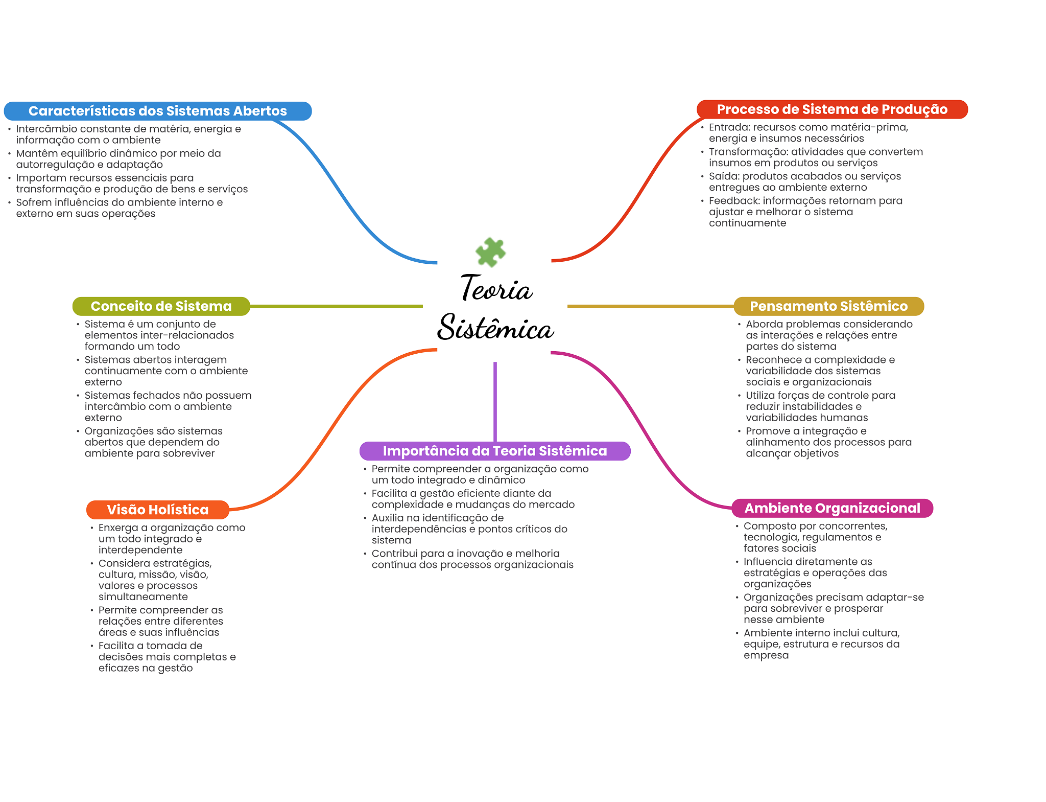 Características dos Sistemas Abertos Processo de Sistema de Produção Intercâmbio constante de matéria, energia e Entrada: recursos como matéria-prima, informação com ambiente energia e insumos necessários Mantêm equilíbrio dinâmico por meio da Transformação: atividades que convertem autorregulação e adaptação insumos em produtos ou serviços Importam recursos essenciais para Saída: produtos acabados ou serviços transformação e produção de bens e serviços entregues ao ambiente externo Sofrem influências do ambiente interno e Feedback: informações retornam para externo em suas operações ajustar e melhorar sistema continuamente Teoria Conceito de Sistema Pensamento Sistêmico Sistema é um conjunto de elementos inter-relacionados Sistêmica Aborda problemas considerando as interações e relações entre formando um todo partes do sistema Sistemas abertos interagem Reconhece a complexidade e continuamente com ambiente variabilidade dos sistemas externo sociais e organizacionais Sistemas fechados não possuem Utiliza forças de controle para intercâmbio com ambiente reduzir instabilidades e externo variabilidades humanas Organizações são sistemas Promove a integração e abertos que dependem do alinhamento dos processos para ambiente para sobreviver Importância da Teoria Sistêmica alcançar objetivos Permite compreender a organização como um todo integrado e dinâmico Facilita a gestão eficiente diante da Visão Holística complexidade e mudanças do mercado Ambiente Organizacional Auxilia na identificação de Enxerga a organização como e pontos críticos do Composto por concorrentes, um todo integrado e sistema tecnologia, regulamentos e interdependente fatores sociais Contribui para a inovação e melhoria Considera estratégias, contínua dos processos organizacionais Influencia diretamente as cultura, missão, visão, estratégias e operações das valores e processos organizações simultaneamente Organizações precisam adaptar-se Permite compreender as para sobreviver e prosperar relações entre diferentes nesse ambiente áreas e suas influências Ambiente interno inclui cultura, Facilita a tomada de equipe, estrutura e recursos da decisões mais completas e empresa eficazes na gestão