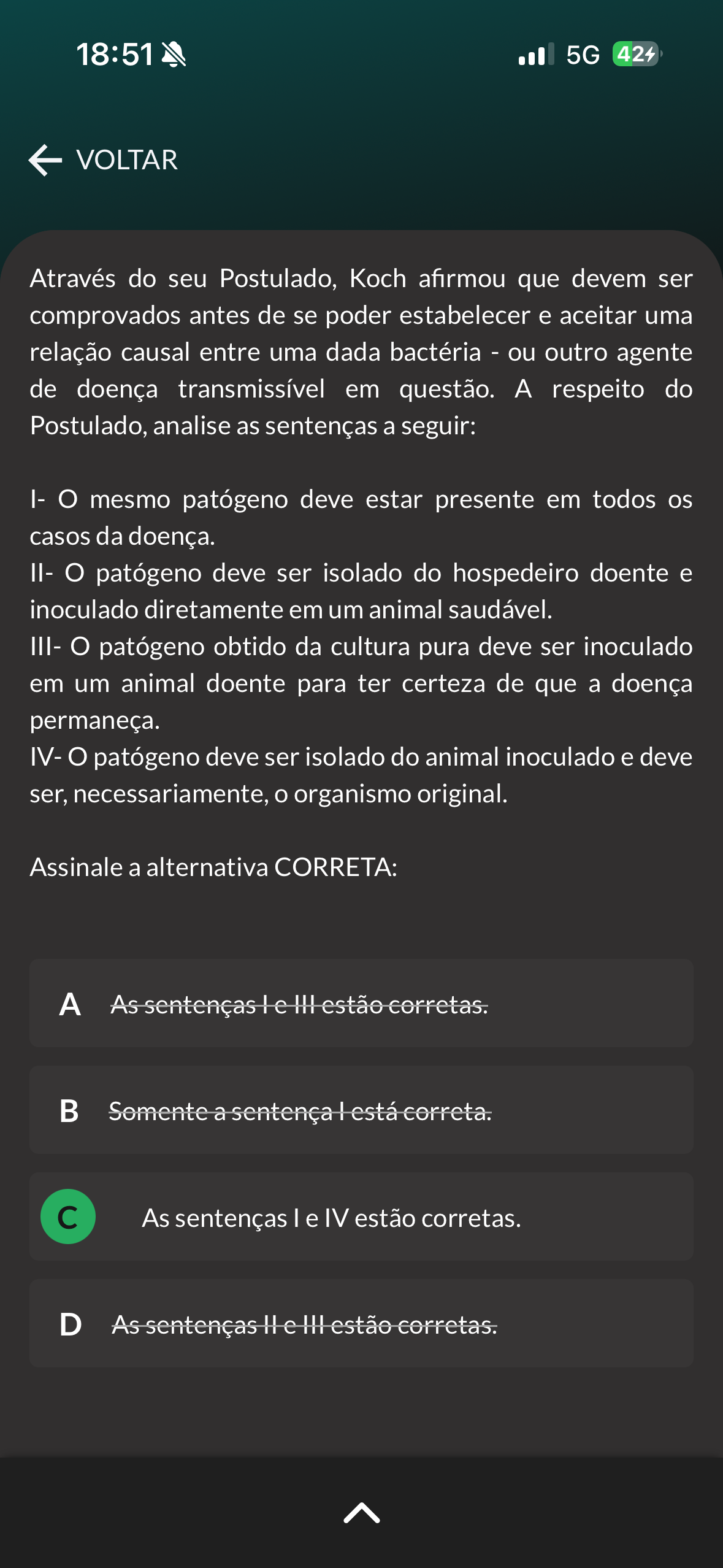 18:51 5G 424 VOLTAR Através do seu Postulado, Koch afirmou que devem ser comprovados antes de se poder estabelecer e aceitar uma relação causal entre uma dada bactéria ou outro agente de doença transmissível em questão. A respeito do Postulado, analise as sentenças a seguir: I- mesmo patógeno deve estar presente em todos os casos da doença. II- patógeno deve ser isolado do hospedeiro doente e inoculado diretamente em um animal saudável. III- patógeno obtido da cultura pura deve ser inoculado em um animal doente para ter certeza de que a doença permaneça. IV- patógeno deve ser isolado do animal inoculado e deve ser, necessariamente, organismo original. Assinale a alternativa CORRETA: As sentenças le III estão corretas. Somente a sentença está correta. As sentenças I e IV estão corretas. D As sentenças III estão corretas.