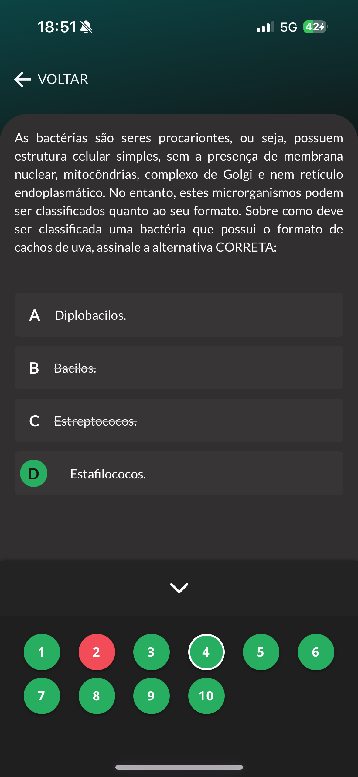 18:51 5G 424 VOLTAR As bactérias são seres procariontes, ou seja, possuem estrutura celular simples, sem a presença de membrana nuclear, mitocôndrias, complexo de Golgi e nem retículo endoplasmático. No entanto, estes microrganismos podem ser classificados quanto ao seu formato. Sobre como deve ser classificada uma bactéria que possui formato de cachos de uva, assinale a alternativa CORRETA: A Diplobacilos. Bacilos. c Estreptococos. D Estafilococos. 1 2 3 4 5 6 7 8 9 10
