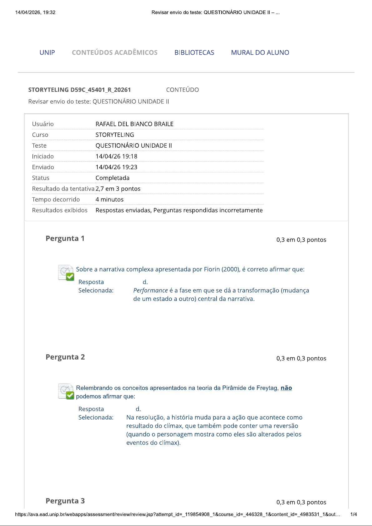14/04/2026, 19:32 Revisar envio do teste: QUESTIONÁRIO UNIDADE UNIP CONTEÚDOS ACADÊMICOS BIBLIOTECAS MURAL DO ALUNO STORYTELING D59C_45401_R_20261 CONTEÚDO Revisar envio do teste: QUESTIONÁRIO UNIDADE Usuário RAFAEL DEL BIANCO BRAILE Curso STORYTELING Teste QUESTIONÁRIO UNIDADE Iniciado 14/04/26 19:18 Enviado 14/04/26 19:23 Status Completada Resultado da tentativa 2,7 em 3 pontos Tempo decorrido 4 minutos Resultados exibidos Respostas enviadas, Perguntas respondidas incorretamente Pergunta 1 0,3 em 0,3 pontos Sobre a narrativa complexa apresentada por Fiorin (2000), é correto afirmar que: Resposta d. Selecionada: Performance é a fase em que se dá a transformação (mudança de um estado a outro) central da narrativa. Pergunta 2 0,3 em 0,3 pontos Relembrando os conceitos apresentados na teoria da Pirâmide de Freytag, não podemos afirmar que: Resposta d. Selecionada: Na resolução, a história muda para a ação que acontece como resultado do clímax, que também pode conter uma reversão (quando personagem mostra como eles são alterados pelos eventos do clímax). Pergunta 3 0,3 em 0,3 pontos 1/414/04/2026, 19:32 Revisar envio do teste: QUESTIONÁRIO UNIDADE Sandrini (2021) apresenta que uma estrutura narrativa é composta pelos seguintes elementos: Resposta a. Selecionada: Situação inicial, Conflito, Desenvolvimento, Clímax e Desfecho. Pergunta 4 0,3 em 0,3 pontos Considerando os entendimentos apresentados no método da jornada do herói, é incorreto afirmar que: Resposta d. Selecionada: É mesmo que a viagem do herói; então, é aplicada, apenas, nos casos em que personagem principal precisa viajar de um local a outro. Pergunta 5 0 em 0,3 pontos Sobre conceito de arquétipos, não podemos afirmar que: Resposta d. Selecionada: São conjuntos de imagens primordiais que dão sentido às histórias passadas entre as gerações, formando conhecimento e imaginário inconsciente coletivo. Pergunta 6 0,3 em 0,3 pontos Analise a frase a seguir: "Matrix é um filme de 1999, que se passa em um futuro próximo, Thomas Anderson (Keanu Reeves), um jovem programador de computador que mora em um cubículo e scuro [...]. Fonte: 2/414/04/2026, 19:32 Revisar envio do teste: QUESTIONÁRIO UNIDADE A afirmação anterior refere-se ao seguinte momento da jornada do herói: Resposta Selecionada: b. Mundo comum. Pergunta 7 0,3 em 0,3 pontos Podemos afirmar que a provação difícil ou traumática é momento da jornada do herói em que: Resposta Selecionada: É a maior crise da aventura, da vida ou da morte. a. Pergunta 8 0,3 em 0,3 pontos A afirmação "são as responsáveis pelas ações da história e podem ser classificadas de acordo com diferentes critérios", refere-se: Resposta Selecionada: C. Aos personagens. Pergunta 9 0,3 em 0,3 pontos No contexto dos elementos constitutivos da narrativa, Sandrini (2021) afirma que "existem elementos comuns às histórias, por mais diferentes que sejam". São eles: Resposta Selecionada: a. Enredo, narrador, personagens, espaço, tempo. Pergunta 10 0,3 em 0,3 pontos Torrance (1976) afirma que a "Criatividade é processo de tornar-se sensível aos problemas, às deficiências, às lacunas no conhecimento, à desarmonia; identificar a dificuldade, buscar soluções, formulando hipóteses a respeito das deficiências; testar e retestar estas hipóteses; e, finalmente, comunicar os resultados". 3/414/04/2026, 19:32 Revisar envio do teste: QUESTIONÁRIO UNIDADE Podemos afirmar que: Resposta C. Selecionada: Criatividade é um elemento metodológico, ainda que inato aos seres humanos, e pode ser fomentado e alimentado. Terça-feira, 14 de Abril de 2026 19h32min00s GMT-03:00 OK 4/4