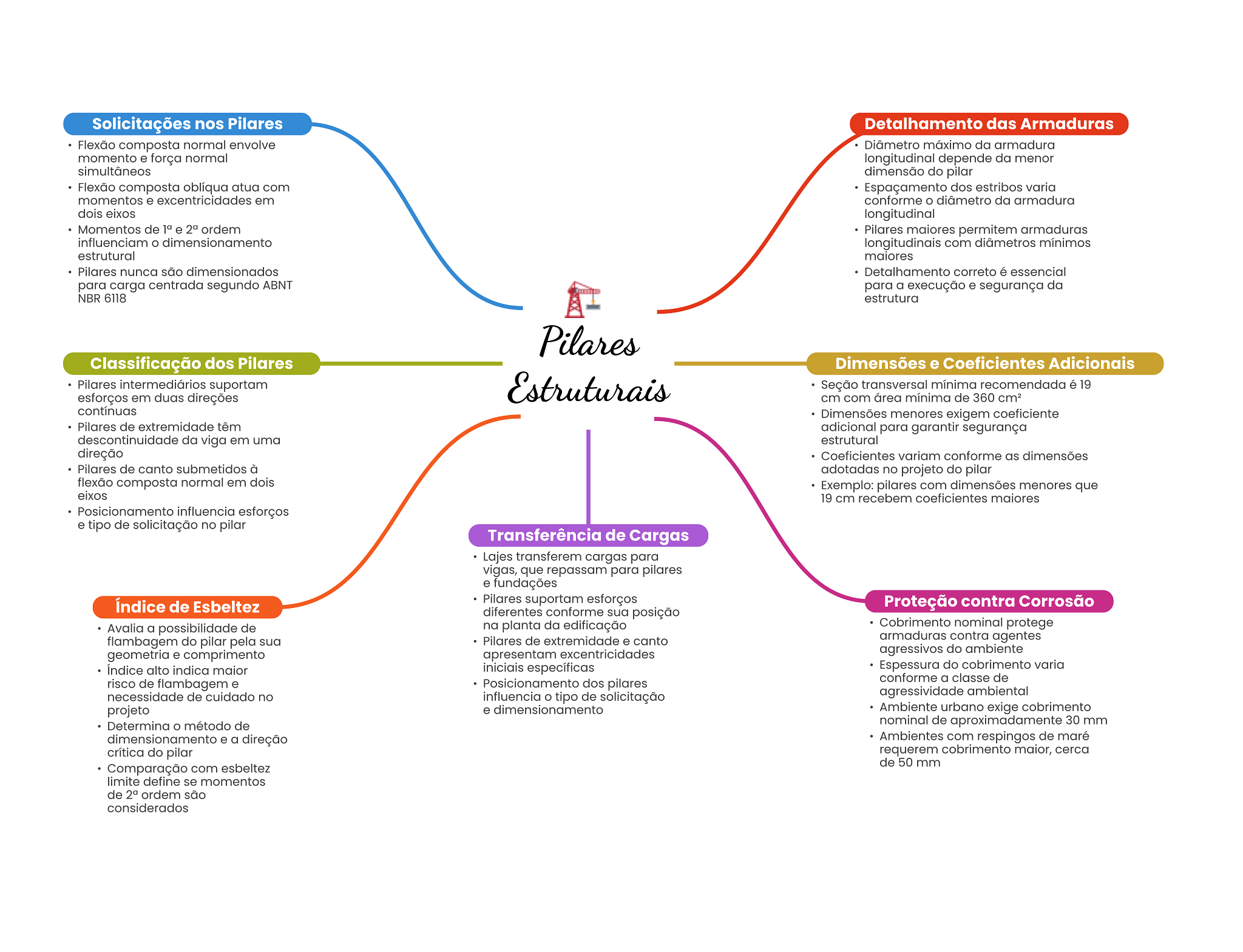 Solicitações nos Pilares Detalhamento das Armaduras Flexão composta normal envolve Diâmetro máximo da armadura momento e força normal longitudinal depende da menor simultâneos dimensão do pilar Flexão composta oblíqua atua com Espaçamento dos estribos varia momentos e excentricidades em conforme diâmetro da armadura dois eixos longitudinal Momentos de e ordem Pilares maiores permitem armaduras influenciam dimensionamento longitudinais com diâmetros mínimos estrutural maiores Pilares nunca são dimensionados Detalhamento correto é essencial para carga centrada segundo ABNT para a execução e segurança da NBR 6118 estrutura Pilares Classificação dos Pilares Dimensões e Coeficientes Adicionais Pilares intermediários suportam Estruturais Seção transversal mínima recomendada é 19 esforços em duas direções cm com área mínima de 360 contínuas Dimensões menores exigem coeficiente Pilares de extremidade têm adicional para garantir segurança descontinuidade da viga em uma estrutural direção Coeficientes variam conforme as dimensões Pilares de canto submetidos à adotadas no projeto do pilar flexão composta normal em dois Exemplo: pilares com dimensões menores que eixos 19 cm recebem coeficientes maiores Posicionamento influencia esforços e tipo de solicitação no pilar Transferência de Cargas Lajes transferem cargas para vigas, que repassam para pilares e fundações Índice de Esbeltez Pilares suportam esforços Proteção contra Corrosão diferentes conforme sua posição Avalia a possibilidade de na planta da edificação Cobrimento nominal protege flambagem do pilar pela sua Pilares de extremidade e canto armaduras contra agentes geometria e comprimento apresentam excentricidades agressivos do ambiente Indice alto indica maior iniciais específicas Espessura do cobrimento varia conforme a classe de risco de flambagem e Posicionamento dos pilares necessidade de cuidado no influencia tipo de solicitação agressividade ambiental projeto e dimensionamento Ambiente urbano exige cobrimento Determina método de nominal de aproximadamente 30 mm dimensionamento e a direção Ambientes com respingos de maré crítica do pilar requerem cobrimento maior, cerca de 50 mm Comparação com esbeltez limite define se momentos de ordem são considerados