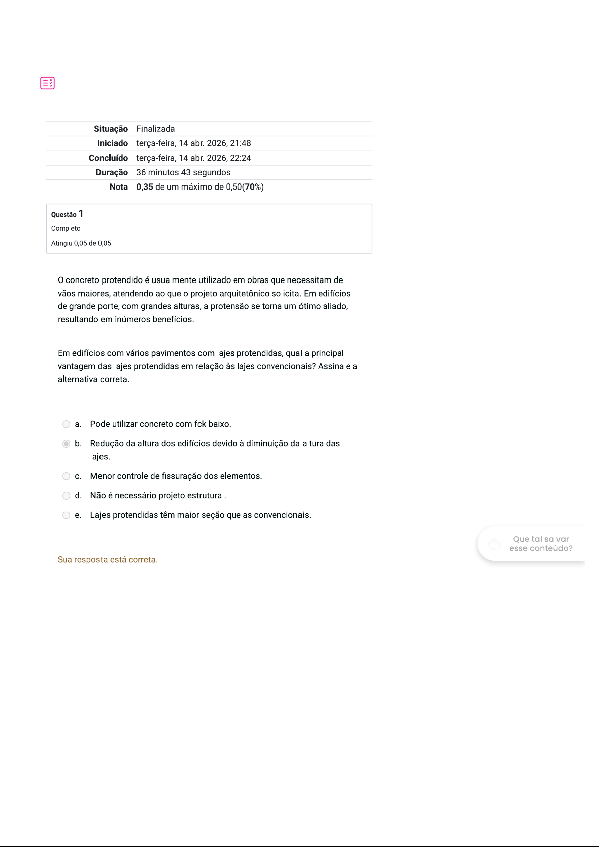 Situação Finalizada Iniciado terça-feira, 14 abr. 2026, 21:48 Concluído terça-feira, 14 abr. 2026, 22:24 Duração 36 minutos 43 segundos Nota 0,35 de um máximo de 0,50(70%) Questão 1 Completo Atingiu 0,05 de 0,05 concreto protendido é usualmente utilizado em obras que necessitam de vãos maiores, atendendo ao que o projeto arquitetônico solicita. Em edifícios de grande porte, com grandes alturas, a protensão se torna um ótimo aliado, resultando em inúmeros benefícios. Em edifícios com vários pavimentos com lajes protendidas, qual a principal vantagem das lajes protendidas em relação às lajes convencionais? Assinale a alternativa correta. a. Pode utilizar concreto com fck baixo. b. Redução da altura dos edifícios devido à diminuição da altura das lajes. Menor controle de fissuração dos elementos. d. Não é necessário projeto estrutural. e. Lajes protendidas têm maior seção que as convencionais. Que tal salvar esse conteúdo? Sua resposta está correta.Questão 2 Completo Atingiu 0,05 de 0,05 0 concreto protendido é utilizado em diversas obras, seus benefícios são inúmeros. concreto protendido pode ser realizado em obras in loco, contendo um controle de qualidade adequado e pode ser um elemento pré-moldado, contendo também um grande controle de qualidade em seu processo construtivo. Onde é uma das principais utilidades do concreto protendido? Assinale a alternativa correta. a. Placas de fechamento em concreto. b. Lajes em balanço com vão pequeno. Pontes, vigas e lajes com grandes vãos. d. Paredes em blocos estruturais. e. Paredes de alvenaria. Sua resposta está correta. Que tal salvar esse conteúdo?Questão 3 Completo Atingiu 0,05 de 0,05 No concreto protendido, os aços para armaduras ativas são classificados de acordo com seu tipo de tratamento, a fim de melhorar suas propriedades mecânicas e garantir um desempenho eficiente nas estruturas protendidas. A relaxação do aço é um tipo de tratamento, resultando em relaxação baixa (RB) ou relaxação normal (RN). De acordo com estudo da unidade II, os aços para armaduras ativas possuem uma designação genérica. Qual a alternativa correta para a designação genérica CP 190 (RN)? a. Cordoalha para concreto protendido, aço de resistência mínima à ruptura por tração de 190 e relaxação baixa. b. Cordoalha para concreto armado, aço de resistência mínima à ruptura por tração de 190 e relaxação normal. Cordoalha para concreto protendido, aço de resistência mínima à ruptura por tração de 180 e relaxação normal. d. Cordoalha para concreto protendido, aço de resistência mínima à ruptura por tração de 190 e relaxação normal. e. Fios para concreto protendido, aço de resistência mínima à ruptura por tração de 190 e relaxação normal. Sua resposta está correta. Que tal salvar esse conteúdo?Questão 4 Completo Atingiu 0,05 de 0,05 0 dimensionamento de uma estrutura protendida deve ser validado em diversas verificações para garantir a segurança, durabilidade e desempenho da estrutura. A protensão completa, como objeto de estudo na unidade II, não admite nenhuma fissuração por estar inserida em um ambiente agressivo. As estruturas são submetidas a esforços de peso próprio, cargas acidentais e de protensão. A protensão completa em seu dimensionamento deve resistir a apenas qual tipo de esforço? Assinale a alternativa correta. a. Apenas esforços de tração. b. Apenas esforços de compressão. Resistir mais a esforços de tração que de compressão. d. Resistir mais a esforços de compressão que de tração. e. Não deve resistir a nenhum esforço. Sua resposta está correta. Questão 5 Completo Atingiu 0,05 de 0,05 concreto protendido tem muitas vantagens em relação ao concreto armado, principalmente o controle de fissuração e a maior capacidade de resistir a Que tal salvar maiores cargas. concreto protendido atende grandes vãos, já o concreto esse conteúdo? armado para atender os mesmos vãos iria ser superdimensionado e na maior parte das vezes viria ao colapso. No concreto protendido, a introdução de esforços de compressão na estrutura ocorre de qual forma? Assinale a alternativa correta. a. Tensionamento da armadura passiva. b. Aumento nas armaduras de aço. Protensão dos fios e cordoalhas. d. Aumento do volume de concreto. e. Cargas adicionais na estrutura. Sua resposta está correta.Questão 6 Completo Atingiu 0,00 de 0,05 0 concreto protendido é desejável por seu alto FCK (resistência característica do concreto), ou seja, sua alta resistência principalmente a esforços de compressão e possui inúmeras vantagens em relação à produção e execução das obras que utilizam essa técnica construtiva. Em relação às vantagens do concreto protendido, assinale Verdadeiro (V) ou Falso (F): Introdução da força de protensão causa solicitações de esforços prévios elevados. Concreto protendido produz esforços prévios de tração. Concreto protendido aumenta o volume de concreto dos elementos. uso de concreto e aço de alta resistência resulta em redução da seção de concreto das vigas, lajes, etc., diminuindo seu peso próprio. Concretos de alta resistência possuem módulo de deformação mais alto, o que reduz efeitos de perda de protensão oriundos da retração e fluência do concreto. Assinale a alternativa correta: a. V-F-V-F-V. b. F-V-V-V-F. F-F-F-F-F. d. V-F-F-V-V. e. V-V-V-V-V. Sua resposta está incorreta. Que tal salvar esse conteúdo?Questão 7 Completo Atingiu 0,00 de 0,05 Para fins de projeto e execução, é considerado fundamental a utilização de normas técnicas, são as normas técnicas que garantem qualidade, segurança, eficiência e um padrão em diversos setores, principalmente no setor das construções. As normas estabelecem diretrizes fundamentais para garantir principalmente segurança aos profissionais que utilizam para fins de projeto e aos usuários que vão usufruir da segurança das no