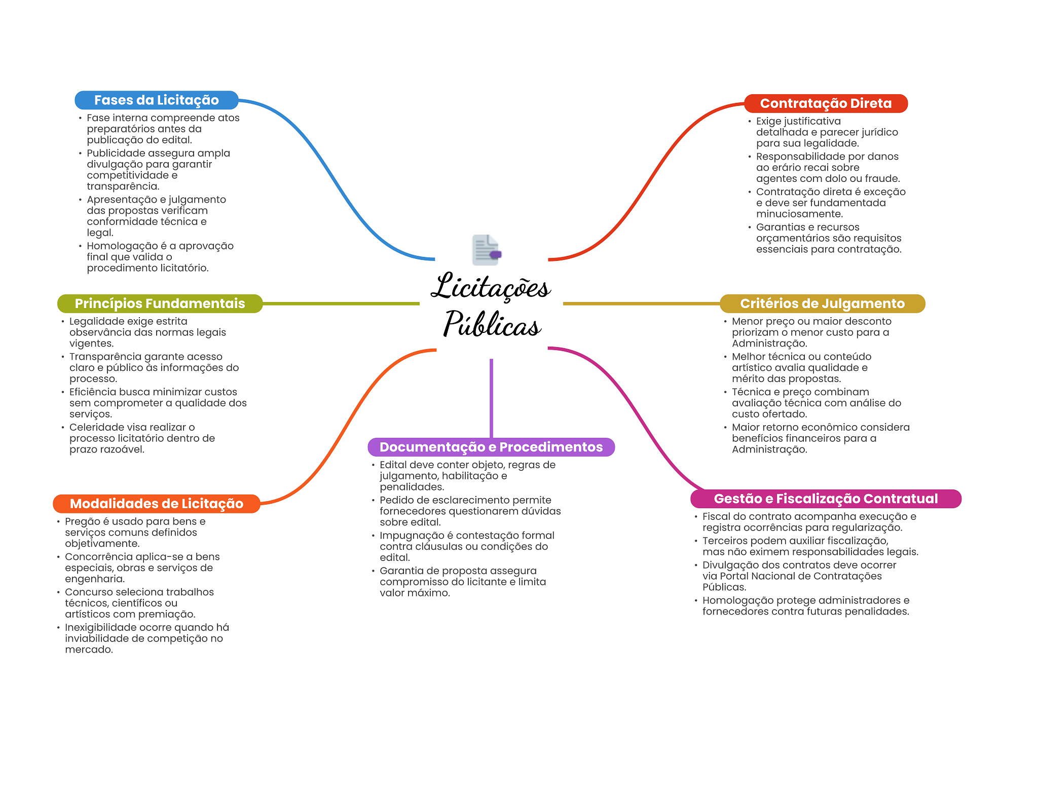Fases da Licitação Contratação Direta Fase interna compreende atos Exige justificativa preparatórios antes da detalhada e parecer jurídico publicação do edital. para sua legalidade. Publicidade assegura ampla Responsabilidade por danos divulgação para garantir ao erário recai sobre competitividade e agentes com dolo ou fraude. transparência. Contratação direta é exceção Apresentação e julgamento e deve ser fundamentada das propostas verificam minuciosamente. conformidade técnica e Garantias e recursos legal. orçamentários são requisitos Homologação é a aprovação essenciais para contratação. final que valida procedimento licitatório. Licitações Princípios Fundamentais Critérios de Julgamento Legalidade exige estrita observância das normas legais Públicas Menor preço ou maior desconto priorizam O menor custo para a vigentes. Administração. Transparência garante acesso Melhor técnica ou conteúdo claro e público às informações do artístico avalia qualidade e processo. mérito das propostas. Eficiência busca minimizar custos Técnica e preço combinam sem comprometer a qualidade dos avaliação técnica com análise do serviços. custo ofertado. Celeridade visa realizar Maior retorno econômico considera processo licitatório dentro de benefícios financeiros para a prazo razoável. Documentação e Procedimentos Administração. Edital deve conter objeto, regras de julgamento, habilitação e penalidades. Modalidades de Licitação Pedido de esclarecimento permite Gestão e Fiscalização Contratual fornecedores questionarem dúvidas Pregão é usado para bens e sobre edital. Fiscal do contrato acompanha execução e serviços comuns definidos registra ocorrências para regularização. Impugnação é contestação formal objetivamente. contra cláusulas ou condições do Terceiros podem auxiliar fiscalização, Concorrência aplica-se a bens edital. mas não eximem responsabilidades legais. especiais, obras e serviços de Garantia de proposta assegura Divulgação dos contratos deve ocorrer engenharia. compromisso do licitante e limita via Portal Nacional de Contratações Concurso seleciona trabalhos Públicas. valor máximo. técnicos, científicos ou Homologação protege administradores e artísticos com premiação. fornecedores contra futuras penalidades. Inexigibilidade ocorre quando há inviabilidade de competição no mercado.