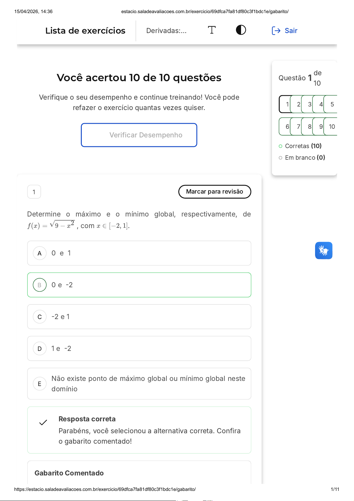 Você acertou 10 de 10 questões Verifique o seu desempenho e continue treinando! Você pode refazer o exercício quantas vezes quiser. Verificar Desempenho A B C D E 1 Marcar para revisão Determine o máximo e o mínimo global, respectivamente, de , com .f(x) = √9 − x2 x ∈ [−2, 1] 0 e 1 0 e -2 -2 e 1 1 e -2 Não existe ponto de máximo global ou mínimo global neste domínio Resposta correta Parabéns, você selecionou a alternativa correta. Confira o gabarito comentado! Gabarito Comentado Questão 1 de 10 Corretas (10) Em branco (0) 1 2 3 4 5 6 7 8 9 10 Lista de exercícios Derivadas:… Sair 15/04/2026, 14:36 estacio.saladeavaliacoes.com.br/exercicio/69dfca7fa81df80c3f1bdc1e/gabarito/ https://estacio.saladeavaliacoes.com.br/exercicio/69dfca7fa81df80c3f1bdc1e/gabarito/ 1/11 A B C D E A função atinge seu valor mínimo de 0 quando ou , e seu valor máximo de -2 quando . Portanto, os valores máximo e mínimo globais da função, respectivamente, são 0 e -2. f(x) = √9 − x2 x = −2 x = 1 x = 0 2 Marcar para revisão Determine o máximo e o mínimo global, respectivamente de , com .f(x) = √9 − x2 x ∈ [−2, 1] 0 e 1 0 e - 2 - 2 e 1 1 e - 2 Não existe ponto de máximo global ou mínimo global neste domínio Resposta correta Parabéns, você selecionou a alternativa correta. Confira o gabarito comentado! Gabarito Comentado Note que de , obtemos , que representa, sem restrição a x e y uma circunferência e centro na origem e raio 3 . Mas como y>0 e . Então o gráfico da função é o indicado, onde: y = √9 − x2 x 2 + y 2 = 9 (x ∈ [−2, 1]) 15/04/2026, 14:36 estacio.saladeavaliacoes.com.br/exercicio/69dfca7fa81df80c3f1bdc1e/gabarito/ https://estacio.saladeavaliacoes.com.br/exercicio/69dfca7fa81df80c3f1bdc1e/gabarito/ 2/11 A B C D E - se x=-2, então ; - se x=0, então y=3; - se x=1, então . Logo, o máximo global se dá em x=0 e o mínimo global, em x=-2. (y = √5) (y = 2√2) 3 Marcar para revisão Determine o conjunto no qual a função de domínio real, definida por , é decrescente.f(x) = x 2 e x ]0; 2[ ]-2; 0[ ]0; 1[ ]−∞, −2[ ]0; +∞[ Resposta correta Parabéns, você selecionou a alternativa correta. Confira o gabarito comentado! Gabarito Comentado 15/04/2026, 14:36 estacio.saladeavaliacoes.com.br/exercicio/69dfca7fa81df80c3f1bdc1e/gabarito/ https://estacio.saladeavaliacoes.com.br/exercicio/69dfca7fa81df80c3f1bdc1e/gabarito/ 3/11 A B C D E f ′ (x) = x 2 (e x ) ′ + (x2) ′ e x f ′ (x) = x 2 e x + 2xe x f ′(x) = (x2 + 2x) ex -2. f ′ (x) = 3x 2 + 12x + 4 f ′′ (x) = 6x + 12x f ′′ (x) > 0 → 6(x + 2) 6 Marcar para revisão Os pontos onde a função dada por possui reta tangentef(x) = cosx 15/04/2026, 14:36 estacio.saladeavaliacoes.com.br/exercicio/69dfca7fa81df80c3f1bdc1e/gabarito/ https://estacio.saladeavaliacoes.com.br/exercicio/69dfca7fa81df80c3f1bdc1e/gabarito/ 6/11 A B C D E A B C horizontal são expressos por: inteiro;x = kπ/2, k inteiro;x = kπ, k inteiro;x = 2kπ, k inteiro;x = 3kπ/2, k inteiro;x = kπ − π/2k Resposta correta Parabéns, você selecionou a alternativa correta. Confira o gabarito comentado! Gabarito Comentado f ′ (x) = − senx f ′ (0) = 0 implica em senx = 0, o que ocorre para x múltiplo de π 7 Marcar para revisão Indique onde ocorre o ponto de inflexão da função definida por .f(x) = x 2(x − 2) x = 1 x = 2/3 x = 3/2 15/04/2026, 14:36 estacio.saladeavaliacoes.com.br/exercicio/69dfca7fa81df80c3f1bdc1e/gabarito/ https://estacio.saladeavaliacoes.com.br/exercicio/69dfca7fa81df80c3f1bdc1e/gabarito/ 7/11 D E x = 2 x = 5/2 Resposta correta Parabéns, você selecionou a alternativa correta. Confira o gabarito comentado! Gabarito Comentado Note que a concavidade de muda em , pois se a concavidade é positiva; se a concavidade é negativa. Logo em temos um ponto de inflexão. Se então . f(x) = x 2 (x − 1) = x 3 − 2x 2 f ′ (x) = 3x 2 − 4x f ′′(x) = 6x − 4 = 2(3x − 2) f x = 2/3 x > 2/3 x 1, a função é crescente. Com base nessas informações, pode-se concluir que: 15/04/2026, 14:36 estacio.saladeavaliacoes.com.br/exercicio/69dfca7fa81df80c3f1bdc1e/gabarito/ https://estacio.saladeavaliacoes.com.br/exercicio/69dfca7fa81df80c3f1bdc1e/gabarito/ 8/11 A B C D E x=1 é um ponto de mínimo local de g(x). x=1 é um ponto de máximo local de g(x). A função não possui extremos locais. A função possui dois extremos locais. Não é possível determinar sem saber a expressão da função. Resposta correta Parabéns, você selecionou a alternativa correta. Confira o gabarito comentado! Gabarito Comentado Informações fornecidas: Para x1, a função é crescente A função é contínua em x=1 Logo, podemos afirmar que: A função desce até x=1, e depois sobe. Isso é o comportamento típico de um mínimo local. Como a função é contínua em x=1, não há "buraco" ou salto ali ¿ a curva é suave. Em x=1, a função muda de decrescente para crescente→ mínimo local Como isso ocorre em apenas um ponto, temos um extremo local. 15/04/2026, 14:36 estacio.saladeavaliacoes.com.br/exercicio/69dfca7fa81df80c3f1bdc1e/gabarito/ https://estacio.saladeavaliacoes.com.br/exercicio/69dfca7fa81df80c3f1bdc1e/gabarito/ 9/11 A B C D E Gabarito: x=1 é um ponto de mínimo local de g(x). 9 Marcar para revisão A aplicabilidade das derivadas de funções é imensurável, podendo ser aplicadas em diversas áreas de estudo e em inúmeros contextos. Sabendo disso, determine a equação da reta tangente a e o ponto (1,6).y 2 − 4xy = 12 y = 3x + 3. y = 4x + 2. y = 3x + 5. y = 6x + 3. y = 7x + 1. Resposta correta Parabéns, você selecionou a alternativa correta. Confira o gabarito comentado! Gabarito Comentado Aplicando o ponto (1,6): y 2 − 4xy = 12 − (4 ⋅ ⋅ y + 4 ⋅ x ⋅ ) = 2y − 4y − 4x = 0 = = m dy 2 dy dy dx dx dx dy dy dy dx d(12) dx dy dx dy dx dy dx 4y 2y − 4x m = = = = 3 4y 2y−4x 4⋅6 2⋅1−4⋅1 24 8 15/04/2026, 14:36 estacio.saladeavaliacoes.com.br/exercicio/69dfca7fa81df80c3f1bdc1e/g