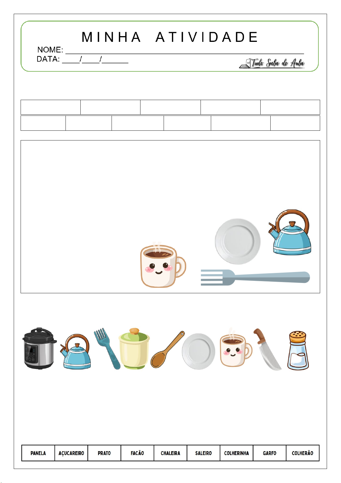 1. COMPLETE A MÚSICA COM AS PALAVRAS: CHALEIRA CANECA AÇUCAREIRO PRATO FUNDO PRATO RASO FACÃO PANELA COLHERÃO SALEIRO COLHERINHA GARFINHO E AGORA A GENTE VAI SE TRANSFORMAR EM UM MONTÃO DE COISAS MUITO MALUCAS, COMO POR EXEMPLO: EM UMA_________________, UMA _________________ UMA_________________ E UM _________________ UM______________ ______________, UM ______________ ______________ UM _________________ E UM _________________ EM UM _________________, _________________ E UMA _________________QUE FAZ FEIJÃO FUFU! Ô! VIRO, VIRA, VIROU Ô! VIRO, VIRA, VIROU [...] https://www.letras.mus.br/grupo-triii/viro-vira-virou/ 2. LIGUE CADA FIGURA AO SEU NOME. https://www.tudosaladeaula.com/