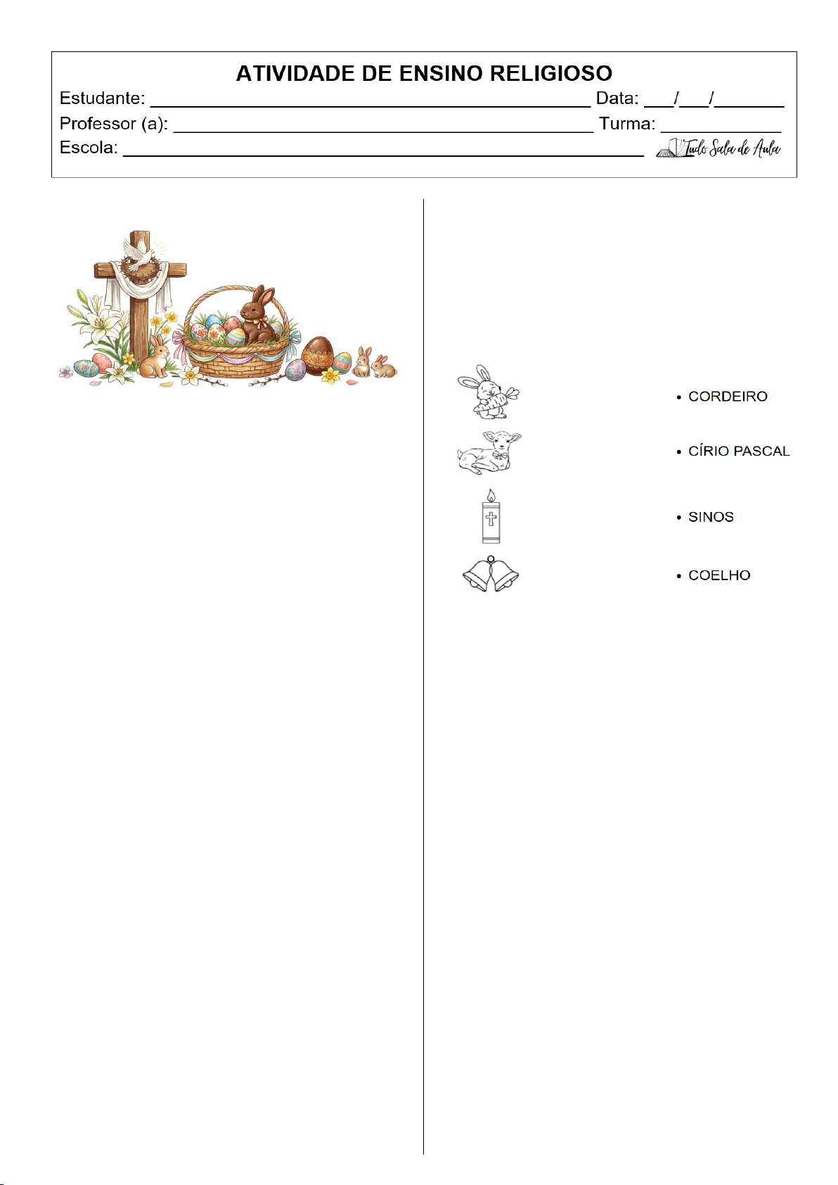 DE ONDE VEIO A PÁSCOA? A palavra "Páscoa" vem de um termo antigo que significa "passagem". Para os cristãos, a Páscoa celebra a Ressurreição de Jesus, que é quando a vida vence a morte, trazendo esperança para todos. O que os símbolos nos ensinam? A Páscoa é cheia de desenhos e figuras e cada um deles possui um significado. O Coelho: Ele é o símbolo da fertilidade. Como os coelhos têm muitos filhotes, eles representam o nascimento de coisas novas. O Cordeiro: É um animalzinho manso que representa a paz e a pureza. O Círio Pascal: É uma vela grande e decorada. Ela representa a luz de Cristo que ilumina o caminho das pessoas. Os Sinos: Na tradição cristã, o toque dos sinos anuncia a alegria da ressurreição. Eles espalham a notícia de que a vida venceu a morte. Alimentos Especiais da Páscoa Na mesa de Páscoa, alguns alimentos têm significados religiosos muito importantes. O Pão e o Vinho: Simbolizam a partilha e a aliança. Lembram a última ceia de Jesus com seus amigos, onde ele ensinou que devemos dividir o que temos com o próximo. O Peixe: É muito comum comer peixe na Páscoa. Ele é um símbolo antigo que representa a fé e o respeito. O Chocolate: Hoje, o chocolate transformou o ovo em uma forma doce de presentear quem amamos, simbolizando a doçura da vida. O Ovo: No ovo, existe uma vida pronta para nascer. Por isso, ele simboliza o nascimento e a esperança. Tudo Sala de Aula Atividade_____________________________ 1. Ligue as figuras até suas representações. 2. Para os cristãos, a Páscoa celebra a Ressurreição de Jesus, mas o que é ressurreição? ________________________________________ ________________________________________ 3. Descubra qual o símbolo religioso está sendo falado, de acordo com a descrição: a) Na tradição cristã, o toque anuncia a alegria da ressurreição. ________________________________________ ________________________________________ b) É um animalzinho manso que representa a paz e a pureza. ________________________________________ ________________________________________ c) É uma vela adornada. Ela representa a luz de Cristo que ilumina o caminho das pessoas. ________________________________________ ________________________________________ d) Ele é o símbolo da fertilidade e representa o nascimento de coisas novas. ________________________________________ ________________________________________ https://www.tudosaladeaula.com/ https://www.tudosaladeaula.com/ https://www.tudosaladeaula.com/ 4. Complete a frase do texto. Na tradição cristã, o toque dos sinos anuncia a alegria e a notícia de que: 5. Observe e pinte somente os alimentos que são relacionados a páscoa. 6. Quais alimentos você encontrou? 7. Qual imagem abaixo está relacionada com um alimento considerado sagrado na Páscoa? a) b) c) d) 8. Complete o acróstico com palavras positivas para cada letra da palavra PÁSCOA. P Á S C O A 9. Qual tradição sua família costuma realizar no período da páscoa? ________________________________________ ________________________________________ ________________________________________ ________________________________________ 10. Para você, qual o verdadeiro sentido da páscoa? ________________________________________ ________________________________________ ________________________________________ ________________________________________ Tudo Sala de Aula https://www.tudosaladeaula.com/ https://www.tudosaladeaula.com/ https://www.tudosaladeaula.com/ https://www.tudosaladeaula.com/ https://www.tudosaladeaula.com/ https://www.tudosaladeaula.com/