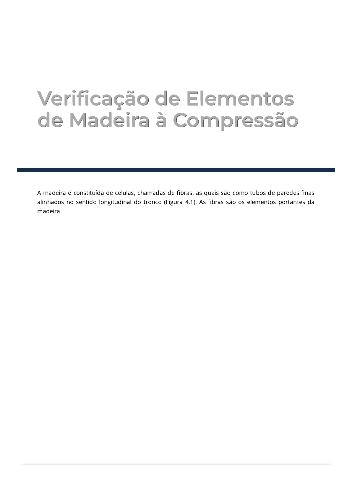 A madeira é constituída de células, chamadas de fibras, as quais são como tubos de paredes finas alinhados no sentido longitudinal do tronco (Figura 4.1). As fibras são os elementos portantes da madeira. Verificação de ElementosVerificação de Elementos de Madeira à Compressãode Madeira à Compressão