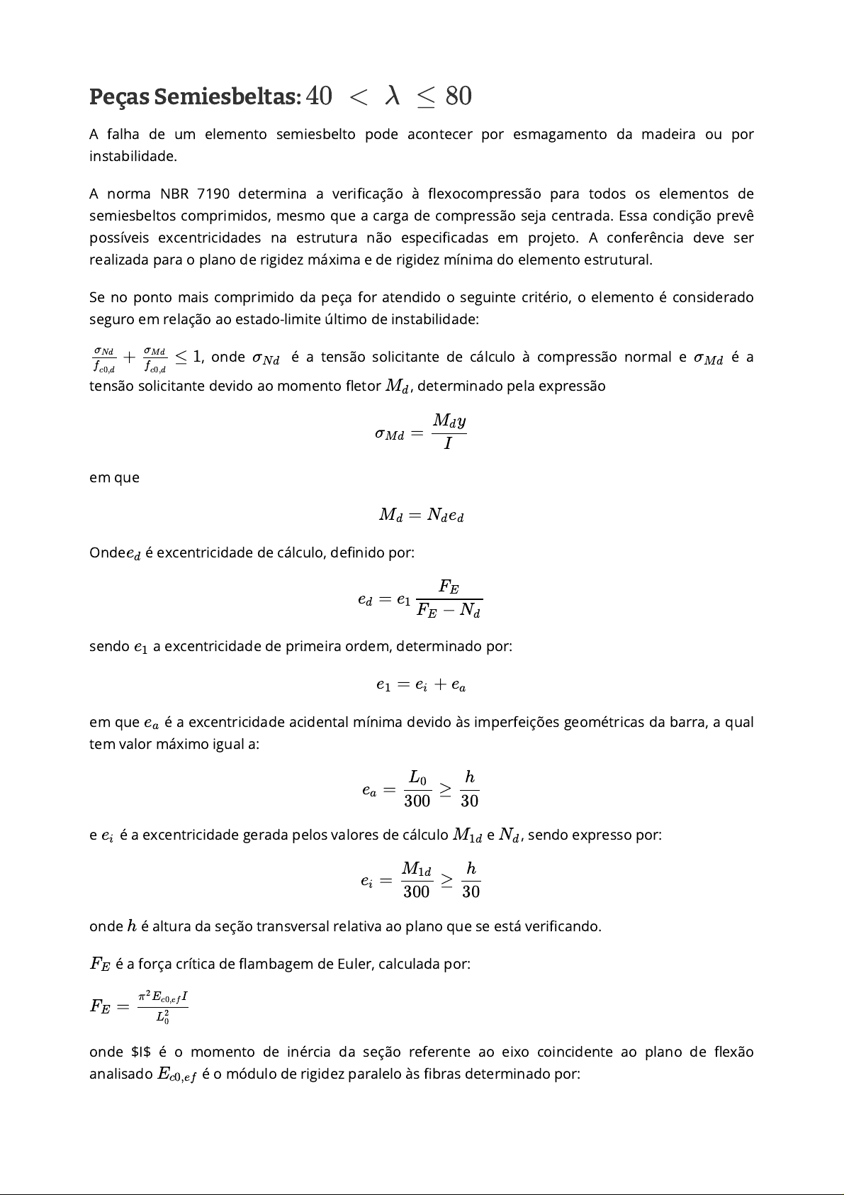 Peças Semiesbeltas: A falha de um elemento semiesbelto pode acontecer por esmagamento da madeira ou por instabilidade. A norma NBR 7190 determina a verificação à flexocompressão para todos os elementos de semiesbeltos comprimidos, mesmo que a carga de compressão seja centrada. Essa condição prevê possíveis excentricidades na estrutura não especificadas em projeto. A conferência deve ser realizada para o plano de rigidez máxima e de rigidez mínima do elemento estrutural. Se no ponto mais comprimido da peça for atendido o seguinte critério, o elemento é considerado seguro em relação ao estado-limite último de instabilidade: , onde é a tensão solicitante de cálculo à compressão normal e é a tensão solicitante devido ao momento fletor , determinado pela expressão em que Onde é excentricidade de cálculo, definido por: sendo a excentricidade de primeira ordem, determinado por: em que é a excentricidade acidental mínima devido às imperfeições geométricas da barra, a qual tem valor máximo igual a: e é a excentricidade gerada pelos valores de cálculo e , sendo expresso por: onde é altura da seção transversal relativa ao plano que se está verificando. é a força crítica de flambagem de Euler, calculada por: onde $I$ é o momento de inércia da seção referente ao eixo coincidente ao plano de flexão analisado é o módulo de rigidez paralelo às fibras determinado por: 40
