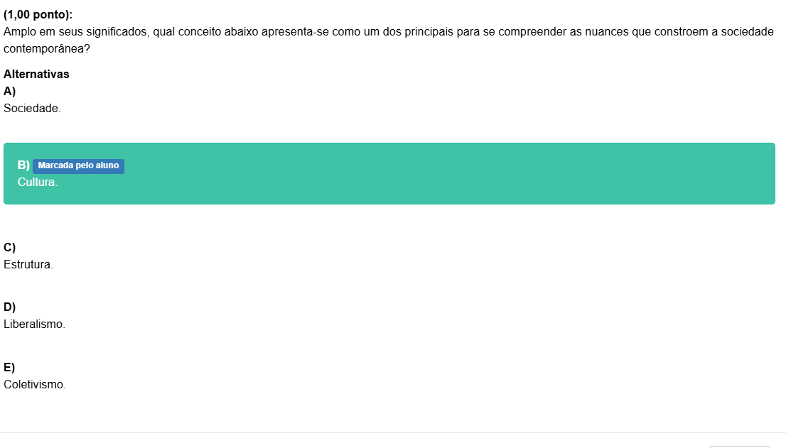(1,00 ponto): Amplo em seus significados, qual conceito abaixo apresenta-se como um dos principais para se compreender as nuances que constroem a sociedade contemporânea? Alternativas A) B) Marcada pelo aluno Cultura. C) Estrutura. D) E)