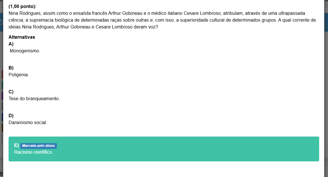 (1,00 ponto): Nina Rodrigues, assim como francês Arthur Gobineau e 0 médico italiano Cesare Lombroso, atribuíam, através de uma ultrapassada ciência, a supremacia biológica de determinadas raças sobre outras e, com isso, a superioridade cultural de determinados grupos. A qual corrente de ideias Nina Rodrigues, Arthur Gobineau e Cesare Lombroso deram voz? Alternativas A) Monogenismo. B) Poligenia. C) Tese do branqueamento. D) Darwinismo social. E) Marcada pelo aluno Racismo científico.