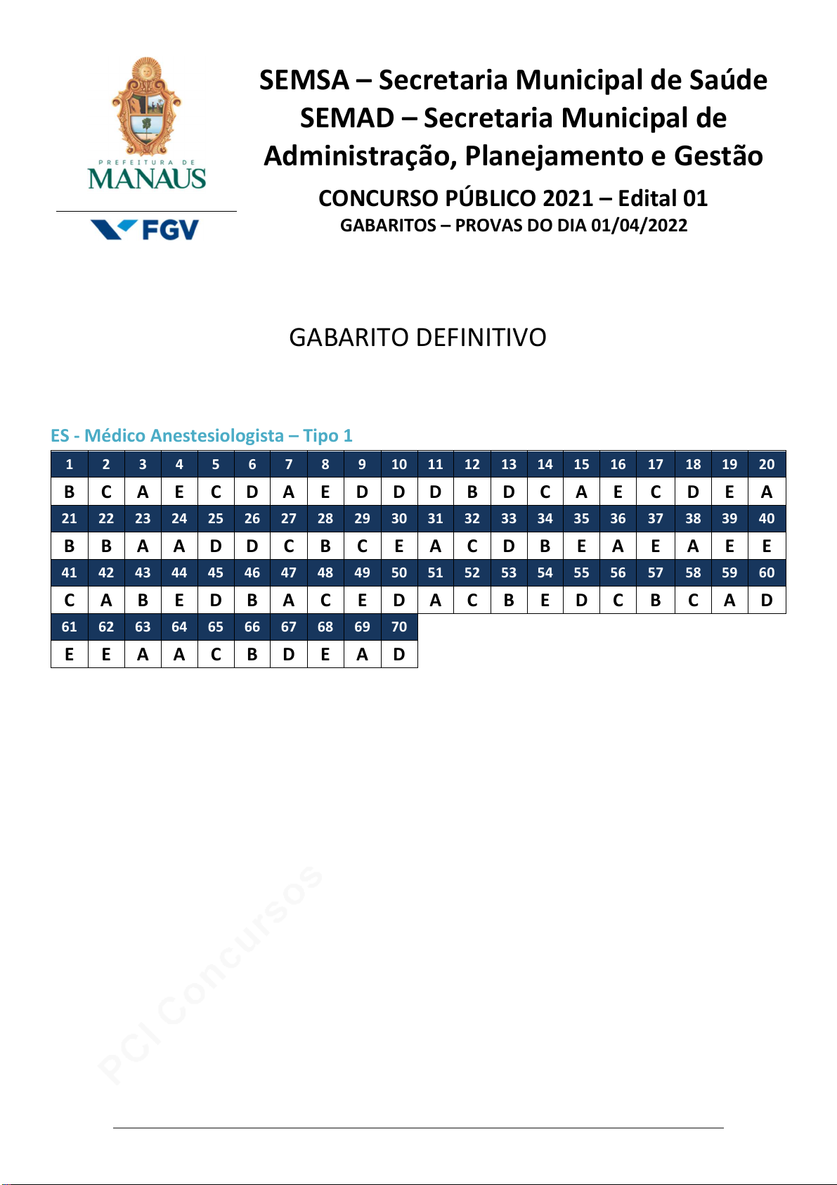pcimarkpci MjgwNDowMjE0OjkzZDA6YmFlZjo2NTAzOjk2NjM6OGExODoxOWM4:V2VkLCAxNSBBcHIgMjAyNiAxNzowODoyMyAtMDMwMA== www.pciconcursos.com.br SEMSA – Secretaria Municipal de Saúde SEMAD – Secretaria Municipal de Administração, Planejamento e Gestão CONCURSO PÚBLICO 2021 – Edital 01 GABARITOS – PROVAS DO DIA 01/04/2022 GABARITO DEFINITIVO ES - Médico Anestesiologista – Tipo 1 1 2 3 4 5 6 7 8 9 10 11 12 13 14 15 16 17 18 19 20 B C A E C D A E D D D B D C A E C D E A 21 22 23 24 25 26 27 28 29 30 31 32 33 34 35 36 37 38 39 40 B B A A D D C B C E A C D B E A E A E E 41 42 43 44 45 46 47 48 49 50 51 52 53 54 55 56 57 58 59 60 C A B E D B A C E D A C B E D C B C A D 61 62 63 64 65 66 67 68 69 70 E E A A C B D E A D pcimarkpci MjgwNDowMjE0OjkzZDA6YmFlZjo2NTAzOjk2NjM6OGExODoxOWM4:V2VkLCAxNSBBcHIgMjAyNiAxNzowODoyMyAtMDMwMA== www.pciconcursos.com.br SEMSA – Secretaria Municipal de Saúde SEMAD – Secretaria Municipal de Administração, Planejamento e Gestão CONCURSO PÚBLICO 2021 – Edital 01 GABARITOS – PROVAS DO DIA 01/04/2022 GABARITO DEFINITIVO ES - Médico Cardiologista – Tipo 1 1 2 3 4 5 6 7 8 9 10 11 12 13 14 15 16 17 18 19 20 B C A E C D A E D D D B D C A E C D E A 21 22 23 24 25 26 27 28 29 30 31 32 33 34 35 36 37 38 39 40 B B A A D D C B C E A C D B E A E A E E 41 42 43 44 45 46 47 48 49 50 51 52 53 54 55 56 57 58 59 60 C A A C E D A B D E D C C E D A B C E C 61 62 63 64 65 66 67 68 69 70 B A D E C B D A B D pcimarkpci MjgwNDowMjE0OjkzZDA6YmFlZjo2NTAzOjk2NjM6OGExODoxOWM4:V2VkLCAxNSBBcHIgMjAyNiAxNzowODoyMyAtMDMwMA== www.pciconcursos.com.br SEMSA – Secretaria Municipal de Saúde SEMAD – Secretaria Municipal de Administração, Planejamento e Gestão CONCURSO PÚBLICO 2021 – Edital 01 GABARITOS – PROVAS DO DIA 01/04/2022 GABARITO DEFINITIVO ES - Médico Cirurgião – Tipo 1 1 2 3 4 5 6 7 8 9 10 11 12 13 14 15 16 17 18 19 20 B C A E C D A E D D D B D C A E C D E A 21 22 23 24 25 26 27 28 29 30 31 32 33 34 35 36 37 38 39 40 B B A A D D C B C E A C D B E A E A E E 41 42 43 44 45 46 47 48 49 50 51 52 53 54 55 56 57 58 59 60 D C E C C A D C E B C E A D A D A E B E 61 62 63 64 65 66 67 68 69 70 C C B A E D D D C A pcimarkpci MjgwNDowMjE0OjkzZDA6YmFlZjo2NTAzOjk2NjM6OGExODoxOWM4:V2VkLCAxNSBBcHIgMjAyNiAxNzowODoyMyAtMDMwMA== www.pciconcursos.com.br SEMSA – Secretaria Municipal de Saúde SEMAD – Secretaria Municipal de Administração, Planejamento e Gestão CONCURSO PÚBLICO 2021 – Edital 01 GABARITOS – PROVAS DO DIA 01/04/2022 GABARITO DEFINITIVO ES - Médico Clínico Geral - 20 Horas – Tipo 1 1 2 3 4 5 6 7 8 9 10 11 12 13 14 15 16 17 18 19 20 B C A E C D A E D D D B D C A E C D E A 21 22 23 24 25 26 27 28 29 30 31 32 33 34 35 36 37 38 39 40 B B A A D D C B C E A C D B E A E A E E 41 42 43 44 45 46 47 48 49 50 51 52 53 54 55 56 57 58 59 60 A A A C B B E D C C C B B D D B A * E A 61 62 63 64 65 66 67 68 69 70 E A C B E C D E C B (*) Questão anulada pcimarkpci MjgwNDowMjE0OjkzZDA6YmFlZjo2NTAzOjk2NjM6OGExODoxOWM4:V2VkLCAxNSBBcHIgMjAyNiAxNzowODoyMyAtMDMwMA== www.pciconcursos.com.br SEMSA – Secretaria Municipal de Saúde SEMAD – Secretaria Municipal de Administração, Planejamento e Gestão CONCURSO PÚBLICO 2021 – Edital 01 GABARITOS – PROVAS DO DIA 01/04/2022 GABARITO DEFINITIVO ES - Médico Clínico Geral - 20 Horas – Tipo 2 1 2 3 4 5 6 7 8 9 10 11 12 13 14 15 16 17 18 19 20 D D E A D C E A C B A E D C E A C D B D 21 22 23 24 25 26 27 28 29 30 31 32 33 34 35 36 37 38 39 40 D A B A B E C C B D E A E A D A B E C E 41 42 43 44 45 46 47 48 49 50 51 52 53 54 55 56 57 58 59 60 B D C A A A A E B C E C B D E E C A A B 61 62 63 64 65 66 67 68 69 70 * E D C B D C B C B (*) Questão anulada pcimarkpci MjgwNDowMjE0OjkzZDA6YmFlZjo2NTAzOjk2NjM6OGExODoxOWM4:V2VkLCAxNSBBcHIgMjAyNiAxNzowODoyMyAtMDMwMA== www.pciconcursos.com.br SEMSA – Secretaria Municipal de Saúde SEMAD – Secretaria Municipal de Administração, Planejamento e Gestão CONCURSO PÚBLICO 2021 – Edital 01 GABARITOS – PROVAS DO DIA 01/04/2022 GABARITO DEFINITIVO ES - Médico Clínico Geral - 40 Horas – Tipo 1 1 2 3 4 5 6 7 8 9 10 11 12 13 14 15 16 17 18 19 20 B C A E C D A E D D D B D C A E C D E A 21 22 23 24 25 26 27 28 29 30 31 32 33 34 35 36 37 38 39 40 B B A A D D C B C E A C D B E A E A E E 41 42 43 44 45 46 47 48 49 50 51 52 53 54 55 56 57 58 59 60 A A A C B B E D C C C B B D D B A * E A 61 62 63 64 65 66 67 68 69 70 E A C B E C D E C B (*) Questão anulada pcimarkpci MjgwNDowMjE0OjkzZDA6YmFlZjo2NTAzOjk2NjM6OGExODoxOWM4:V2VkLCAxNSBBcHIgMjAyNiAxNzowODoyMyAtMDMwMA== www.pciconcursos.com.br SEMSA – Secretaria Municipal de Saúde SEMAD – Secretaria Municipal de Administração, Planejamento e Gestão CONCURSO PÚBLICO 2021 – Edital 01 GABARITOS – PROVAS DO DIA 01/04/2022 GABARITO DEFINITIVO ES - Médico Clínico Geral - 40 Horas – Tipo 2 1 2 3 4 5 6 7 8 9 10 11 12 13 14 15 16 17 18 19 20 D D E A D C E A C B A E D C E A C D B D 21 22 23 24 25 26 27 28 29 30 31 32 33 34 35 36 37 38 39 40 D A B A B E C C B D E A E A D A B E C E 41 42 43 44 45 46 47 48 49 50 51 52 53 54 55 56 57 58 59 60 B D C A A A A E B C E C B D E E C A A B 61 62 63 64 65 66 67 68 69 70 * E D C B D C B C B (*) Questão anulada pcimarkpci MjgwNDowMjE0OjkzZDA6YmFlZjo2NTAzOjk2NjM6OGExODoxOWM4:V2VkLCAxNSBBcHIgMjAyNiAxNzowODoyMyAtMDMwMA== www.pciconcursos.com.br SEMSA – Secretaria Municipal de Saúde SEMAD – Secretaria Municipal de Administração, Planejamento e Gestão CONCURSO PÚBLICO 2021 – Edital 01 GABARITOS – PROVAS DO DIA 01/04/2022 GABARITO DEFINITIVO ES - Médico Do Trabalho – Tipo 1 1 2 3 4 5 6 7 8 9 10 11 12 13 14 15 16 17 18 19 20 B C A E C D A E D D D B D C A E C D E A 21 22 23 24 25 26 27 28 29 30 31 32 33 34 35 36 37 38 39 40 B B A A D D C B C E A C D B E A E A E E 41 42 43 44 45 46 47 48 49 50 51 52 53 54 55 56 57 58 59 60 D B D E C A E D E B D C A C A D E B D E 61 62 63 64 65 66 67 68 69 70 E B A B D C A C A C pcimarkpci MjgwNDowMjE0OjkzZDA6YmFlZjo2NTAzOjk2NjM6OGExODoxOWM4:V2VkLCAxNSBBcHIgMjAyNi