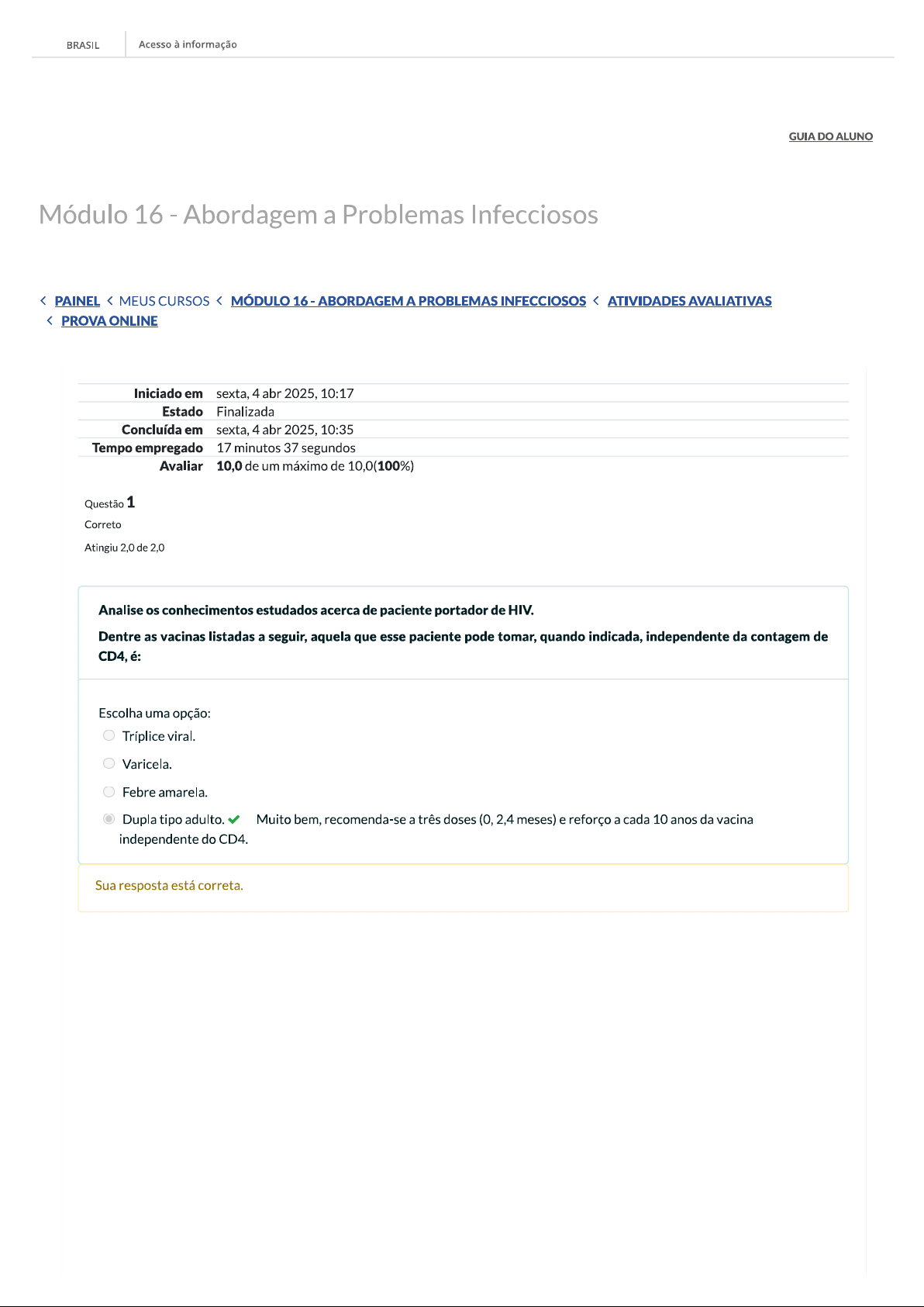 BRASIL Acesso à informação GUIA DO ALUNO Módulo 16 Abordagem a Problemas InfecciososBRASIL Acesso à informação Correto Atingiu 2,0 de 2,0 Os estados reacionais, conhecidos como reações hansênicas são decorrentes de alterações do sistema imunológico do paciente. Em relação a estas reações, é correto afirmar: Escolha uma opção: são mais frequentes nos pacientes com a forma paucibacilar. a reação tipo 2 costuma apresentar-se com nódulos subcutâneos dolorosos com ou sem manifestações sistêmicas. Muito bem, a reação tipo 2 costuma apresentar-se com nódulos subcutâneos dolorosos com ou sem manifestações sistêmicas como como febre, dor articular, mal-estar generalizado, orquite, iridociclites, com ou sem espessamento e dor de nervos periféricos (neurite). a reação tipo 2 em mulheres deve ser controlada com talidomida. pacientes com reação hansênica são mais infectantes. Sua resposta está correta. Questão 3 Correto Atingiu 2,0 de 2,0 Paciente 29 anos, sexo masculino, com história de febre (38,5°.C) há cerca de sete dias, associada a astenia e adinamia. Ao exame apresenta edema facial, mais visível na região periorbital esquerda. Adenomegalia cervical, axilar e inguinal. Taquicardia. Na confirmação de Doença de Chagas, sobre a epidemiologia da transmissão da infecção, é necessário investigar: Escolha uma opção: contato social com pessoa com suspeita da doença. relação sexual desprotegida. se conhece o barbeiro. Muito bem, considerando a hipótese diagnóstica para doença de Chagas são informações importantes para corroborar a hipótese diagnóstica de Doença de Chagas a investigação de: contato direto com triatomíneo ou suas excretas; ou receber sangue/ hemocomponentes ou transplante de células/tecidos/ órgãos contaminados por T. cruzi; ou ingestão de alimento suspeito contaminado por T. cruzi; ou se for recém-nascido investigar se a mãe era infectada. Conhecer o barbeiro pode ser um indicador da fonte de contaminação para Doença de Chagas. ausência do uso regular de máscara. Sua resposta está correta.BRASIL Acesso à informação Correto Atingiu 2,0 de 2,0 Ainda existem muitos casos de abandono de tratamento para tuberculose no Brasil devido a diversos fatores. É fundamental que a equipe de saúde da família faça seguimento longitudinal de cada paciente para evitar que se interrompa tratamento, pois em caso de abandono paciente deve reiniciar todo tratamento. Sendo assim, é considerado abandono de tratamento, sem uso da medicação, período de mais de: Escolha uma opção: 30 dias. Muito bem! Essa afirmação é verdadeira, tendo em vista que é considerado abandono de tratamento a interrupção por mais de 30 dias. 10 dias. 20 dias. 15 dias. Sua resposta está correta. Questão 5 Correto Atingiu 2,0 de 2,0 Considere quadro de Doença de Chagas crônica. Nesse quadro, os órgãos e/ou sistemas mais acometidos são: Escolha uma opção: coração, esôfago, cólon. Muito bem, ao atingir a circulação sanguínea, o Trypanosoma cruzi afeta os gânglios, o fígado e o baço. Ao atingir a forma crônica, atinge coração, esôfago e cólon. Cerca de 40% dos pacientes com infecção crônica permanecem assintomáticos. As formas sintomáticas manifestam-se como cardiomiopatia e mega síndromes (megaesôfago ou megacólon). rins, brônquios, pulmões. cólon, rins, miocárdio. esôfago, pâncreas, bexiga. Sua resposta está correta. Fórum avaliativo Seguir para...