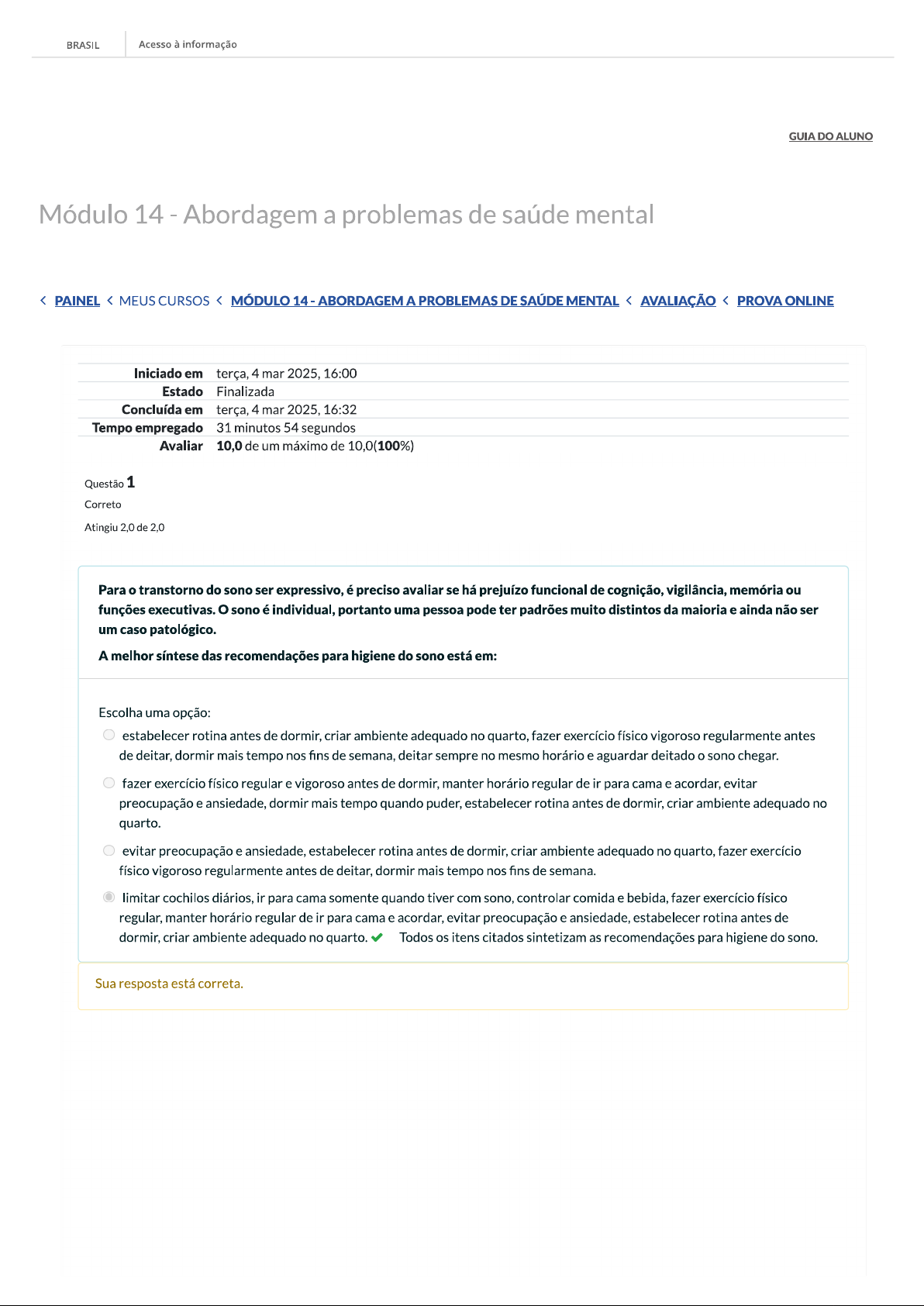 BRASIL Acesso à informação GUIA DO ALUNO Módulo 14 Abordagem a problemas de saúde mental PAINELBRASIL Acesso à informação Correto Atingiu 2,0 de 2,0 GBD, menina de 6 anos, vem na sua consulta acompanhada da avó, que se queixa de que a criança tem voltado a hábitos já superados como urinar na cama, além de estar mais retraída e com baixo desempenho na escola. criança mora com a avó e visita ocasionalmente a mãe e padrasto aos finais de semana. Avaliando caso, você inferiu que melhor conduta é: Escolha uma opção: orientar a avó que se trata de um comportamento típico da idade para chamar atenção dos adultos, sem gravidade ou necessidade de intervenção médica. solicitar exames como a ultrassonografia das vias urinárias e orientar que a criança seja acompanhada pela mãe na próxima consulta. iniciar tratamento medicamentoso para sofrimento psíquico e encaminhar para especialistas focais, considerando a alteração comportamental. explicar à avó sobre a baixa probabilidade de causa orgânica e investigar possível mudança na rotina ou no contexto familiar da criança. Importante descartar causa orgânica para a queixa e considerar que mudança de comportamento pode ser sinal de sofrimento psíquico por conta de alguma mudança. Sua resposta está correta. Questão 3 Correto Atingiu 2,0 de 2,0 maior desafio do médico de família em abordar saúde mental é sempre iniciar a conversa e aprofundar a avaliação até entender potencial existente de gravidade. Um sinal de menor gravidade, quando médico atende transtorno mental comum, é: Escolha uma opção: sintomas psicóticos. ideação suicida. presença de episódios de mania. insônia. Pode ser o único sintoma inicial de um transtorno mental comum e não representa sinal de gravidade. Sua resposta está correta.BRASIL Acesso à informação Correto Atingiu 2,0 de 2,0 As ferramentas mais utilizadas na abordagem de famílias na Atenção Primária são oriundas da sociologia e da psicologia. Essas ferramentas têm enorme potencial de estreitar as relações entre profissionais e famílias e, por outro lado, são potencializadas pela existência do vínculo entre profissional que as utiliza e a família. As ferramentas mais usadas na abordagem de famílias, são: Escolha uma opção: Genograma e Ecomapa. São as ferramentas mais conhecidas e usadas para abordagem familiar na APS. TIB e FIRO. Genograma e Cage. Ecomapa e Cage. Sua resposta está correta. Questão 5 Correto Atingiu 2,0 de 2,0 diagnóstico de depressão não pode ser feito por exclusão. A resistência em aceitar diagnósticos de saúde mental pode gerar uma busca por questões orgânicas que iniciará uma cascata de investigações. Dessa forma, é importante médico da ESF reconhecer sintomas principais e complementares da depressão. São sintomas complementares da depressão, somente: Escolha uma opção: insônia, perda de peso involuntária e perda de energia frequente. De acordo com DSM5, esses são sintomas complementares da depressão. ideação suicida, fadiga esporádica e tremor de extremidades. hipersonia, tremor de extremidades e cefaleia. perda de peso involuntária, fadiga esporádica e cefaleia. Sua resposta está correta. Fórum Avaliativo Seguir para...