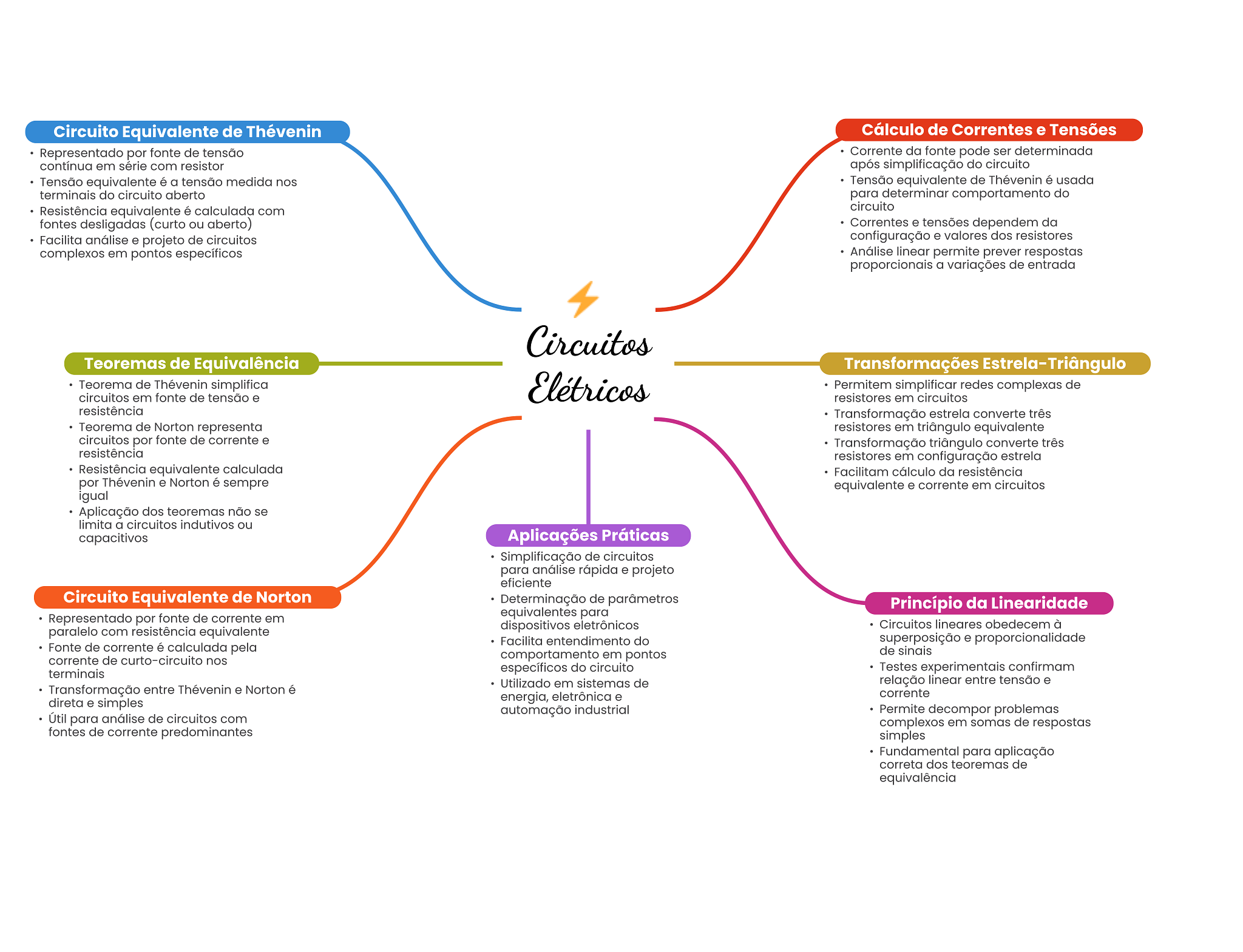 Circuito Equivalente de Thévenin Cálculo de Correntes e Tensões Representado por fonte de tensão Corrente da fonte pode ser determinada contínua em série com resistor após simplificação do circuito Tensão equivalente é a tensão medida nos Tensão equivalente de Thévenin é usada terminais do circuito aberto para determinar comportamento do Resistência equivalente é calculada com circuito fontes desligadas (curto ou aberto) Correntes e tensões dependem da Facilita análise e projeto de circuitos configuração e valores dos resistores complexos em pontos específicos Análise linear permite prever respostas proporcionais a variações de entrada Circuitos Teoremas de Equivalência Transformações Estrela-Triângulo Teorema de Thévenin simplifica circuitos em fonte de tensão e Elétricos Permitem simplificar redes complexas de resistores em circuitos resistência Transformação estrela converte três Teorema de Norton representa resistores em triângulo equivalente circuitos por fonte de corrente e Transformação triângulo converte três resistência resistores em configuração estrela Resistência equivalente calculada Facilitam cálculo da resistência por Thévenin e Norton é sempre equivalente e corrente em circuitos igual Aplicação dos teoremas não se limita a circuitos indutivos ou capacitivos Aplicações Práticas Simplificação de circuitos para análise rápida e projeto eficiente Circuito Equivalente de Norton Determinação de parâmetros Princípio da Linearidade Representado por fonte de corrente em equivalentes para dispositivos eletrônicos Circuitos lineares obedecem à paralelo com resistência equivalente Facilita entendimento do superposição e proporcionalidade Fonte de corrente é calculada pela corrente de curto-circuito nos comportamento em pontos de sinais terminais específicos do circuito Testes experimentais confirmam Utilizado em sistemas de relação linear entre tensão e Transformação entre Thévenin e Norton é energia, eletrônica e corrente direta e simples automação industrial Permite decompor problemas Útil para análise de circuitos com complexos em somas de respostas fontes de corrente predominantes simples Fundamental para aplicação correta dos teoremas de equivalência