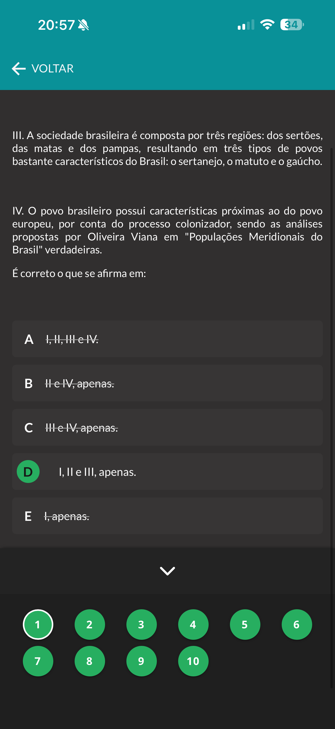 20:57 34 VOLTAR III. A sociedade brasileira é composta por três regiões: dos sertões, das matas e dos pampas, resultando em três tipos de povos bastante característicos do Brasil: sertanejo, matuto e gaúcho. IV. povo brasileiro possui características próximas ao do povo europeu, por conta do processo colonizador, sendo as análises propostas por Oliveira Viana em "Populações Meridionais do Brasil" verdadeiras. É correto que se afirma em: A c D I, II e III, apenas. E 1 2 3 4 5 6 7 8 9 10