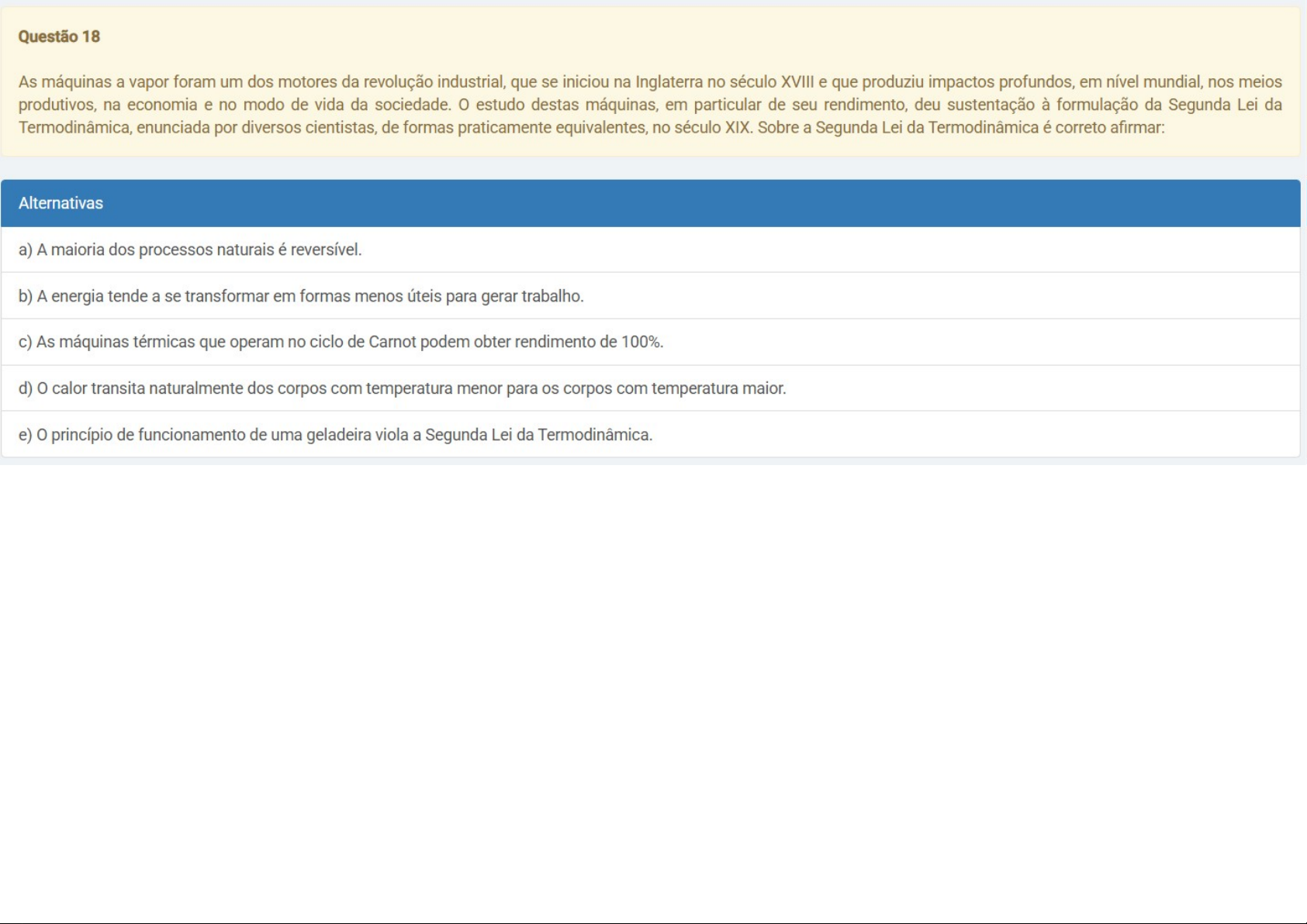 Questão 18 As máquinas a vapor foram um dos motores da revolução industrial, que se iniciou na Inglaterra no século XVIII e que produziu impactos profundos, em nível mundial, nos meios produtivos, na economia e no modo de vida da sociedade. 0 estudo destas máquinas, em particular de seu rendimento, deu sustentação à formulação da Segunda Lei da Termodinâmica, enunciada por diversos cientistas, de formas praticamente equivalentes, no século XIX. Sobre a Segunda Lei da Termodinâmica é correto afirmar: Alternativas a) A maioria dos processos naturais é reversível. b) A energia tende a se transformar em formas menos úteis para gerar trabalho. c) As máquinas térmicas que operam no ciclo de Carnot podem obter rendimento de 100%. d) calor transita naturalmente dos corpos com temperatura menor para os corpos com temperatura maior. e) 0 princípio de funcionamento de uma geladeira viola a Segunda Lei da Termodinâmica.