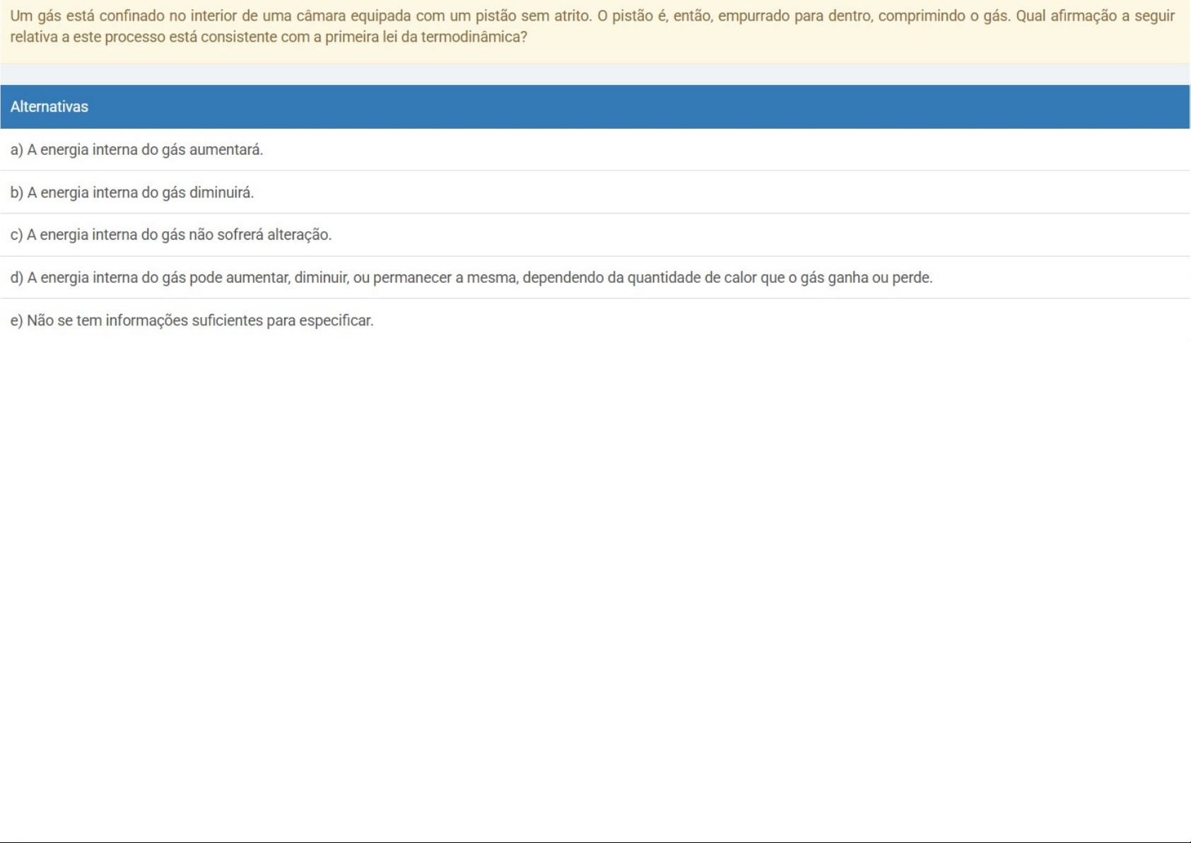 Um gás está confinado no interior de uma câmara equipada com um pistão sem atrito. 0 pistão é, então, empurrado para dentro, comprimindo gás. Qual afirmação a seguir relativa a este processo está consistente com a primeira lei da termodinâmica? Alternativas a) A energia interna do gás aumentará. b) A energia interna do gás diminuirá. c) A energia interna do gás não sofrerá alteração. d) A energia interna do gás pode aumentar, diminuir, ou permanecer a mesma, dependendo da quantidade de calor que gás ganha ou perde. e) Não se tem informações suficientes para especificar.