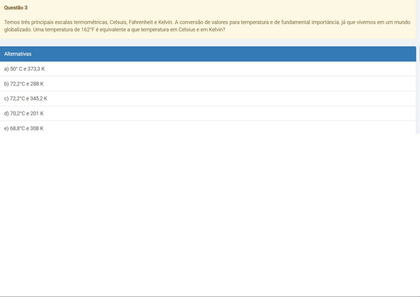 Questão 3 Temos três principais escalas termométricas, Celsuis, Fahrenheit e Kelvin. A conversão de valores para temperatura e de fundamental importância, já que vivemos em um mundo globalizado. Uma temperatura de 162°F é equivalente a que temperatura em Celsius e em Kelvin? Alternativas a) 50° Ce 373,3 K b) 72,2°C e 288 K c) 72,2°C e 345,2 K d) 70,2°C e 201 K e) 68,8°C e 308 K