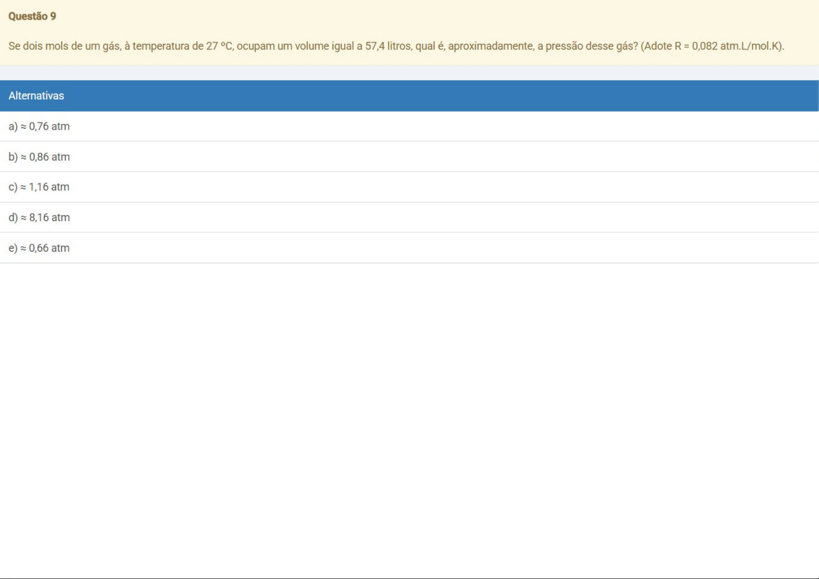 Questão 9 Se dois mols de um gás, à temperatura de ocupam um volume igual a 57,4 litros, qual é, aproximadamente, a pressão desse gás? (Adote R = 0,082 atm.L/mol.K). Alternativas a) ≈ 0,76 atm b) ≈ 0,86 atm c) ≈ 1,16 atm d) ≈ 8,16 atm e) ≈ 0,66 atm