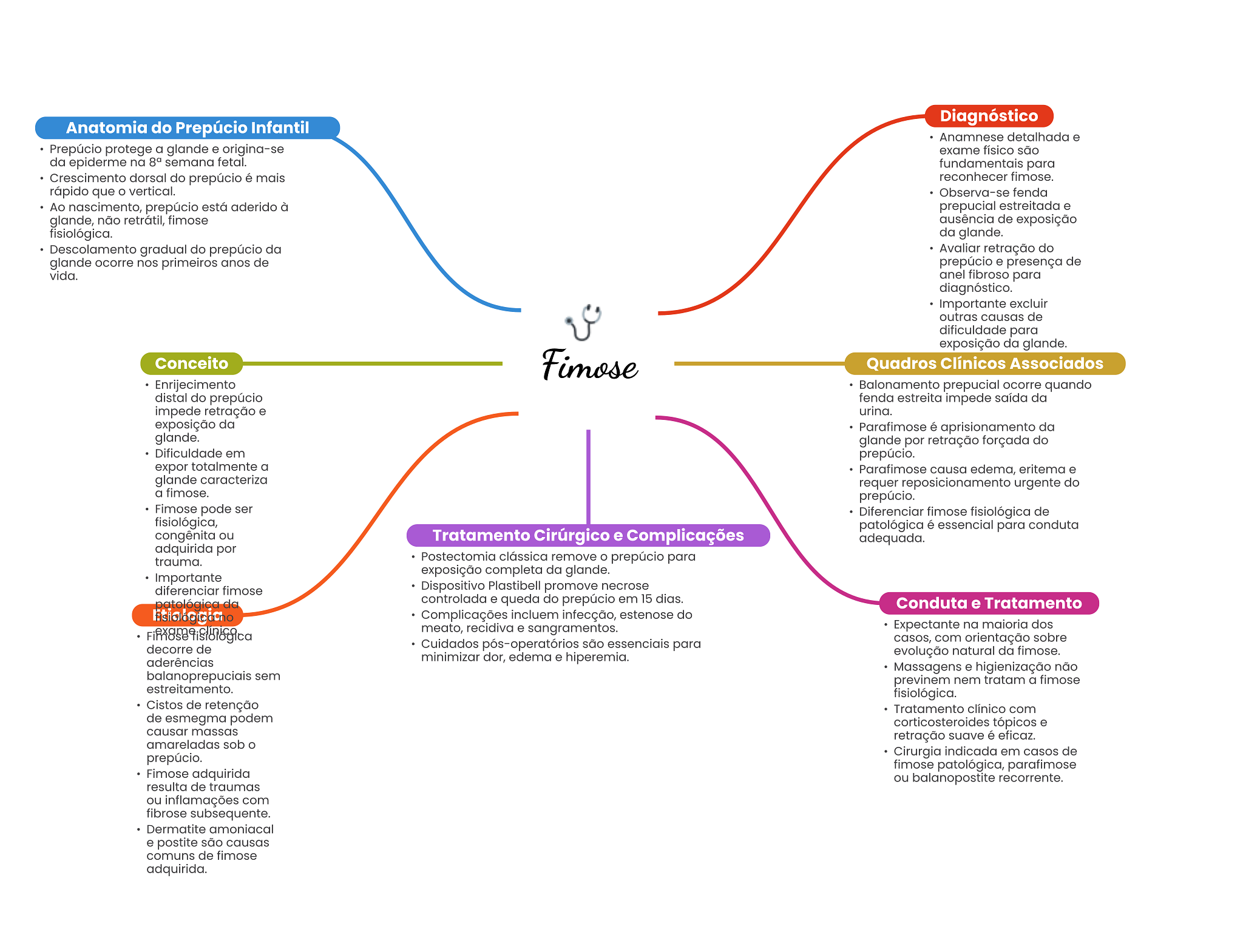 Diagnóstico Anatomia do Prepúcio Infantil Anamnese detalhada e Prepúcio protege a glande e origina-se exame físico são da epiderme na semana fetal. fundamentais para Crescimento dorsal do prepúcio é mais reconhecer fimose. rápido que vertical. Observa-se fenda Ao nascimento, prepúcio está aderido à prepucial estreitada e glande, não retrátil, fimose ausência de exposição fisiológica. da glande. Descolamento gradual do prepúcio da Avaliar retração do glande ocorre nos primeiros anos de prepúcio e presença de vida. anel fibroso para diagnóstico. Importante excluir outras causas de dificuldade para exposição da glande. Conceito Fimose Quadros Clínicos Associados Enrijecimento Balonamento prepucial ocorre quando distal do prepúcio fenda estreita impede saída da impede retração e urina. exposição da Parafimose é aprisionamento da glande. glande por retração forçada do Dificuldade em prepúcio. expor totalmente a Parafimose causa edema, eritema e glande caracteriza requer reposicionamento urgente do a fimose. prepúcio. Fimose pode ser Diferenciar fimose fisiológica de fisiológica, patológica é essencial para conduta congênita ou Tratamento Cirúrgico e Complicações adequada. adquirida por trauma. Postectomia clássica remove prepúcio para exposição completa da glande. Importante diferenciar fimose Dispositivo Plastibell promove necrose patológica da controlada e queda do prepúcio em 15 dias. Conduta e Tratamento Complicações incluem infecção, estenose do meato, recidiva e sangramentos. Expectante na maioria dos Fimose fisiologica Cuidados pós-operatórios são essenciais para casos, com orientação sobre decorre de minimizar dor, edema e hiperemia. evolução natural da fimose. aderências Massagens e higienização não balanoprepuciais sem previnem nem tratam a fimose estreitamento. fisiológica. Cistos de retenção Tratamento clínico com de esmegma podem corticosteroides tópicos e causar massas retração suave é eficaz. amareladas sob prepúcio. Cirurgia indicada em casos de fimose patológica, parafimose Fimose adquirida ou balanopostite recorrente. resulta de traumas ou inflamações com fibrose subsequente. Dermatite amoniacal e postite são causas comuns de fimose adquirida.