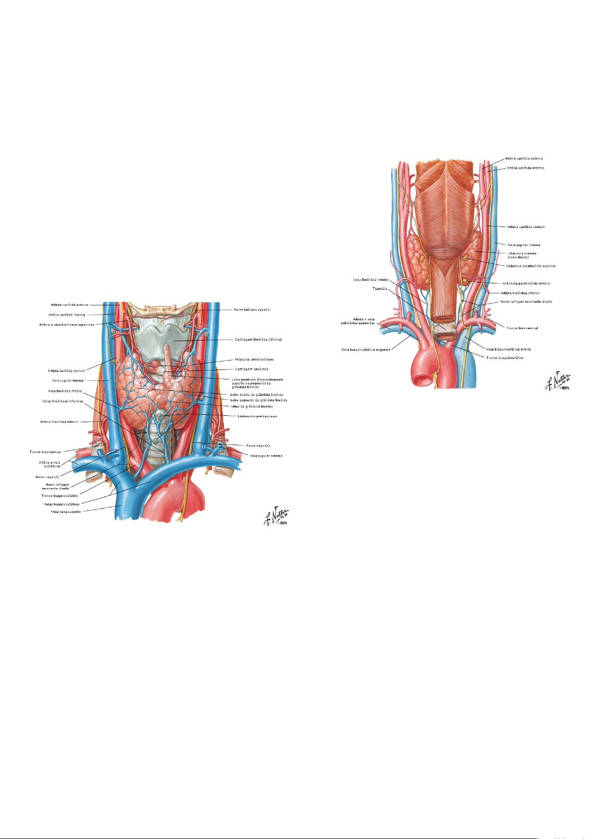 ANATOMIA DA TIREOIDE A Glândula Tireoide recebe esse nome porque “tireo” significa escudo e “oide” significa semelhante. Seu formato lembra um escudo ou uma borboleta. Ela é formada por 2 Lobos laterais, direito e esquerdo, unidos por uma faixa de tecido chamada istmo. O istmo geralmente cruza anteriormente o segundo ao quarto anel traqueal. Em cerca de 40% a 50% da população, pode existir um lobo adicional chamado Lobo Piramidal, que normalmente se projeta superiormente a partir do istmo ou de um dos lobos, representando um remanescente embrionário do ducto tireoglosso. A tireoide localiza-se na região anterior e inferior do pescoço, profundamente aos músculos infra- hióideos. Situa-se logo abaixo da Cartilagem Tireoidea, popularmente conhecida como “pomo de Adão”, e envolve parcialmente a Traqueia e a Cartilagem Cricoidea. Os dois terços inferiores dos lobos tireoidianos estão em contato com a traqueia, enquanto a porção superior relaciona-se mais intimamente com a cartilagem cricoide e com a laringe. SINTOPIA Anteriormente, ela é recoberta pela pele, tecido subcutâneo, fáscia cervical e músculos infra- hióideos, principalmente os músculos esterno- hióideo, esternotireóideo e omo-hióideo. Posteriormente, cada lobo apresenta relação com o esôfago, especialmente do lado esquerdo, e com a bainha carotídea, que contém a Artéria Carótida Comum, a Veia Jugular Interna e o Nervo Vago. Na face posterior da tireoide localizam-se as quatro Glândulas Paratireoides, geralmente duas superiores e duas inferiores. Além disso, o nervo laríngeo recorrente ascende próximo à face posterior da glândula, em íntima relação com a artéria tireoidiana inferior. Essa relação é extremamente importante em cirurgias tireoidianas, pois lesões nesse nervo podem causar rouquidão, disfonia ou até paralisia das pregas vocais. Devido à sua proximidade com a traqueia e o esôfago, aumentos da tireoide, como bócios ou nódulos volumosos, podem causar disfagia, sensação de compressão cervical, tosse e dificuldade respiratória. VASCULARIZAÇÃO Sua irrigação principal ocorre por meio da Artéria Tireoidiana Superior, ramo da artéria carótida externa, e da Artéria Tireoidiana Inferior, ramo do tronco tireocervical da artéria subclávia. A artéria tireoidiana superior encontra-se próxima ao ramo externo do nervo laríngeo superior. Já a artéria tireoidiana inferior possui íntima relação com o nervo laríngeo recorrente. Em algumas pessoas pode existir ainda a Artéria Tireoidiana Ima, uma variação anatômica que surge do tronco braquiocefálico ou do arco da aorta e irriga o istmo. A drenagem venosa é realizada pelas veias tireoidianas superior, média e inferior. As veias tireoidianas superior e média drenam para a veia jugular interna, enquanto as veias tireoidianas inferiores drenam principalmente para a veia braquiocefálica esquerda. A drenagem linfática da tireoide ocorre para linfonodos cervicais profundos, pré-traqueais, paratraqueais e pré-laríngeos. INERVAÇÃO A tireoide recebe inervação autonômica simpática e parassimpática. A inervação simpática vem dos gânglios cervicais superior, médio e inferior do tronco simpático cervical. Essas fibras acompanham os vasos sanguíneos e têm papel principalmente vasomotor, regulando o fluxo sanguíneo da glândula. A inervação parassimpática é proveniente do Nervo Vago, por meio dos nervos laríngeos superior e recorrente. Apesar dessa inervação autonômica, a atividade secretora da tireoide é controlada principalmente pelo TSH, e não diretamente pelos nervos. EMBRIOLOGIA A tireoide é a primeira glândula endócrina a surgir no embrião. Seu desenvolvimento começa por volta do 24º dia de vida intrauterina. Ela se origina de um espessamento endodérmico no assoalho da faringe primitiva, entre o primeiro e o segundo arcos faríngeos. Esse espessamento forma o divertículo tireoidiano. Inicialmente, a tireoide localiza-se na base da língua, em uma região que posteriormente corresponderá ao forame cego. A partir daí, ela migra inferiormente pela linha média do pescoço até atingir sua posição. Durante essa migração, forma-se o ducto tireoglosso, estrutura transitória que normalmente desaparece. Quando isso não ocorre, podem permanecer remanescentes embrionários que originam cistos ou fístulas do ducto tireoglosso. Também podem ocorrer casos de ectopia tireoidiana, em que tecido tireoidiano permanece fora de sua posição habitual. O exemplo mais comum é a tireoide lingual, localizada na base da língua. As células foliculares da tireoide originam-se do endoderma do divertículo tireoidiano. Já as células parafoliculares, ou células C, derivam dos corpos ultimobranquiais, estruturas originadas da quarta bolsa faríngea e associadas à migração de células da crista neural. HISTOLOGIA Do ponto de vista histológico, a Glândula Tireoide é classificada como uma glândula endócrina do tipo folicular, organizada em unidades esféricas chamadas folículos tireoidianos. Os folículos são considerados a unidade morfofuncional da tireoide. Eles apresentam tamanhos variáveis e são delimitados por uma única camada de células epiteliais foliculares apoiadas sobre uma lâmina basal. O epitélio folicular pode variar de acordo com o estado funcional da glândula: • Quando a glândula está pouco ativa, as células tendem a ser pavimentosas ou cúbicas baixas, e o folículo apresenta grande quantidade de coloide acumulado. • Quando a glândula está moderadamente ativa, o epitélio costuma ser cúbico simples. • Quando a glândula está muito ativa, as células tornam-se cilíndricas baixas, e a quantidade de coloide tende a diminuir devido à intensa utilização. O interior dos folículos é preenchido pelo coloide, uma substância eosinofílica rica em Tireoglobulina. Essa característica torna a tireoide uma glândula endócrina peculiar, pois ela é 